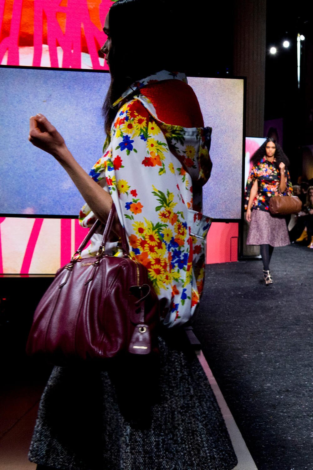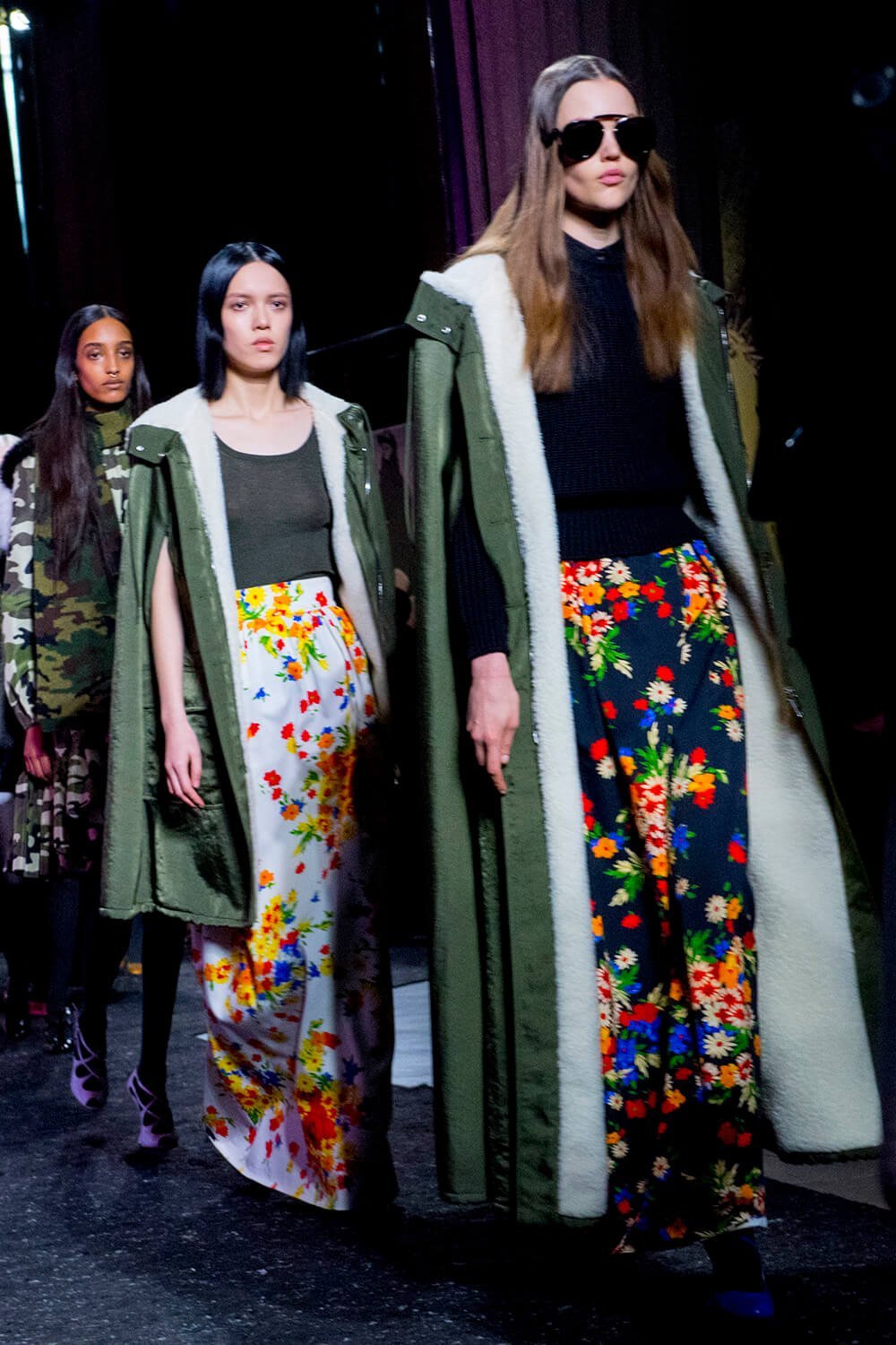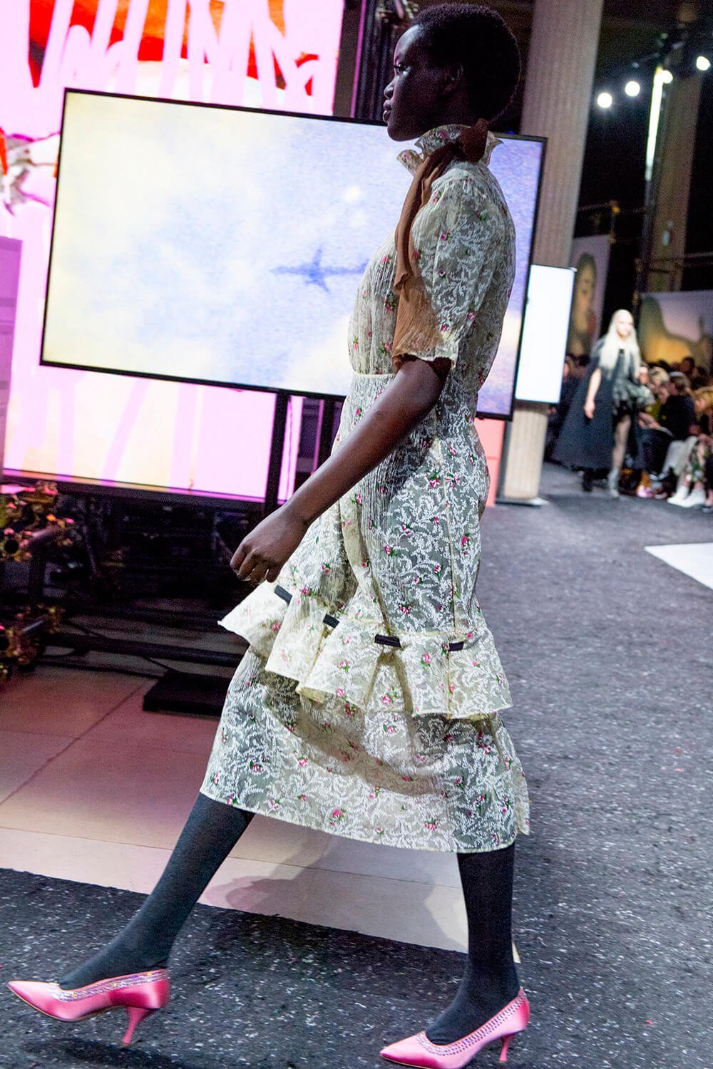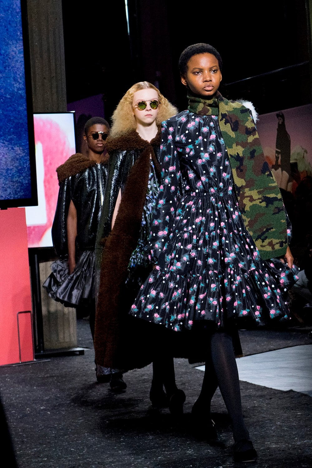 The work of the London-based artist and filmmaker Sharna Osborne filled TV and LED screens dotted around the Miu Miu show space in Paris, yesterday afternoon. Osborne’s work shifts between the moving image and the still: she creates freeze-frames and operates at the bleeding edge. Baby-dolls and black voile cap-sleeved dresses, your dad’s cardi and a camo-print fleece; just a handful of some serious heirloom sparkles and your gran’s bag. These were just a few of the normally disparate wardrobes of various women at various points in their lives brought together at Mrs Prada’s knockout Miu Miu show.