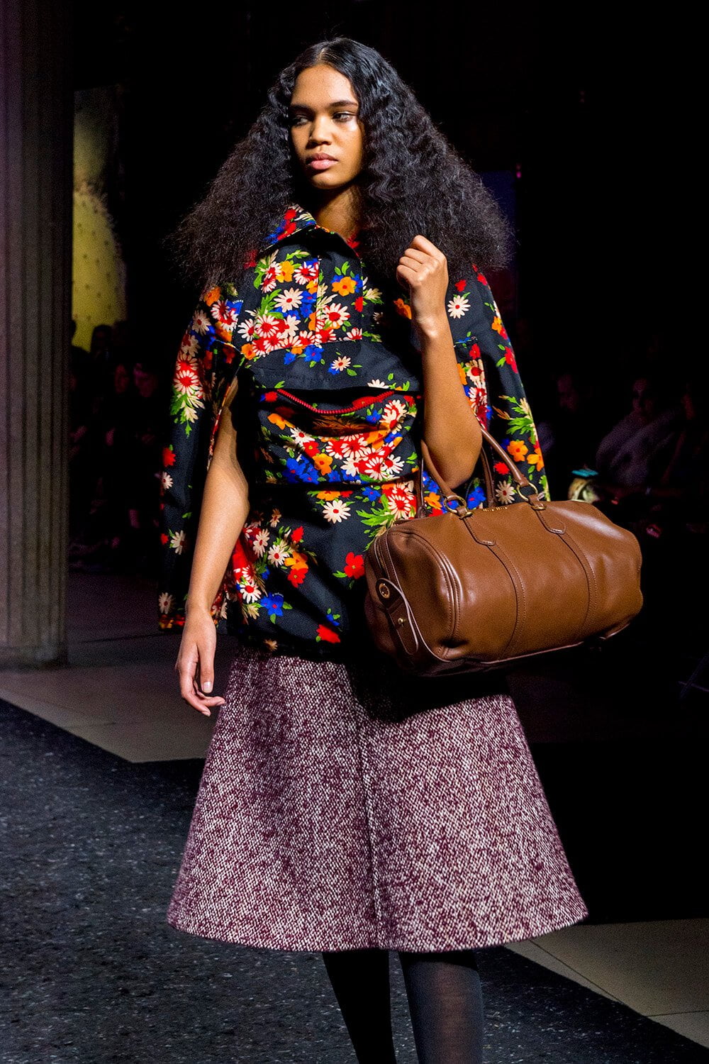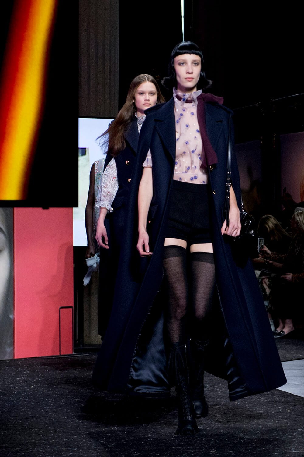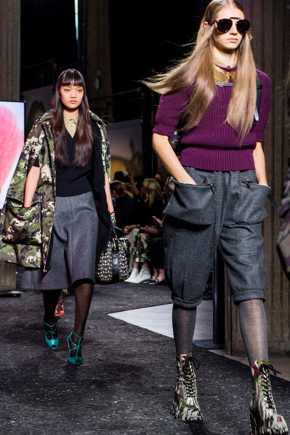 Who is this “time-hop” girl and where was she going? These were Miu Miu’s own freeze-frame moments: treasured pieces of clothing from back then and now, seemingly thrown together in some arbitrary act of guerrilla styling. But it was more considered than that. Mrs Prada is the weather vein of fashion: her ability to point out the direction of the hard-to-define headwinds – the next trends. For autumn? Well, granny just took a trip down Carnaby Street via the nearest and coolest festival. What a wonderful brain Mrs Prada has. It was a beautiful show.