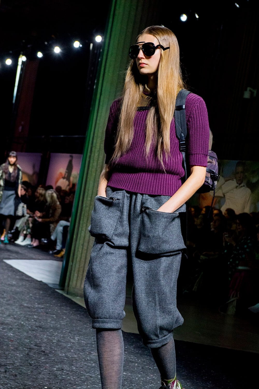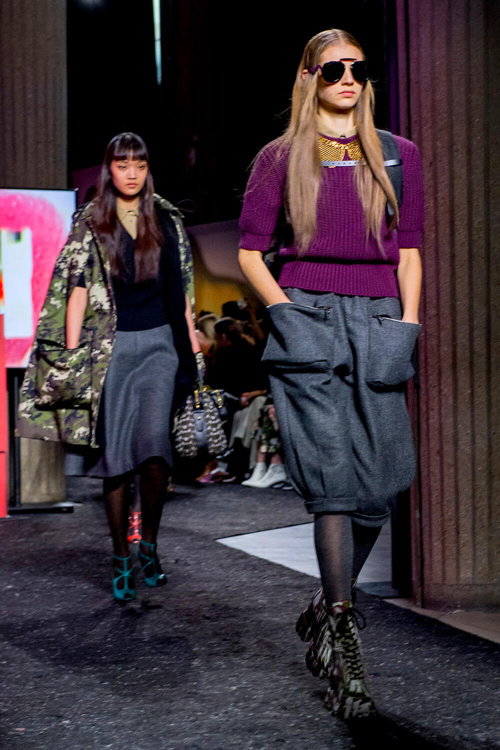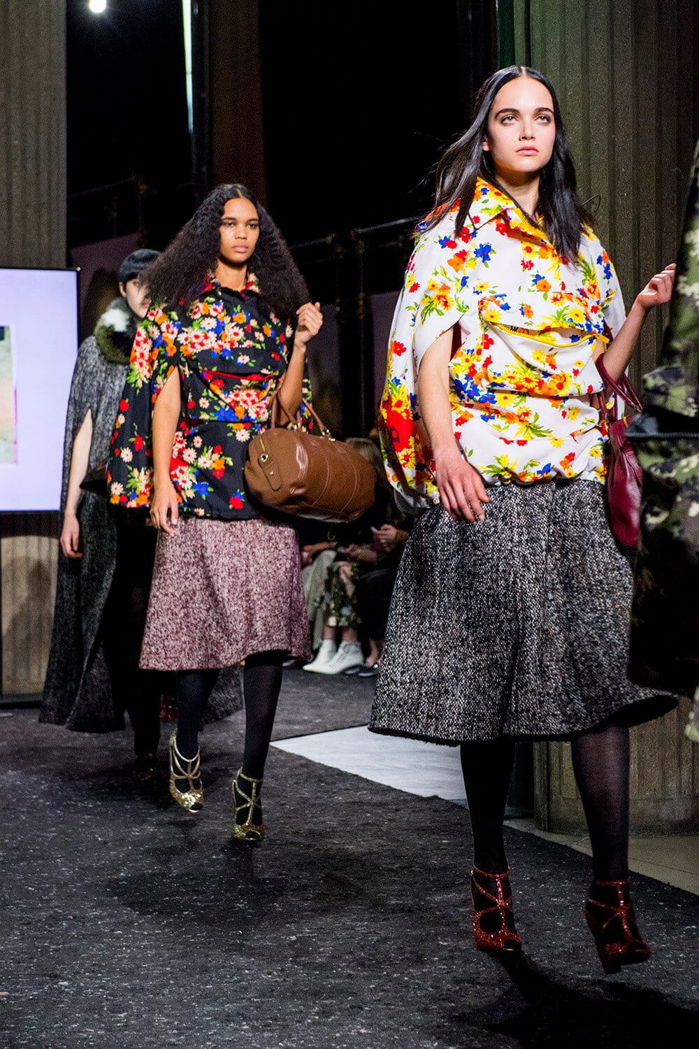 Who is this “time-hop” girl and where was she going? These were Miu Miu’s own freeze-frame moments: treasured pieces of clothing from back then and now, seemingly thrown together in some arbitrary act of guerrilla styling. But it was more considered than that. Mrs Prada is the weather vein of fashion: her ability to point out the direction of the hard-to-define headwinds – the next trends. For autumn? Well, granny just took a trip down Carnaby Street via the nearest and coolest festival. What a wonderful brain Mrs Prada has. It was a beautiful show.