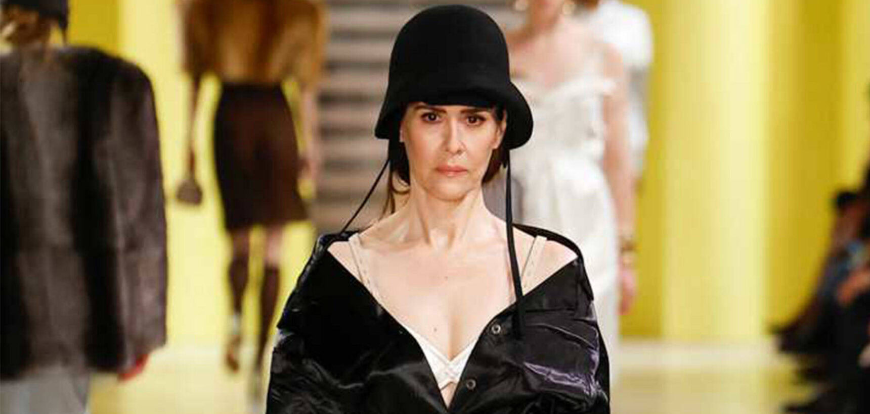 Sarah Paulson’s star turn in a black satin off-the-shoulder coat-dress and sheer grey knee socks and Mrs Prada herself, taking her bow in a loden green pencil skirt, matching fur-trimmed jacket and double strand of pearls proved that Miu Miu’s lady-like look isn’t just for the kids.