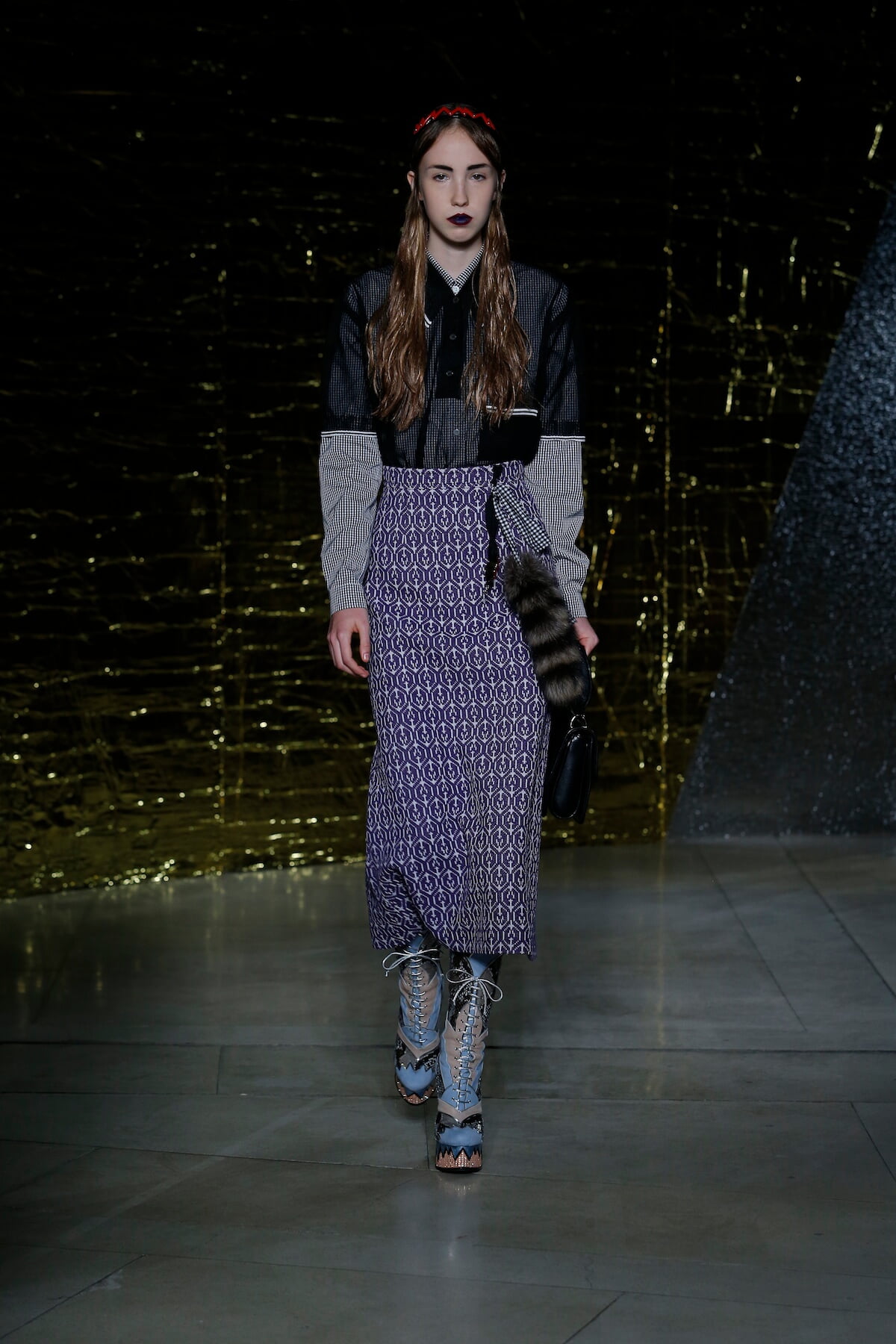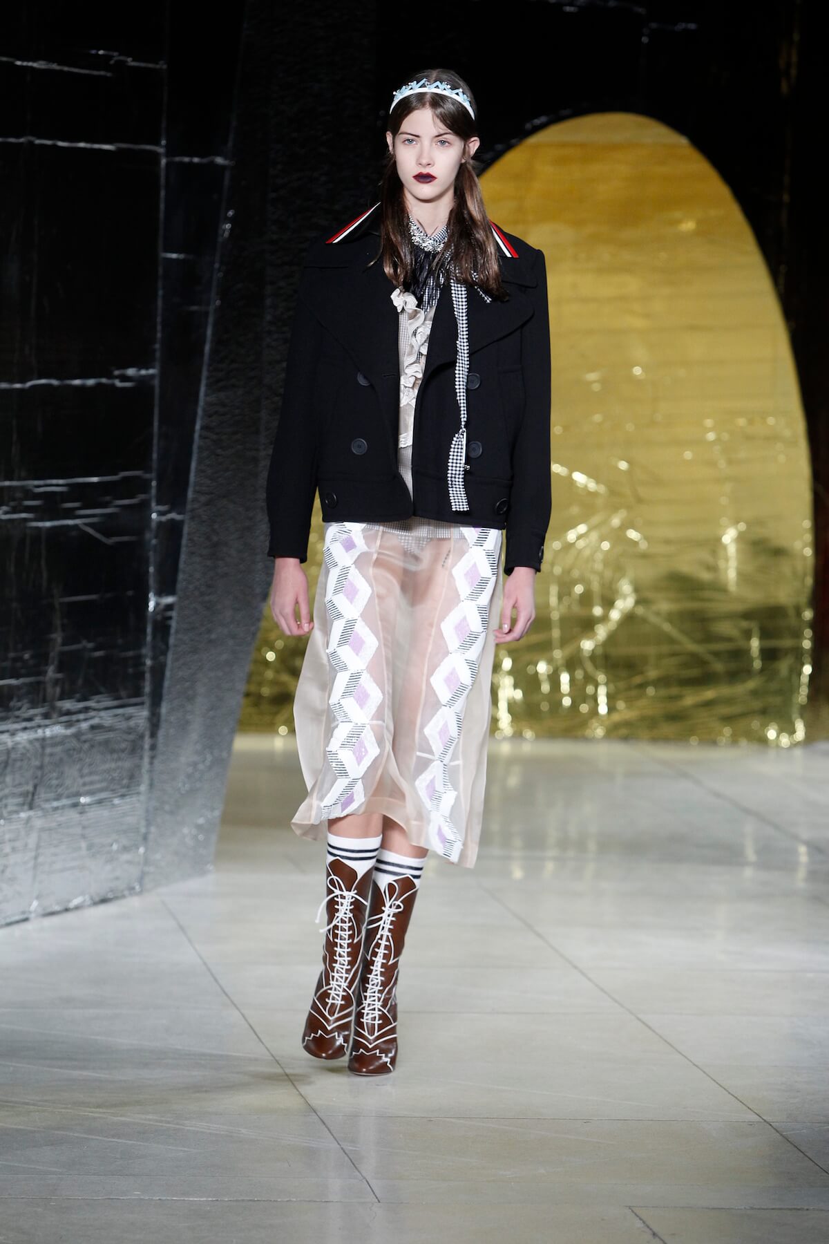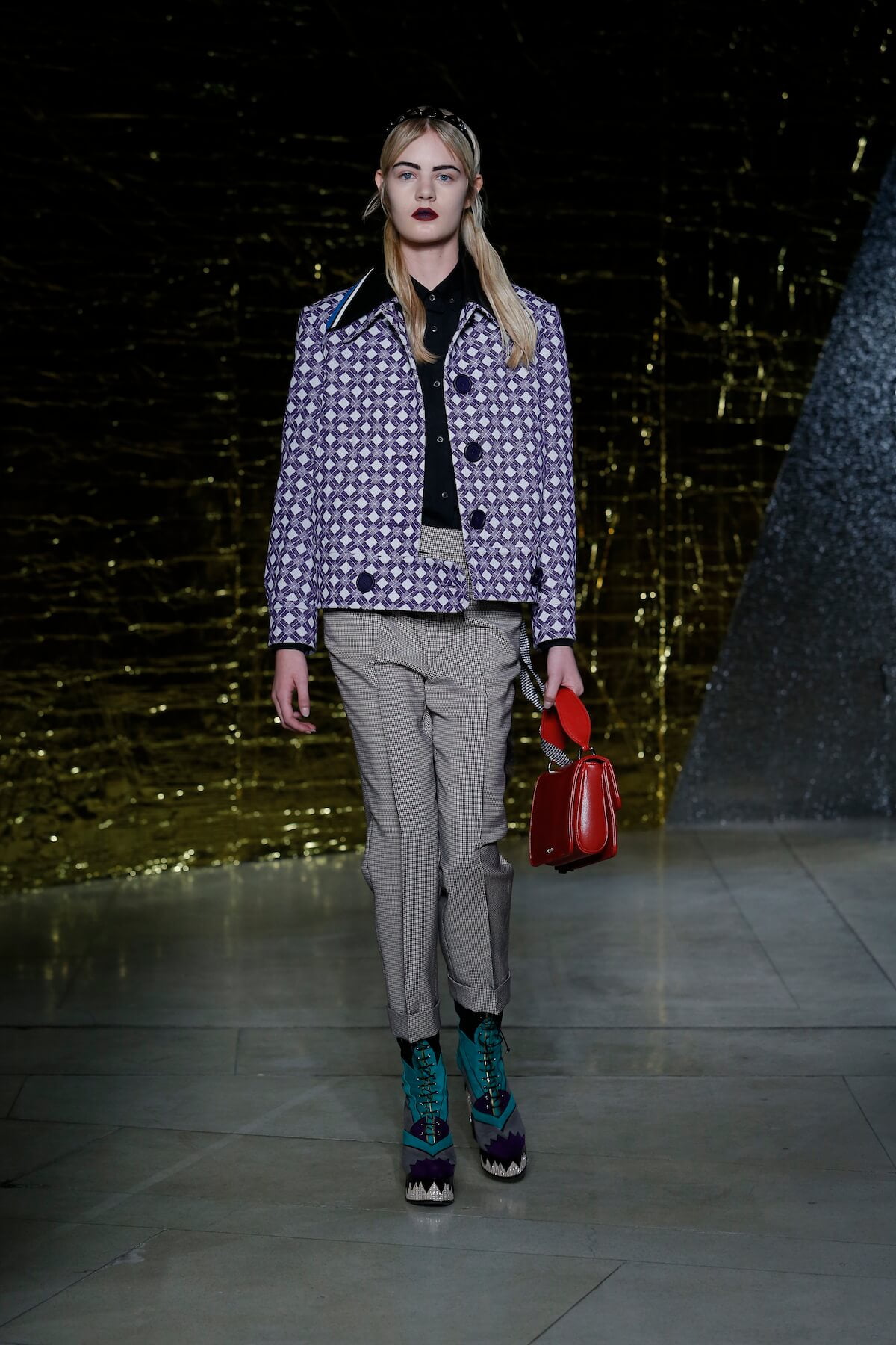 Miuccia Prada traditionally closes Paris with a party, via her Miu Miu show. It’s not a literal party – although they do serve drinks after, if you’re not legging it out to the 4.13 Eurostar and can stay a while. But rather there’s a party atmosphere to the clothes, thrown together, between Prada’s Milan show and this, in two weeks flat (Mrs Prada has stated that as fact). This time the party went a bit Abigail’s Party, with filmy negligees layered over strict tailoring, bottomed by stomping seventies-style snakeskin boots, a thunderbolt of crystal across the sturdy heel. This was Miu Miu in mix-up mode – it reminded me a bit of a cocktail, as in the actual drink not the party, throwing together disparate elements – a bit of tweed, some tailoring, jacquard coats in a sludgy Formica graphic – to make an intoxicating new whole. That’s always the deal with Mrs Prada, whatever the label attached to it. And as the closing statement on a stellar spring/summer season in Paris, it still managed to quench a thirst. An insatiable thirst for great clothes, whipped together into outfits that became great fashion. Get ready to see these ideas popping up all over come autumn/winter 2016. Which isn’t even that far away…