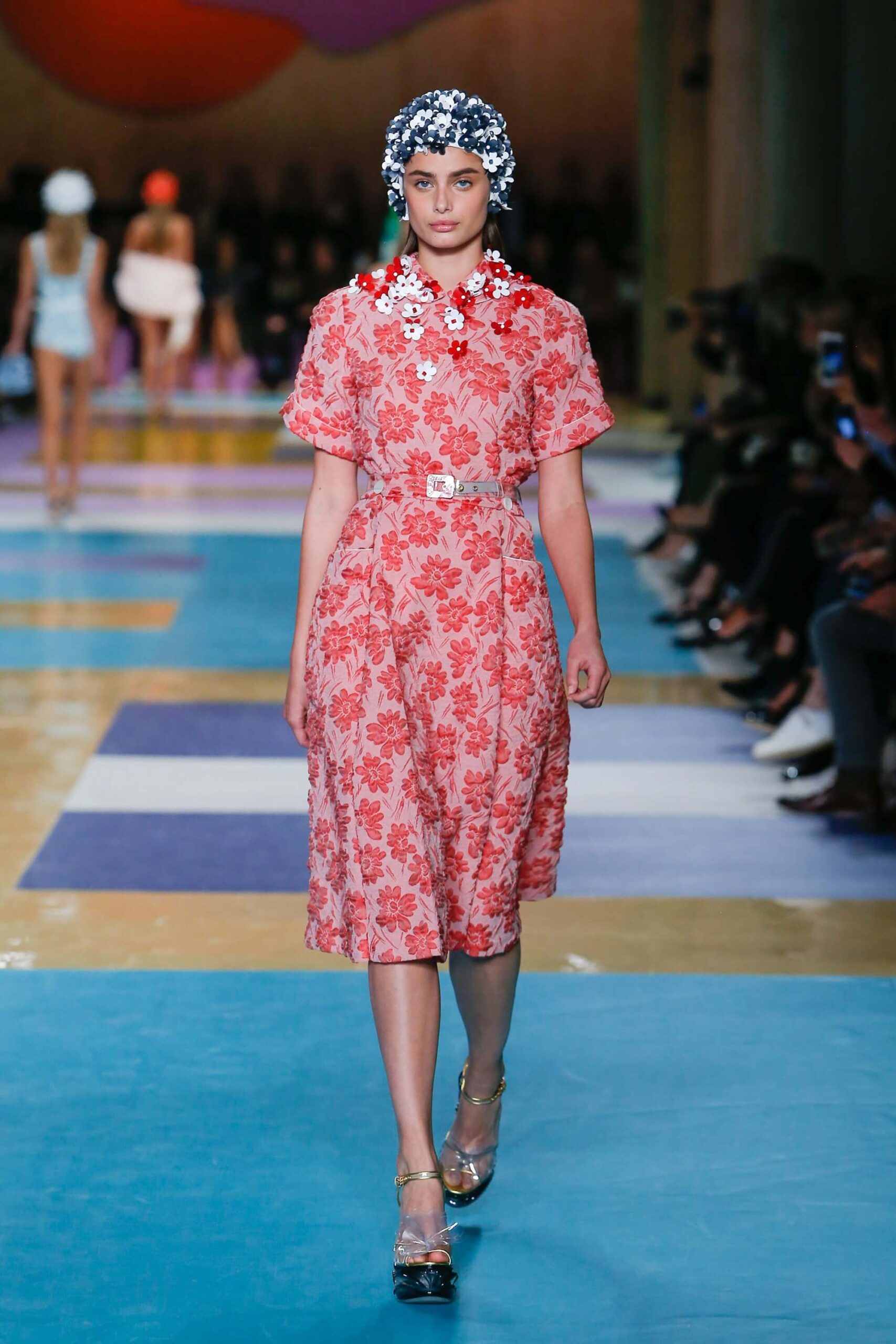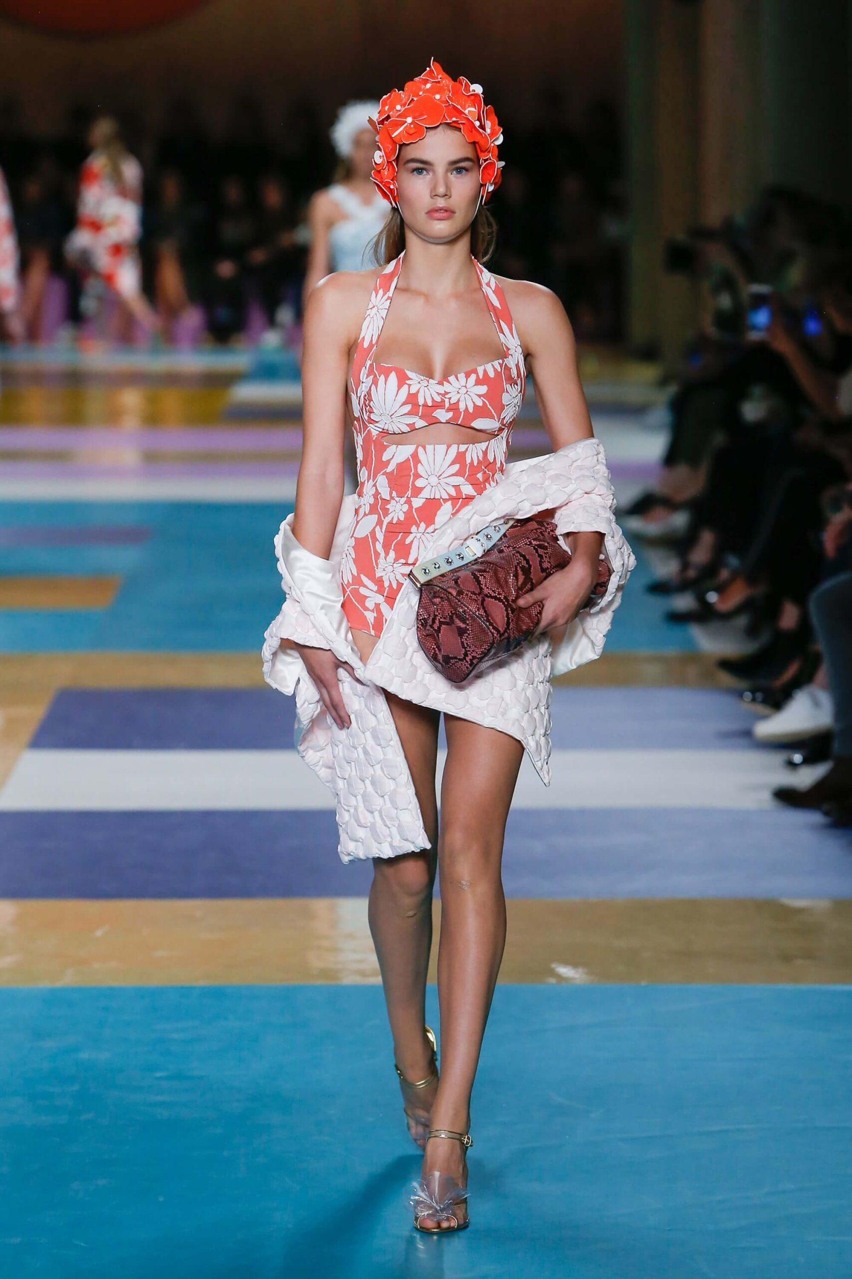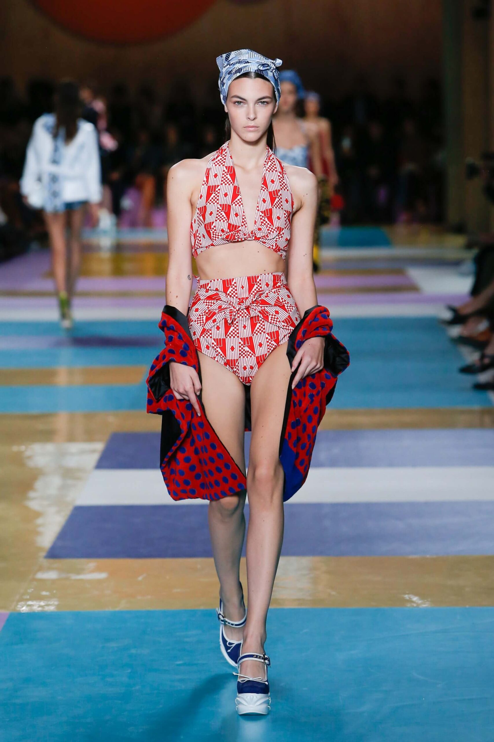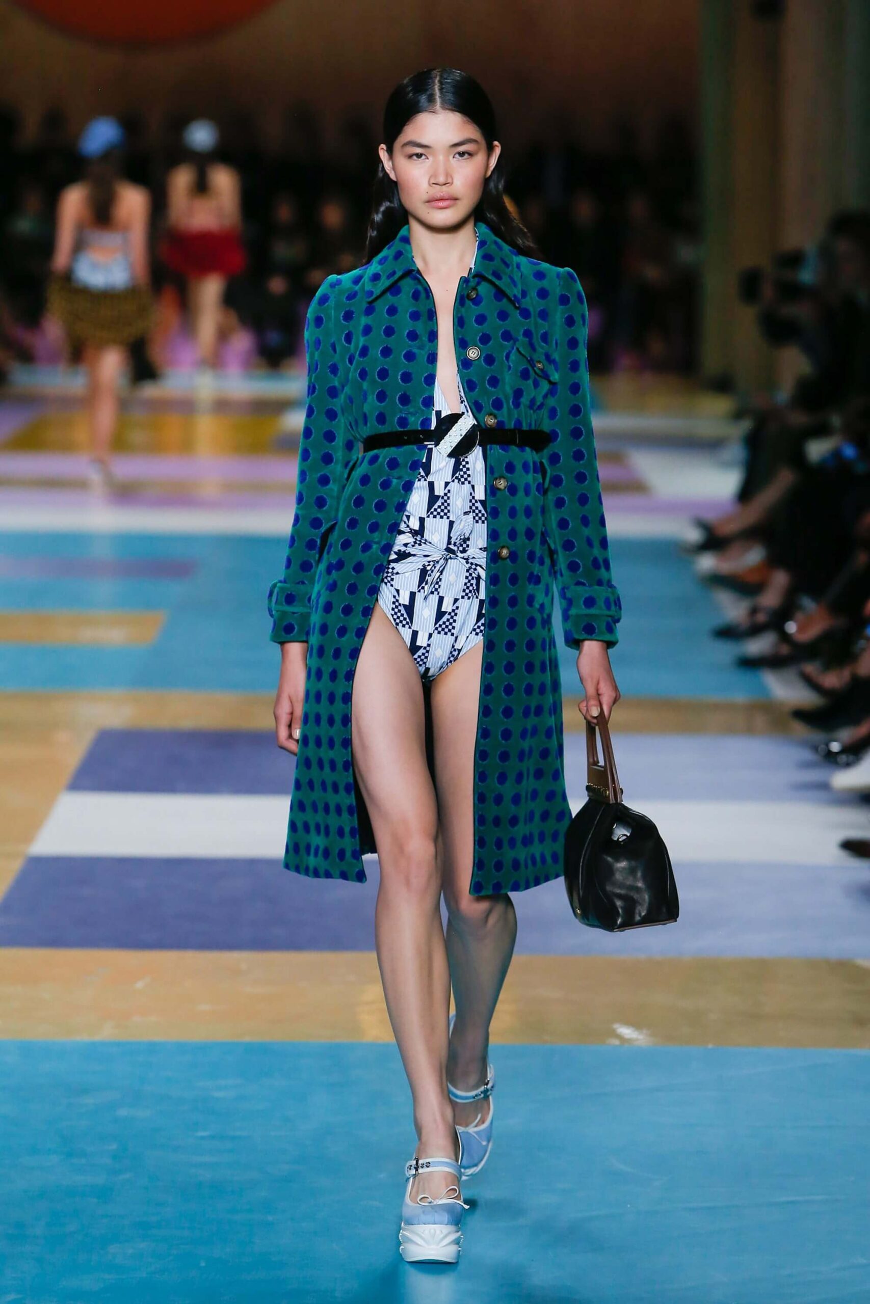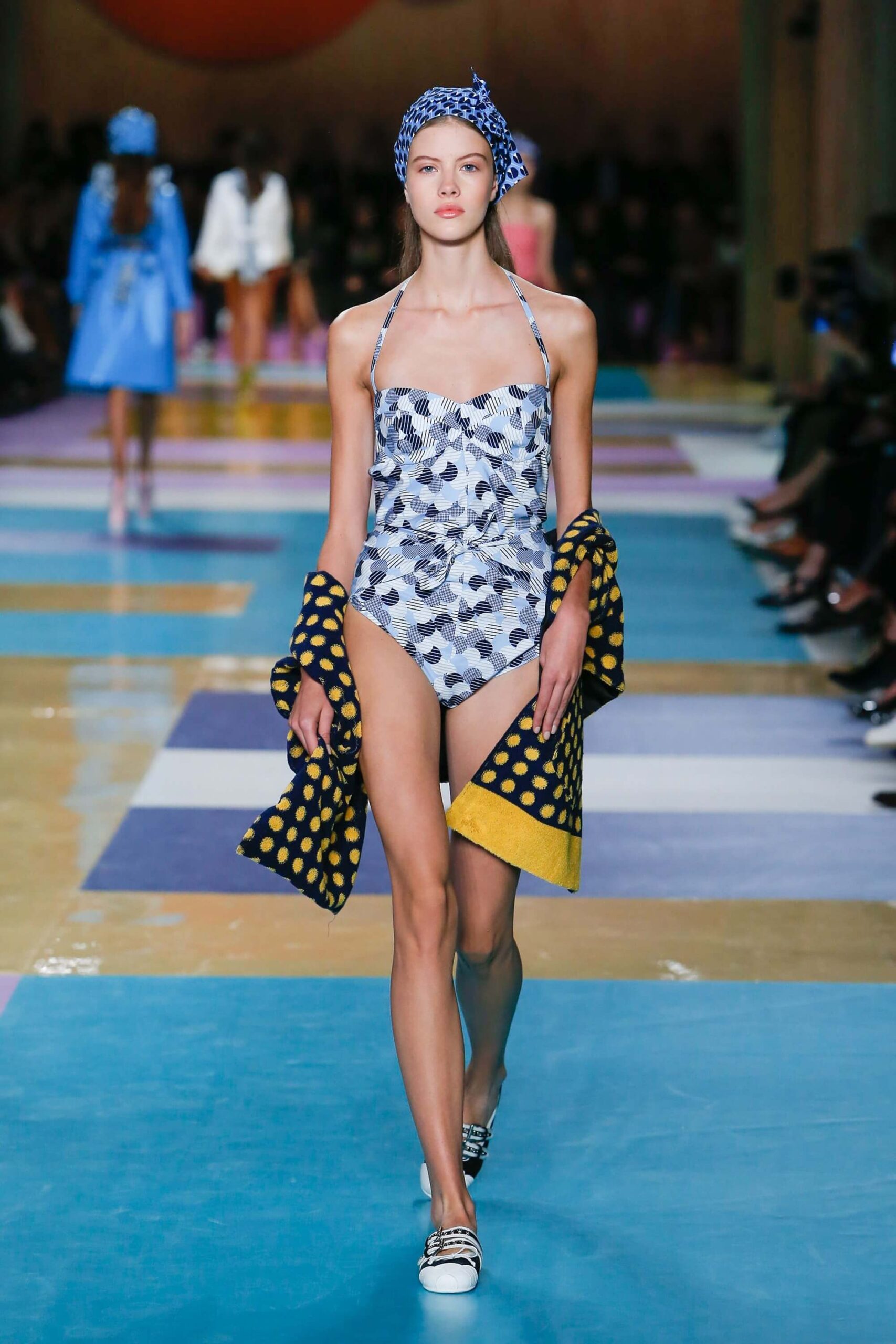 The Miu Miu crew took a trip to the beach. Well, it is Spring Summer. And so to the beach we went. Around us shapes decorated the plywood walls, a burnt orange circle burned bright and hot like the sun. Purples, whites and blues made up the clouds, a Miu Miu wonderland. And like any good wonderland it was vibrant and thrilling looking through this colour Kodachrome and this Polaroid film. It was a hot summer’s day at the beach, Miuccia style with sky blue patent leather coats and classic bold swirly ’70s printed day dresses. Bathing costumes and swimming hats like a Miu Miu synchronised swim team. It felt like an old school Hollywood pool party, or better still a Cinecitta one, so retro Rome yet something futuristic was happening. Gold platform sandals, optical prints and lozenges of ice cream colours. Totally hedonistic, good times, good vibes, high on colour and high on life. The Creatures oozed through the speakers, like a good golden honey: “Stranded on Venus sands.” There’s no better place to be stranded. This Miu Miu Wes-like wonderworld is where the magic happens.