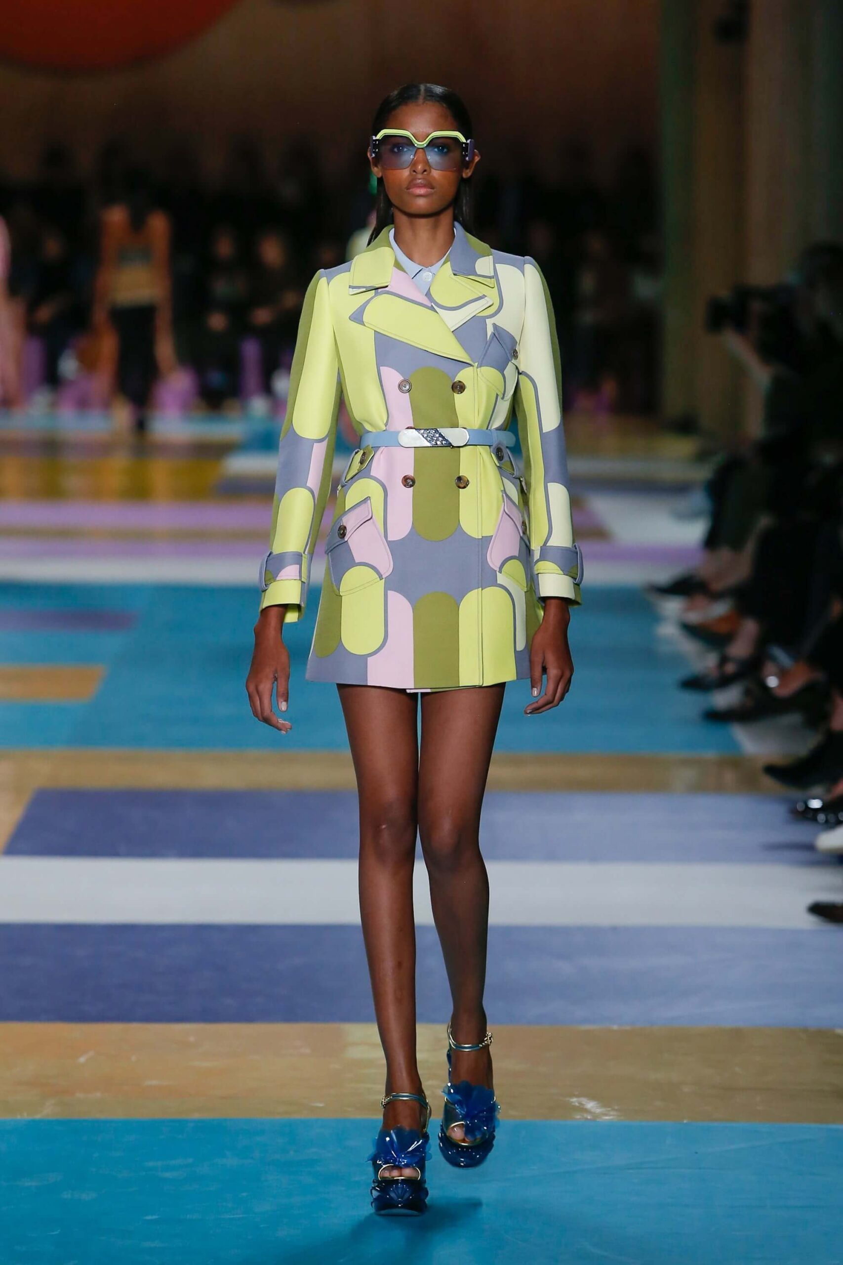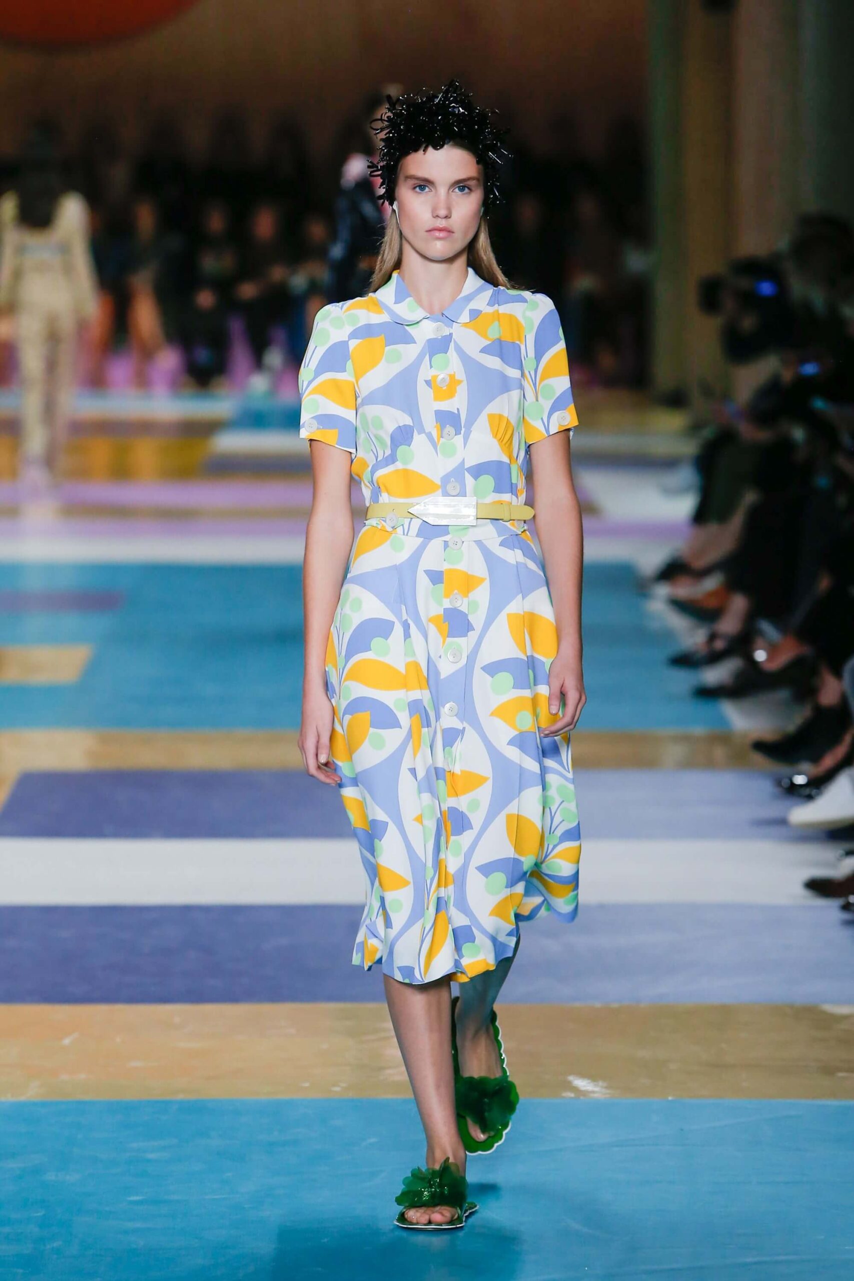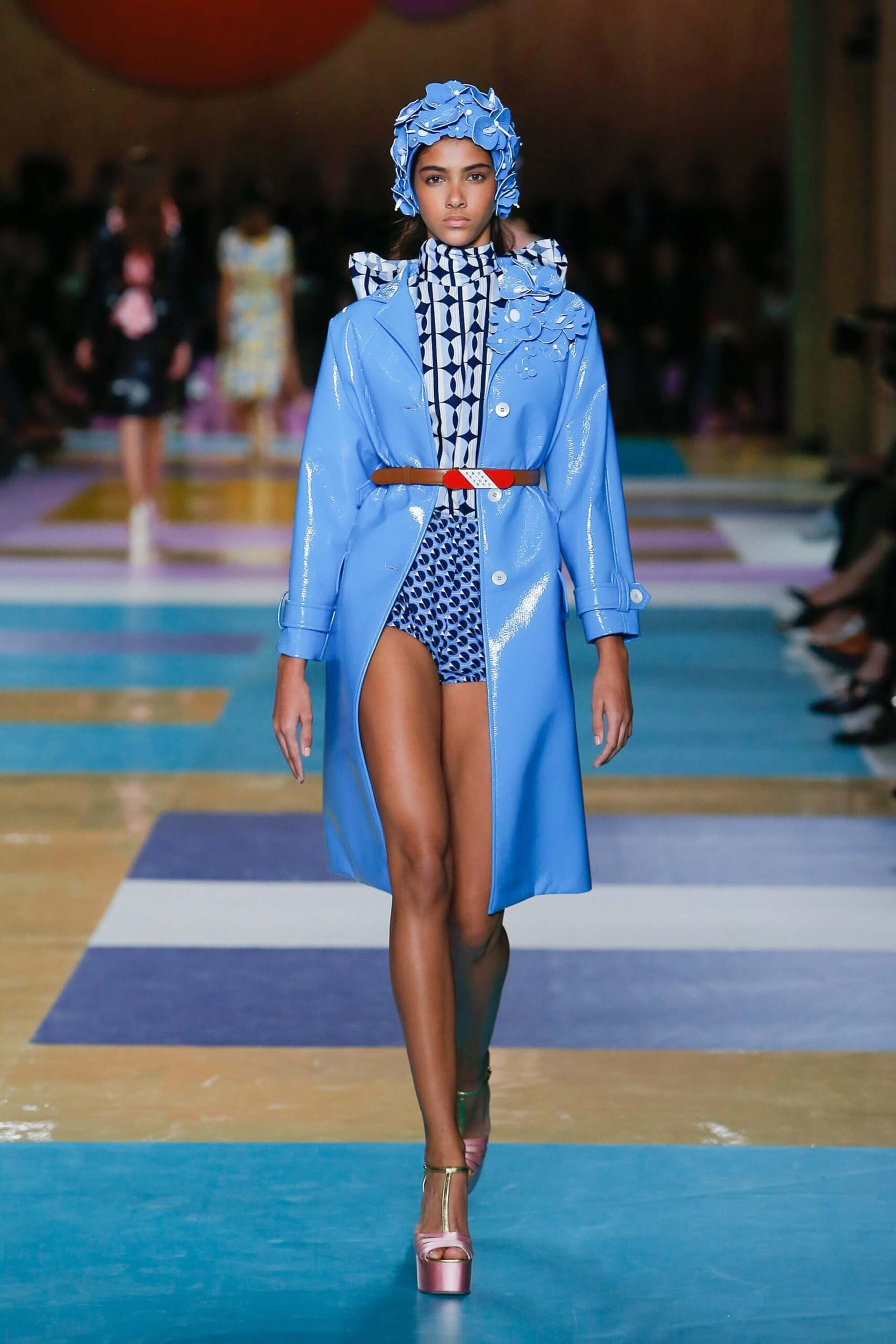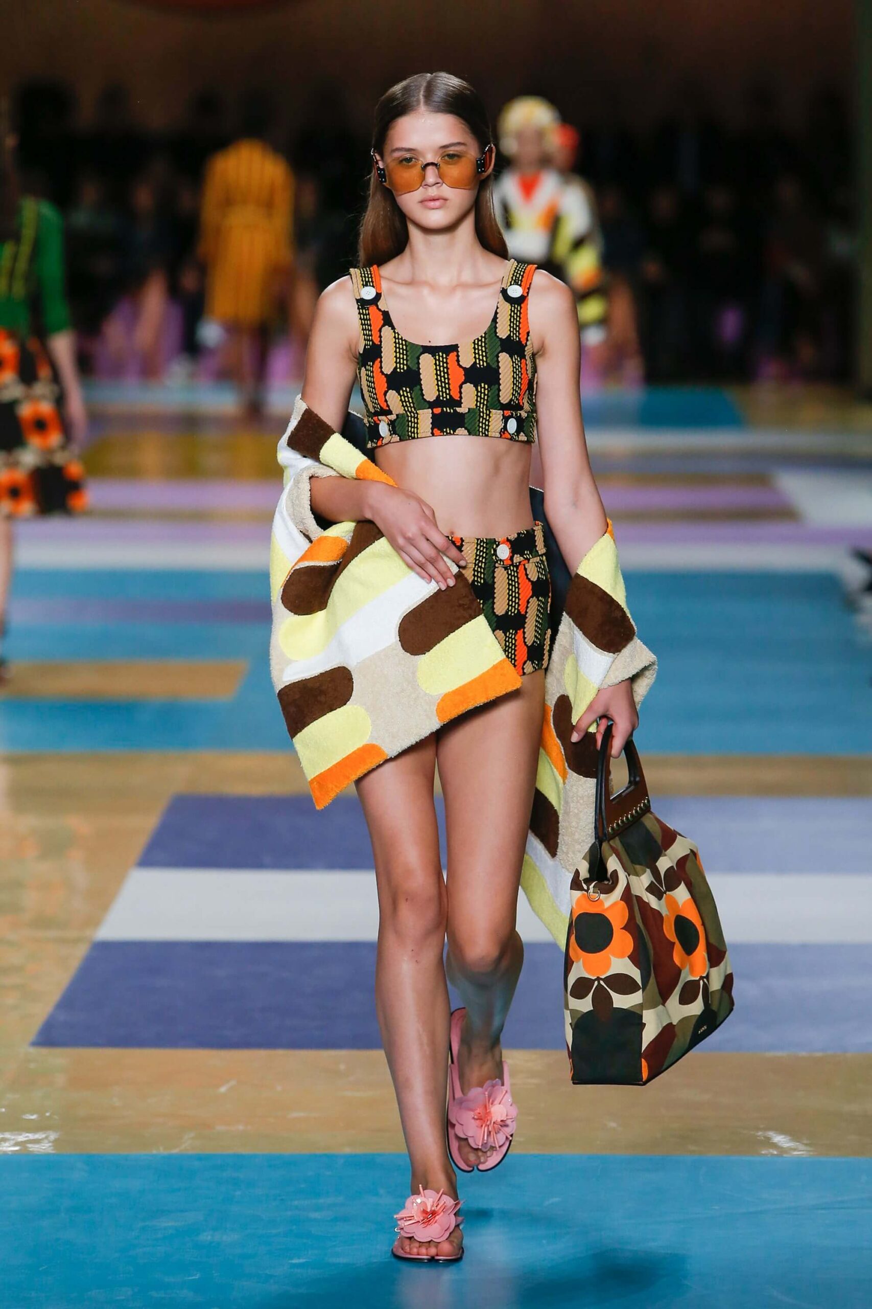 The Miu Miu crew took a trip to the beach. Well, it is Spring Summer. And so to the beach we went. Around us shapes decorated the plywood walls, a burnt orange circle burned bright and hot like the sun. Purples, whites and blues made up the clouds, a Miu Miu wonderland. And like any good wonderland it was vibrant and thrilling looking through this colour Kodachrome and this Polaroid film. It was a hot summer’s day at the beach, Miuccia style with sky blue patent leather coats and classic bold swirly ’70s printed day dresses. Bathing costumes and swimming hats like a Miu Miu synchronised swim team. It felt like an old school Hollywood pool party, or better still a Cinecitta one, so retro Rome yet something futuristic was happening. Gold platform sandals, optical prints and lozenges of ice cream colours. Totally hedonistic, good times, good vibes, high on colour and high on life. The Creatures oozed through the speakers, like a good golden honey: “Stranded on Venus sands.” There’s no better place to be stranded. This Miu Miu Wes-like wonderworld is where the magic happens.