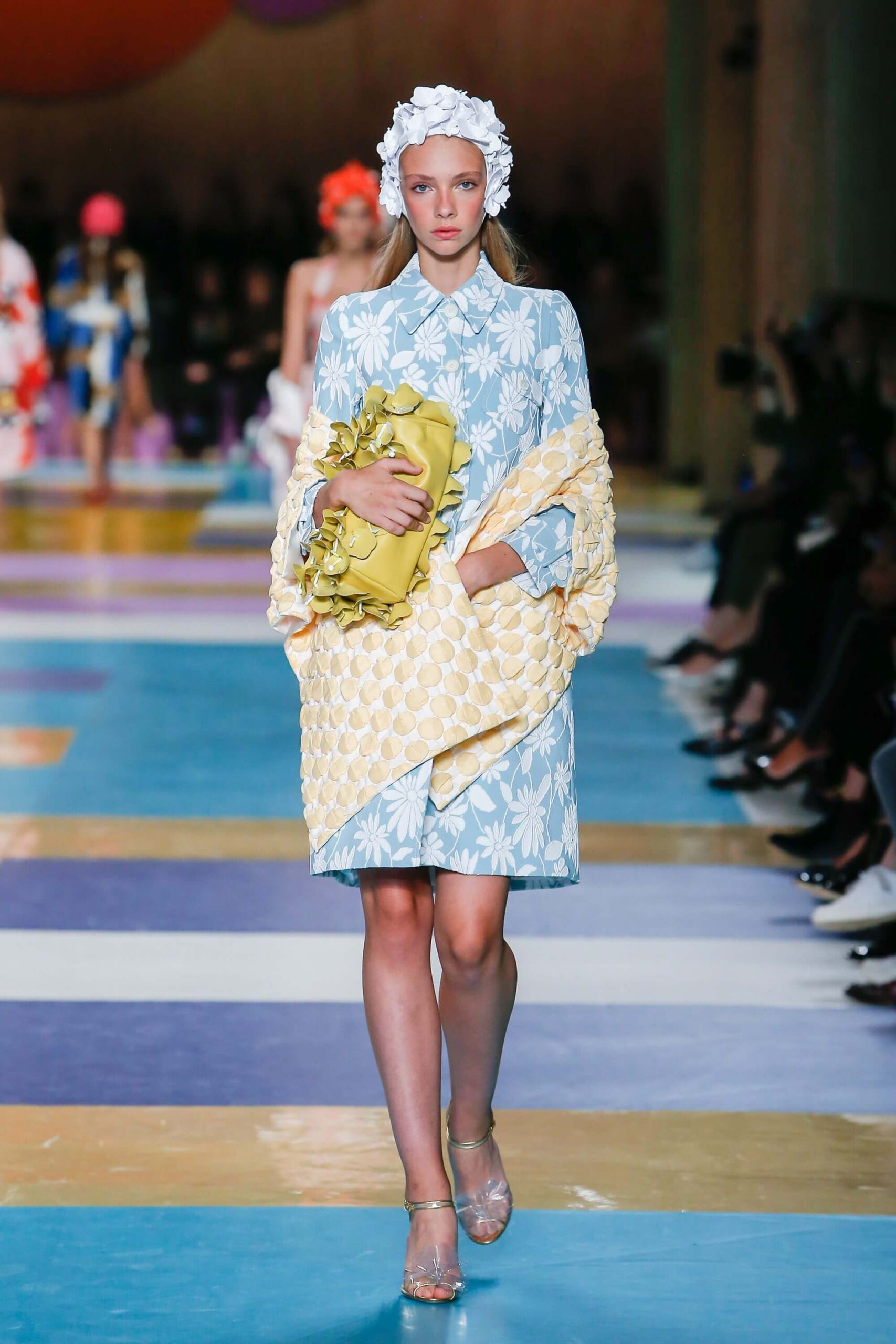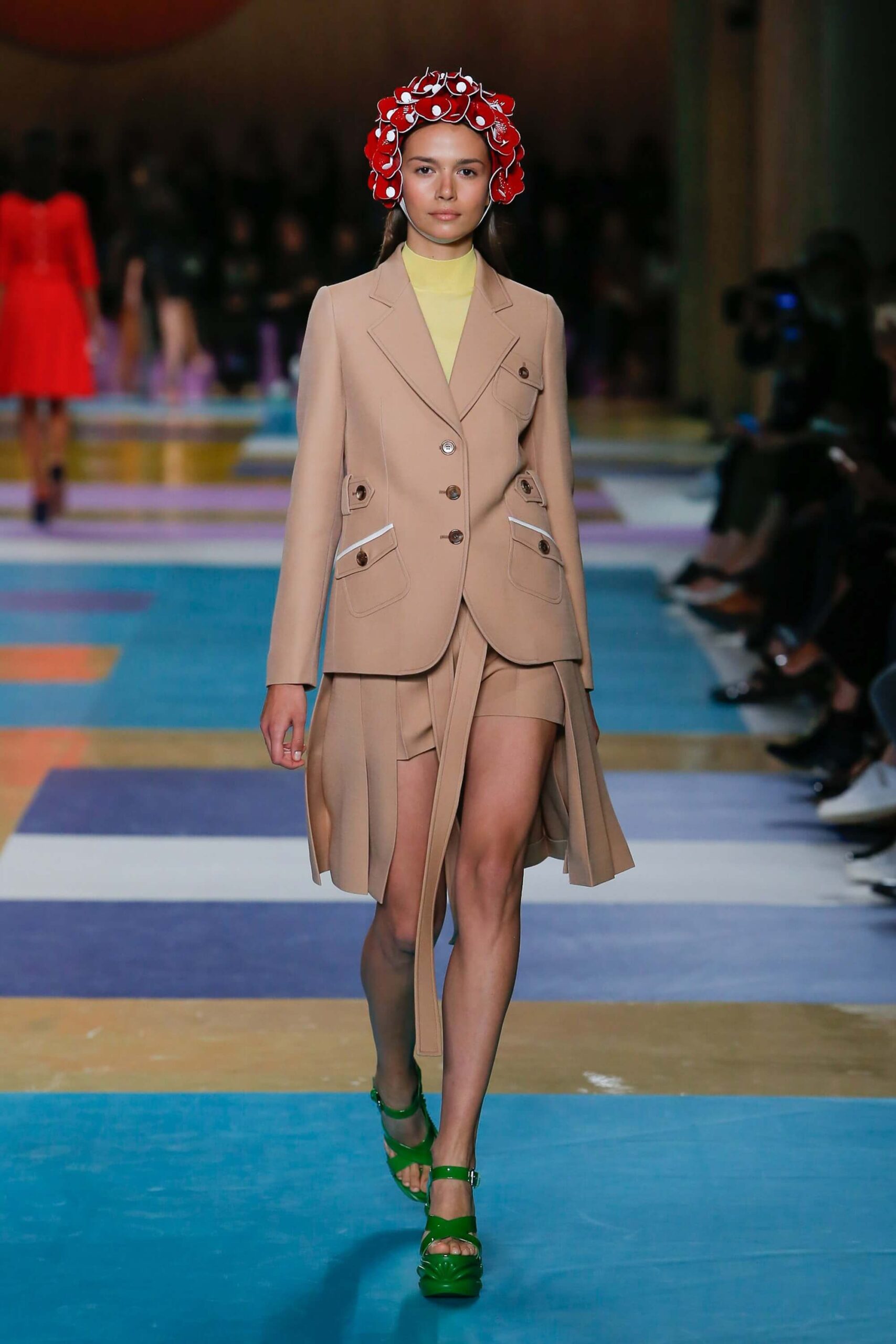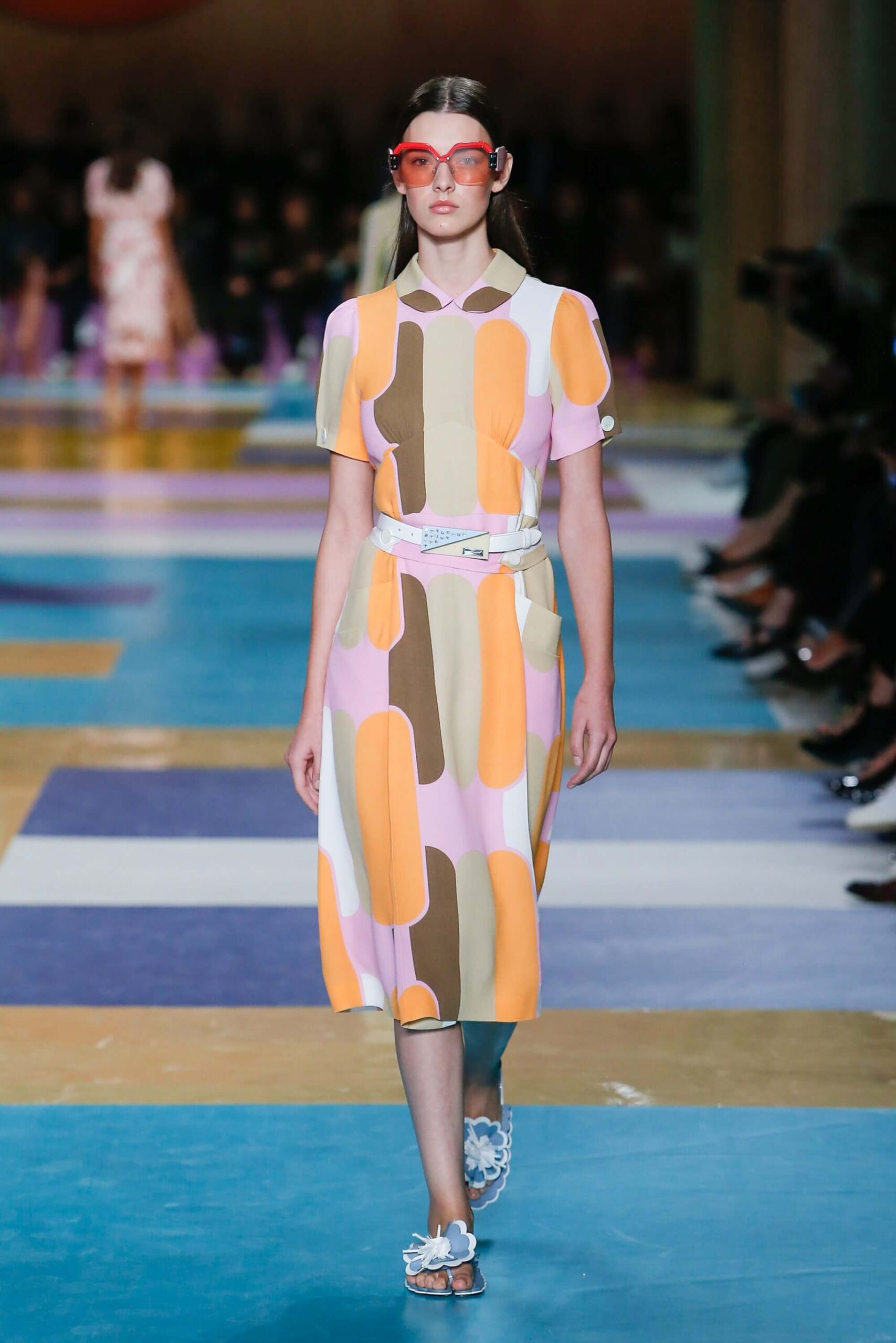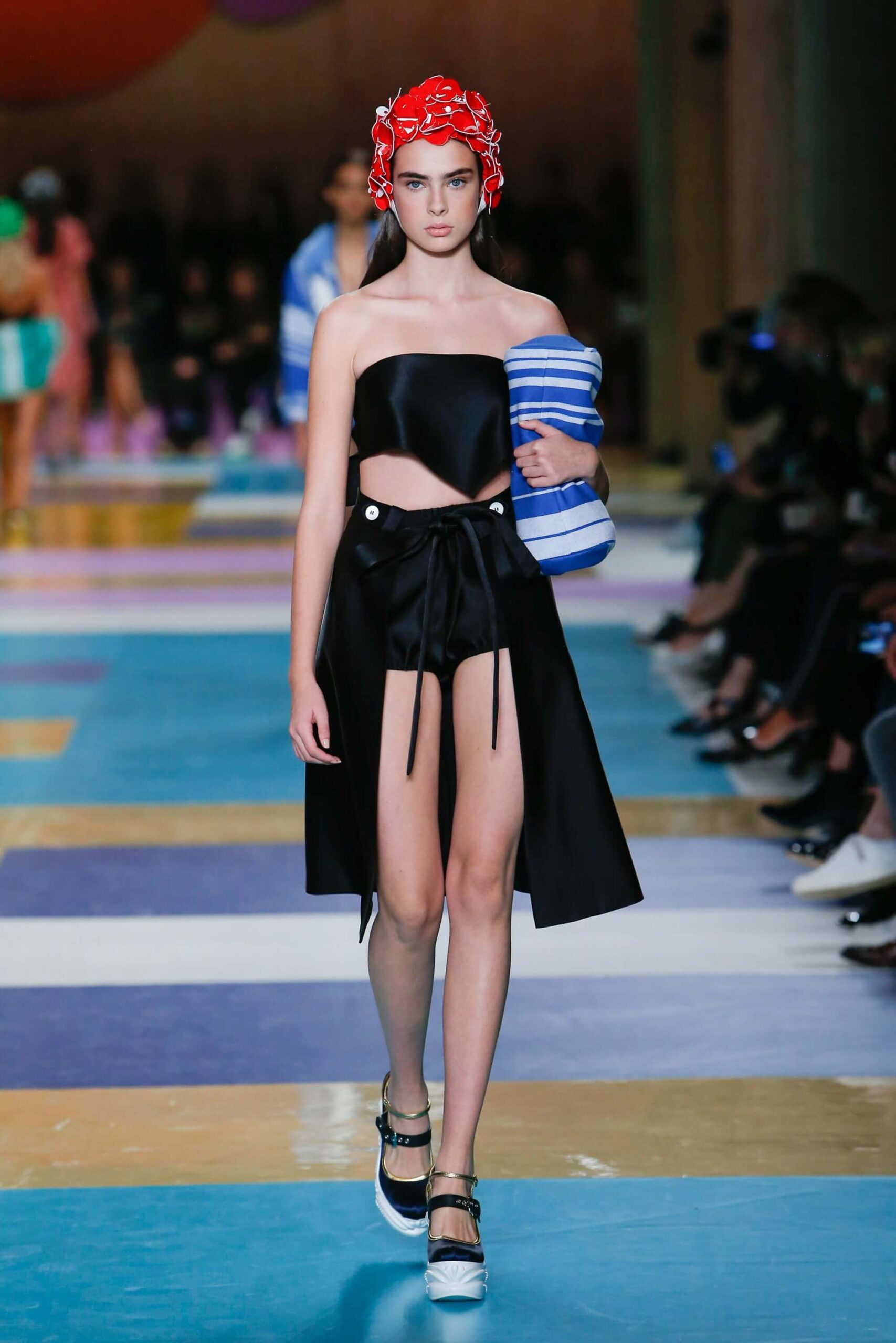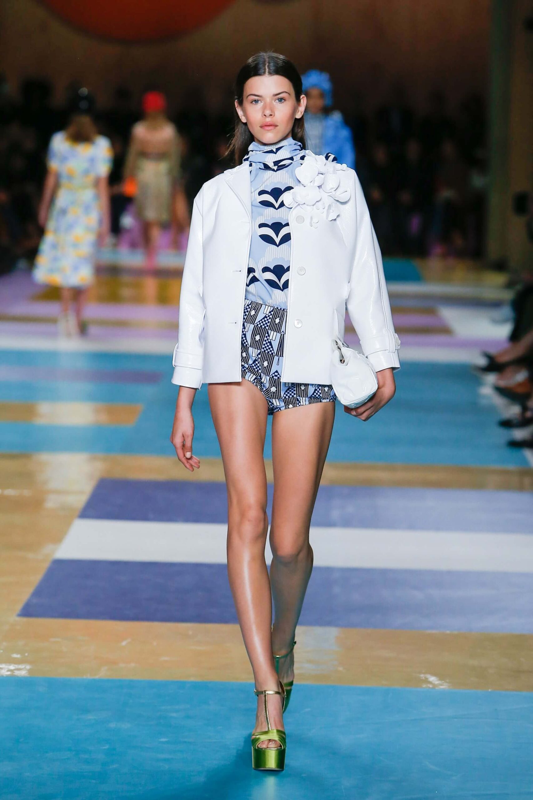 The Miu Miu crew took a trip to the beach. Well, it is Spring Summer. And so to the beach we went. Around us shapes decorated the plywood walls, a burnt orange circle burned bright and hot like the sun. Purples, whites and blues made up the clouds, a Miu Miu wonderland. And like any good wonderland it was vibrant and thrilling looking through this colour Kodachrome and this Polaroid film. It was a hot summer’s day at the beach, Miuccia style with sky blue patent leather coats and classic bold swirly ’70s printed day dresses. Bathing costumes and swimming hats like a Miu Miu synchronised swim team. It felt like an old school Hollywood pool party, or better still a Cinecitta one, so retro Rome yet something futuristic was happening. Gold platform sandals, optical prints and lozenges of ice cream colours. Totally hedonistic, good times, good vibes, high on colour and high on life. The Creatures oozed through the speakers, like a good golden honey: “Stranded on Venus sands.” There’s no better place to be stranded. This Miu Miu Wes-like wonderworld is where the magic happens.
