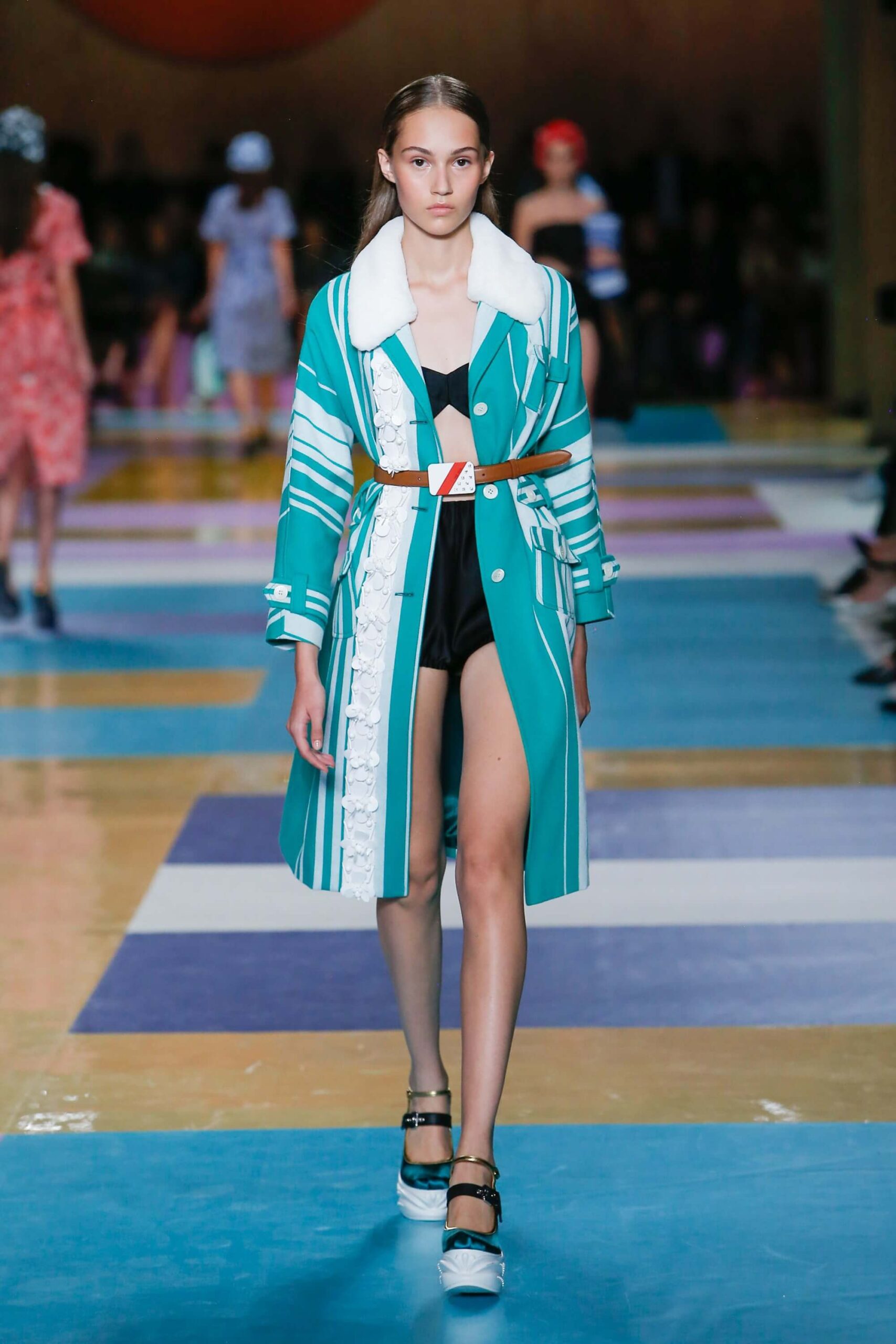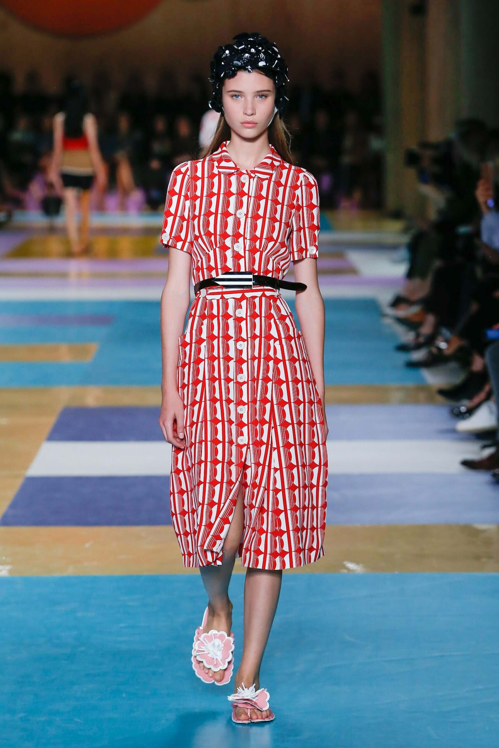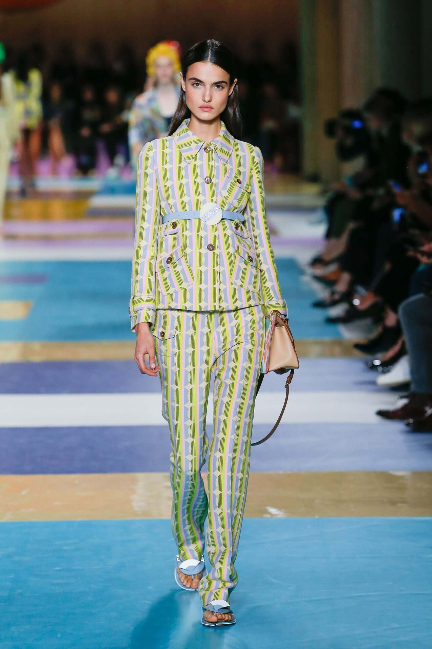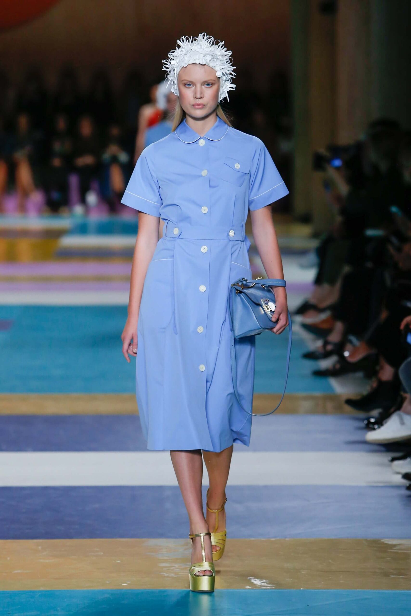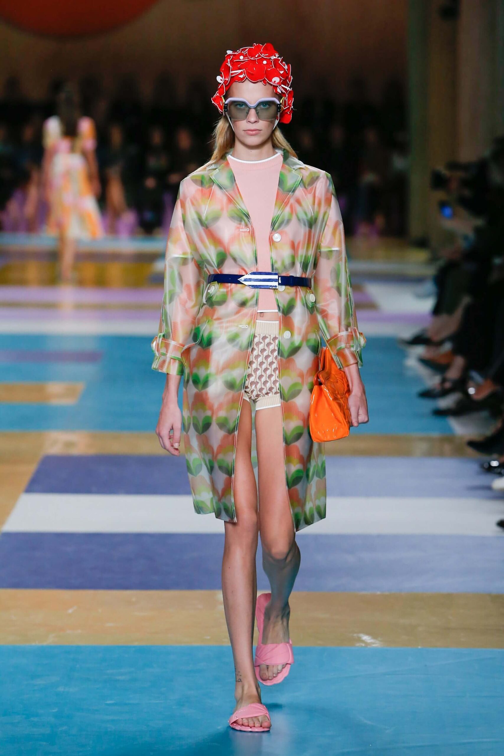 The Miu Miu crew took a trip to the beach. Well, it is Spring Summer. And so to the beach we went. Around us shapes decorated the plywood walls, a burnt orange circle burned bright and hot like the sun. Purples, whites and blues made up the clouds, a Miu Miu wonderland. And like any good wonderland it was vibrant and thrilling looking through this colour Kodachrome and this Polaroid film. It was a hot summer’s day at the beach, Miuccia style with sky blue patent leather coats and classic bold swirly ’70s printed day dresses. Bathing costumes and swimming hats like a Miu Miu synchronised swim team. It felt like an old school Hollywood pool party, or better still a Cinecitta one, so retro Rome yet something futuristic was happening. Gold platform sandals, optical prints and lozenges of ice cream colours. Totally hedonistic, good times, good vibes, high on colour and high on life. The Creatures oozed through the speakers, like a good golden honey: “Stranded on Venus sands.” There’s no better place to be stranded. This Miu Miu Wes-like wonderworld is where the magic happens.
