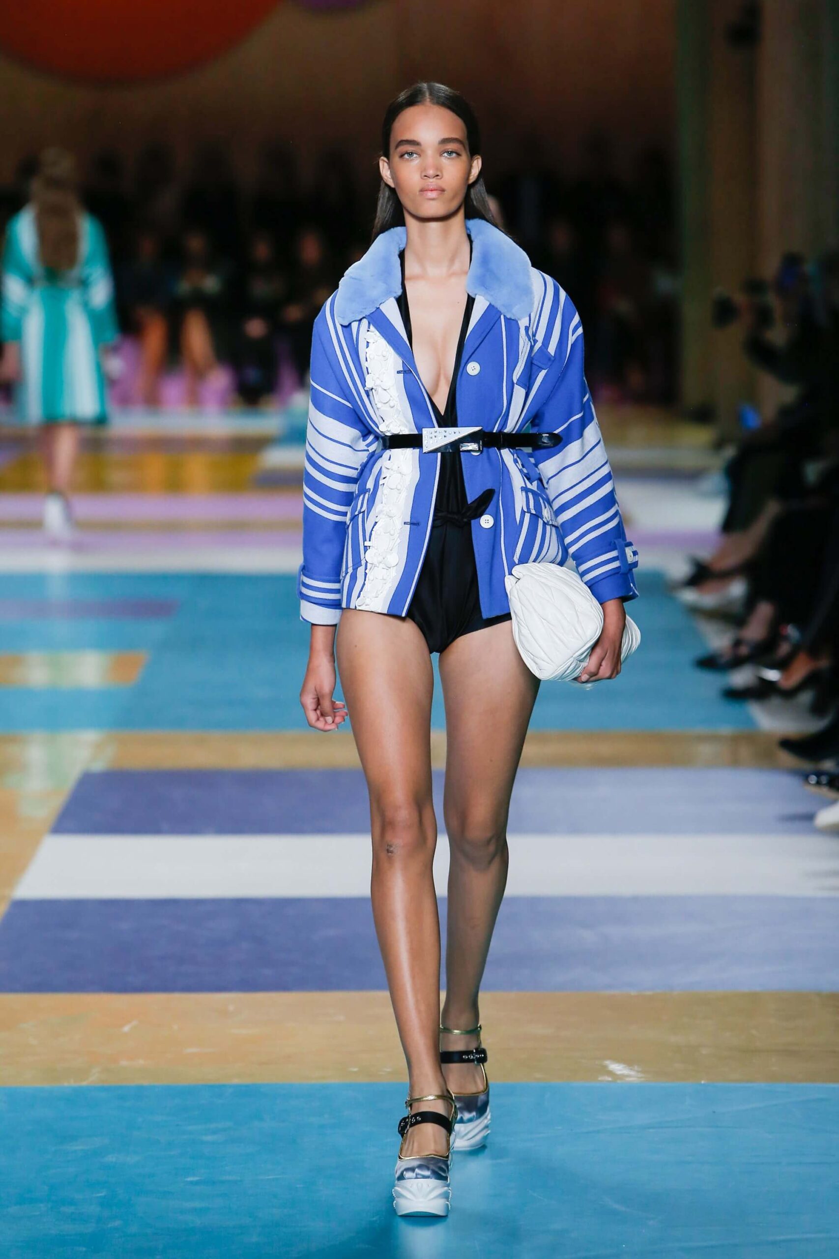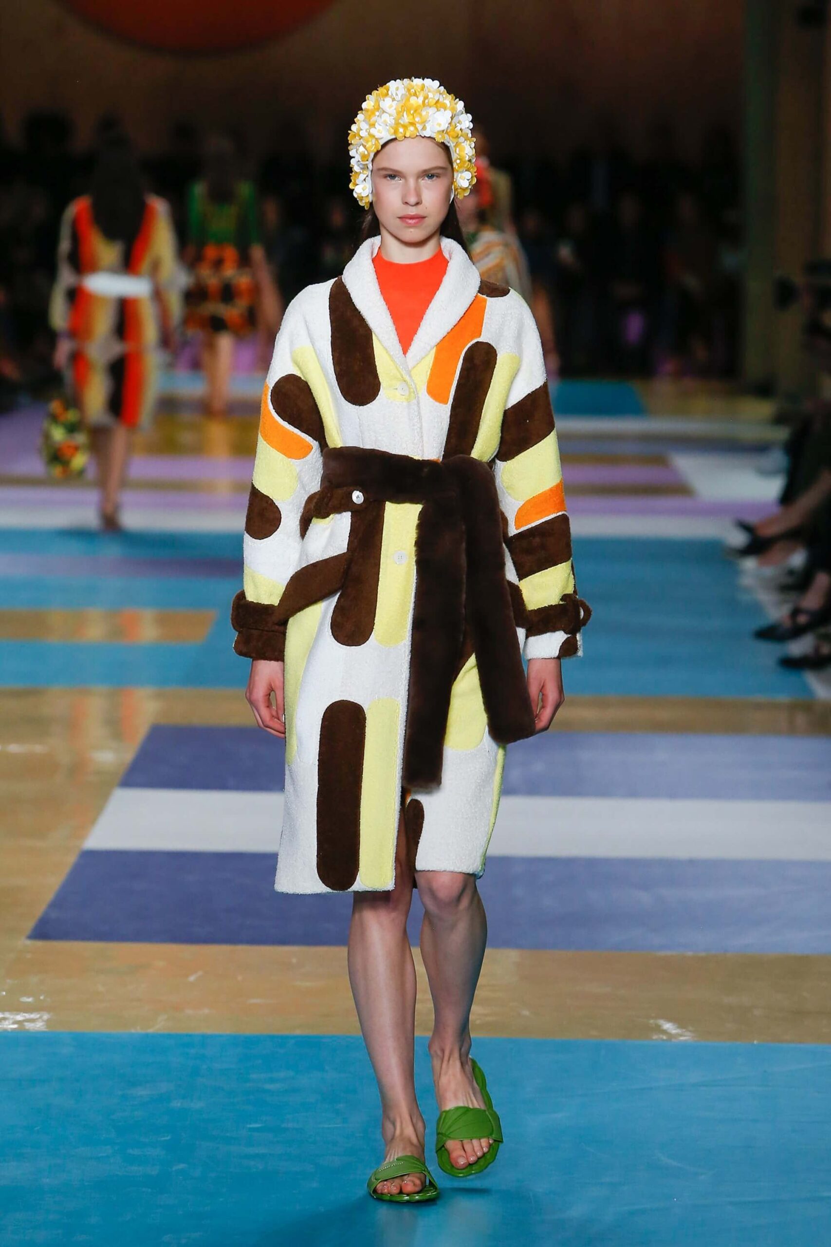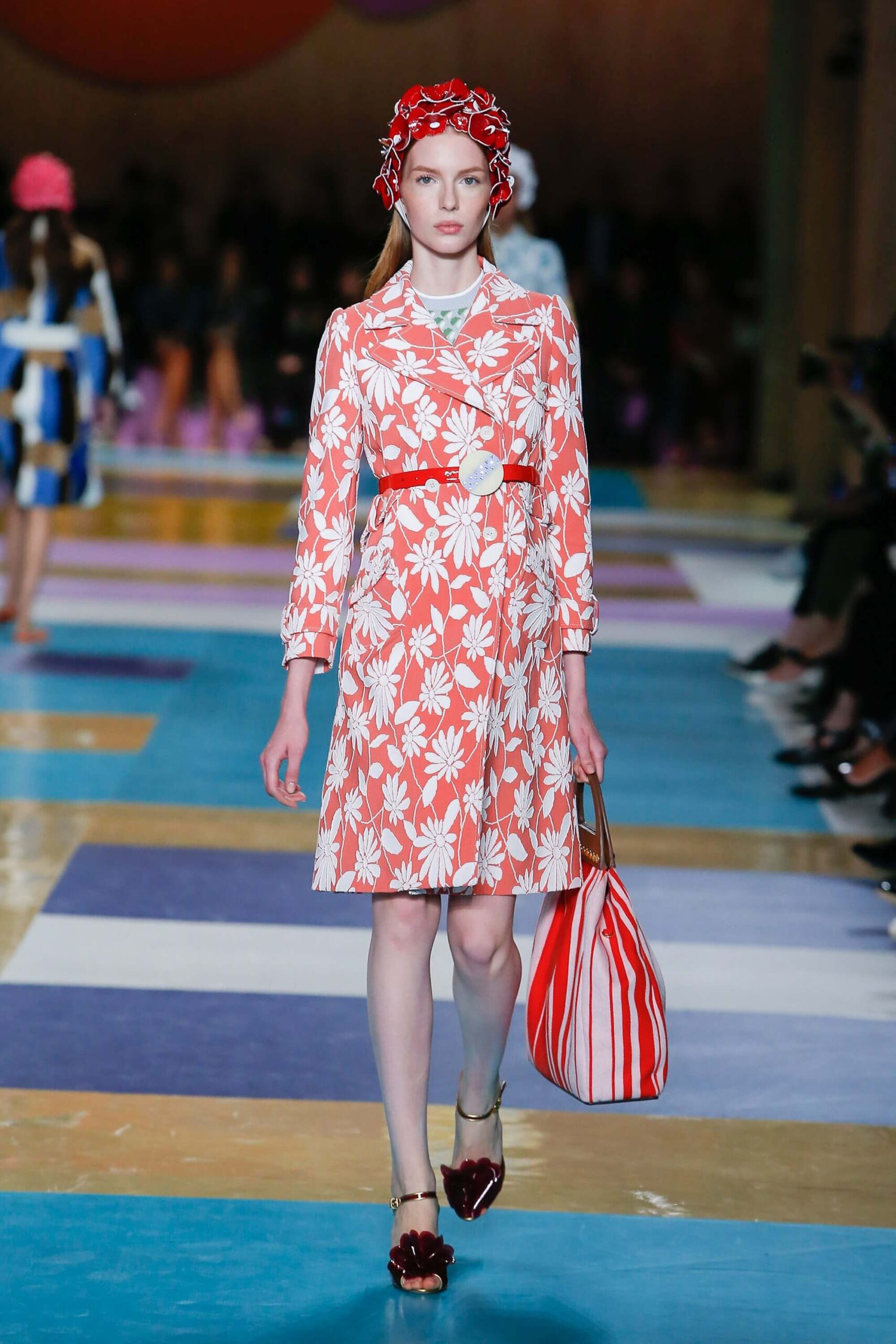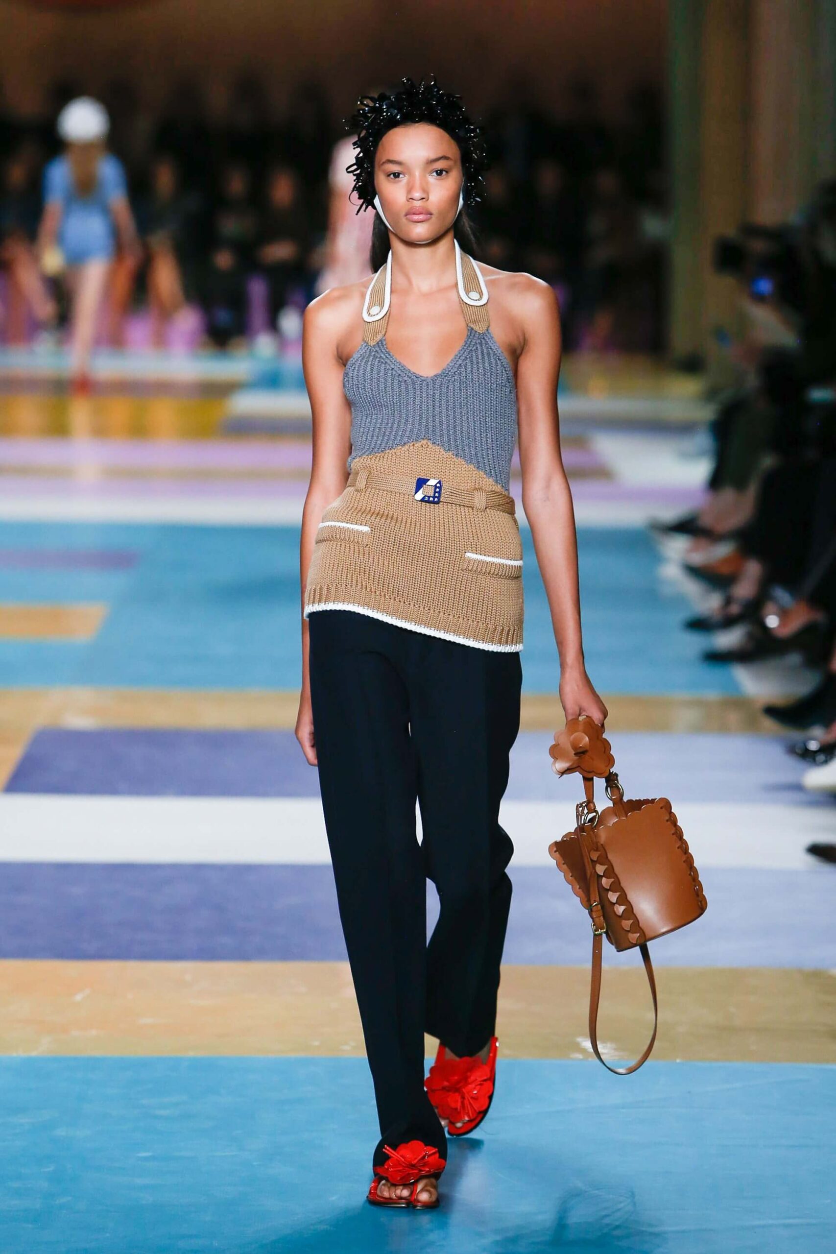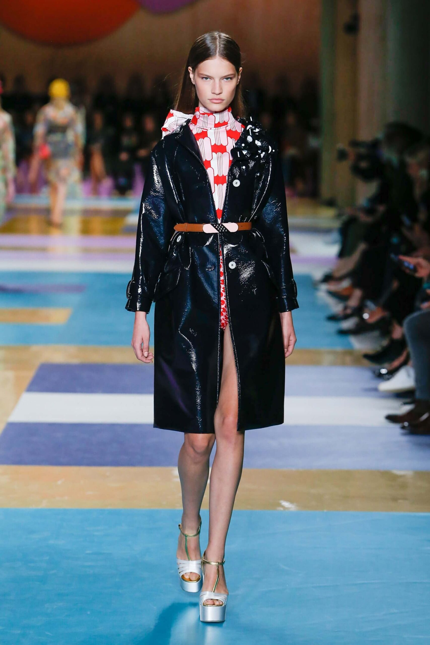 The Miu Miu crew took a trip to the beach. Well, it is Spring Summer. And so to the beach we went. Around us shapes decorated the plywood walls, a burnt orange circle burned bright and hot like the sun. Purples, whites and blues made up the clouds, a Miu Miu wonderland. And like any good wonderland it was vibrant and thrilling looking through this colour Kodachrome and this Polaroid film. It was a hot summer’s day at the beach, Miuccia style with sky blue patent leather coats and classic bold swirly ’70s printed day dresses. Bathing costumes and swimming hats like a Miu Miu synchronised swim team. It felt like an old school Hollywood pool party, or better still a Cinecitta one, so retro Rome yet something futuristic was happening. Gold platform sandals, optical prints and lozenges of ice cream colours. Totally hedonistic, good times, good vibes, high on colour and high on life. The Creatures oozed through the speakers, like a good golden honey: “Stranded on Venus sands.” There’s no better place to be stranded. This Miu Miu Wes-like wonderworld is where the magic happens.