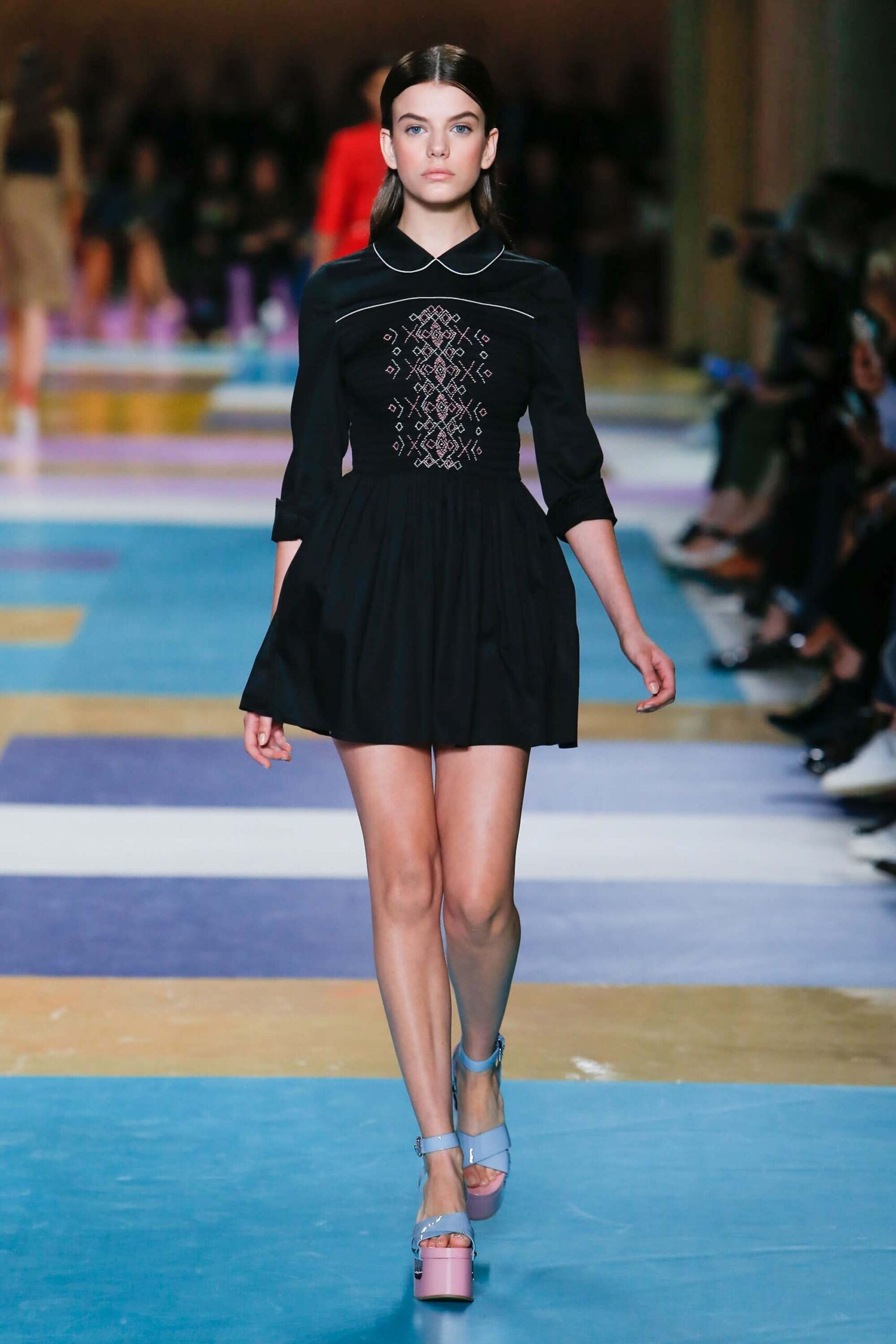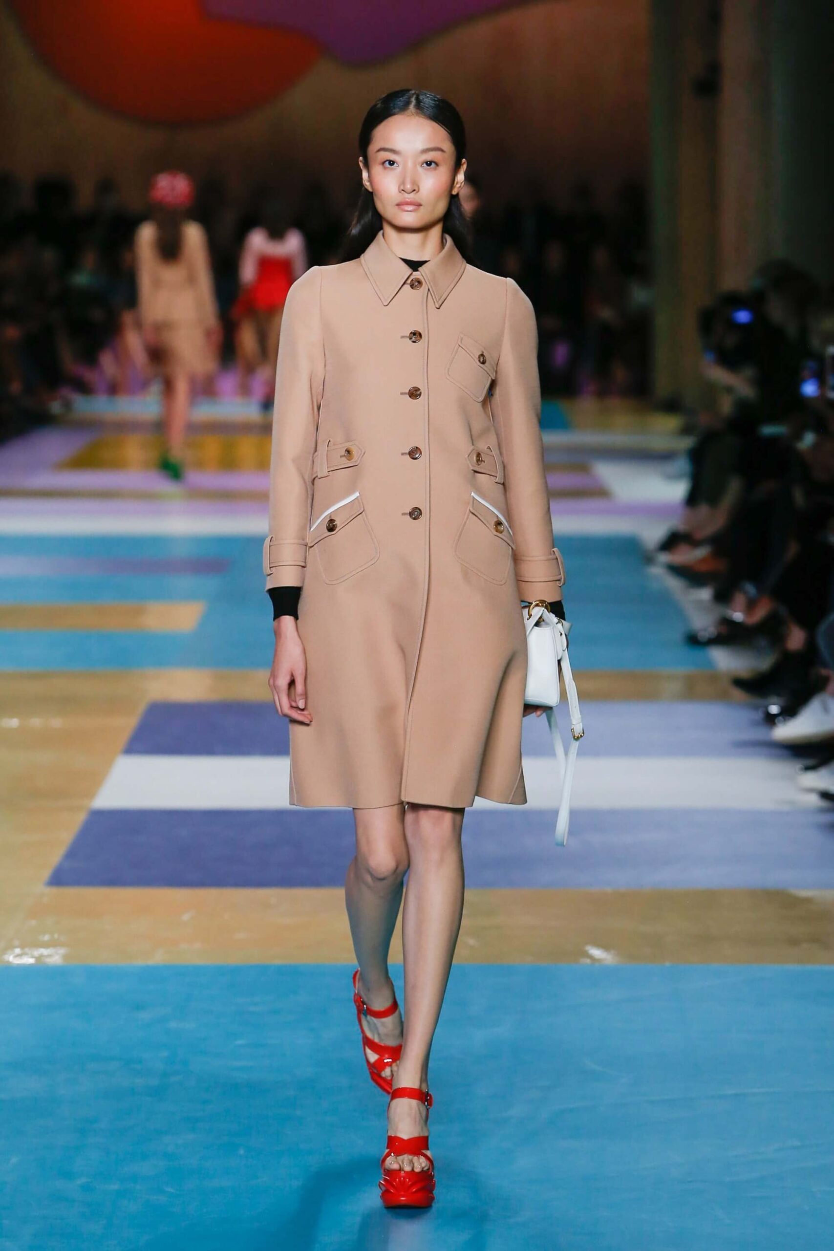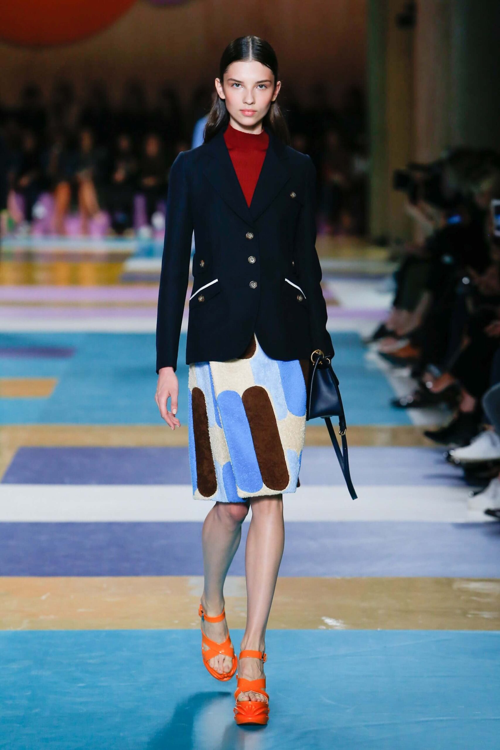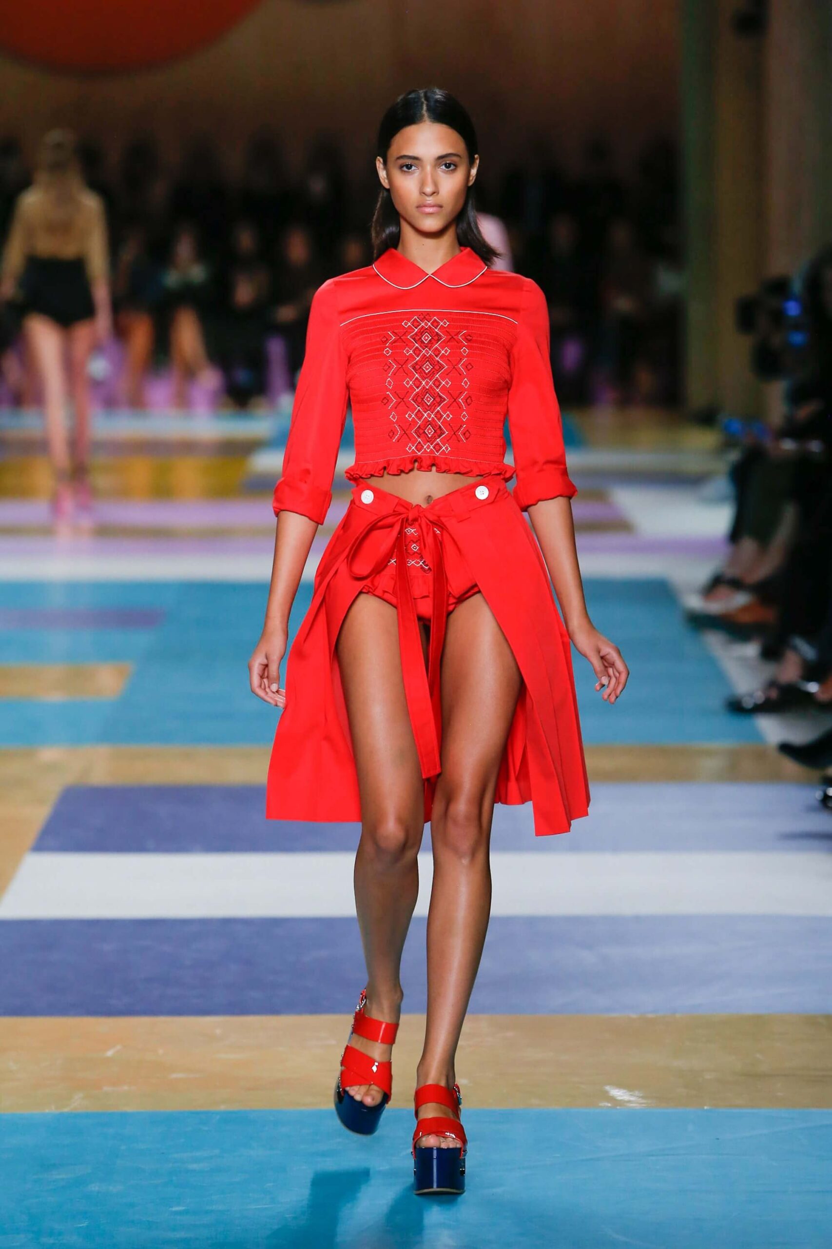 The Miu Miu crew took a trip to the beach. Well, it is Spring Summer. And so to the beach we went. Around us shapes decorated the plywood walls, a burnt orange circle burned bright and hot like the sun. Purples, whites and blues made up the clouds, a Miu Miu wonderland. And like any good wonderland it was vibrant and thrilling looking through this colour Kodachrome and this Polaroid film. It was a hot summer’s day at the beach, Miuccia style with sky blue patent leather coats and classic bold swirly ’70s printed day dresses. Bathing costumes and swimming hats like a Miu Miu synchronised swim team. It felt like an old school Hollywood pool party, or better still a Cinecitta one, so retro Rome yet something futuristic was happening. Gold platform sandals, optical prints and lozenges of ice cream colours. Totally hedonistic, good times, good vibes, high on colour and high on life. The Creatures oozed through the speakers, like a good golden honey: “Stranded on Venus sands.” There’s no better place to be stranded. This Miu Miu Wes-like wonderworld is where the magic happens.