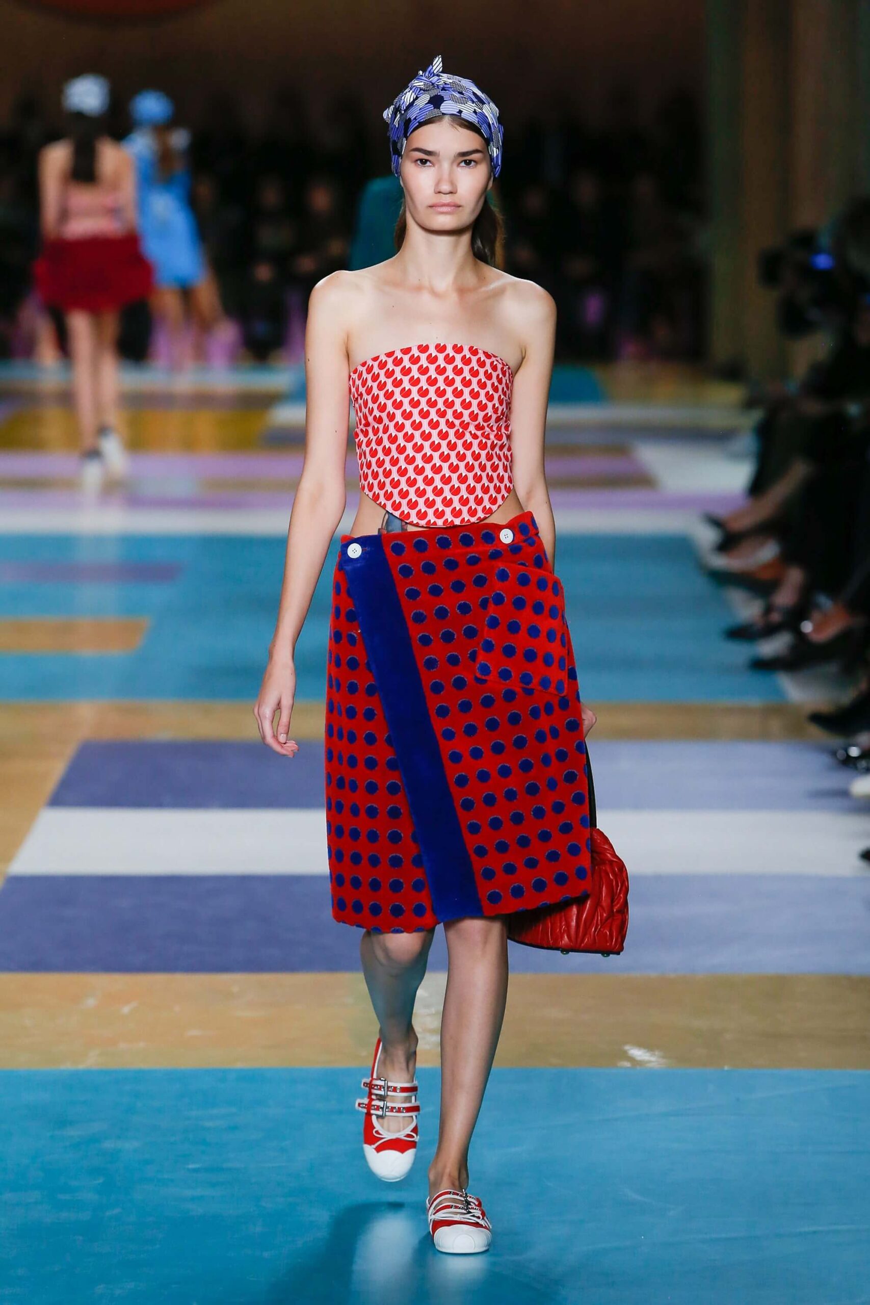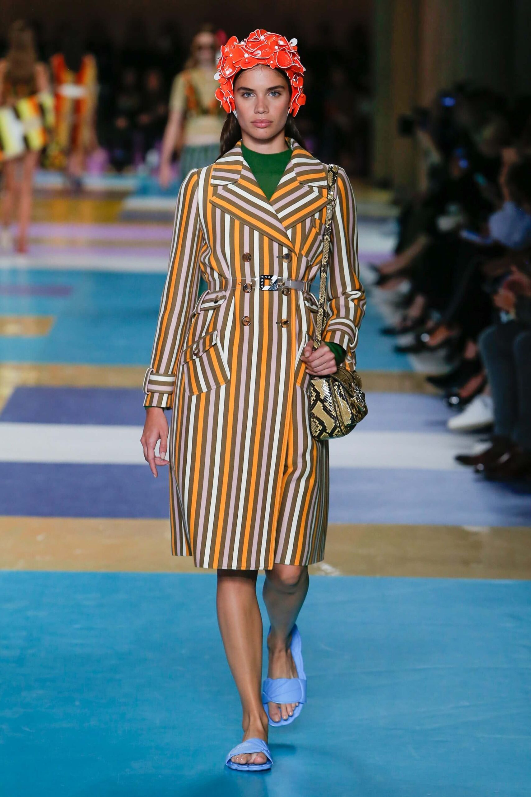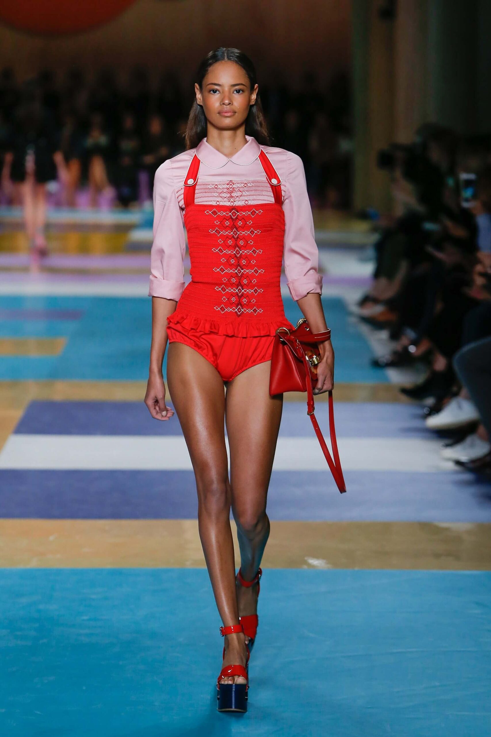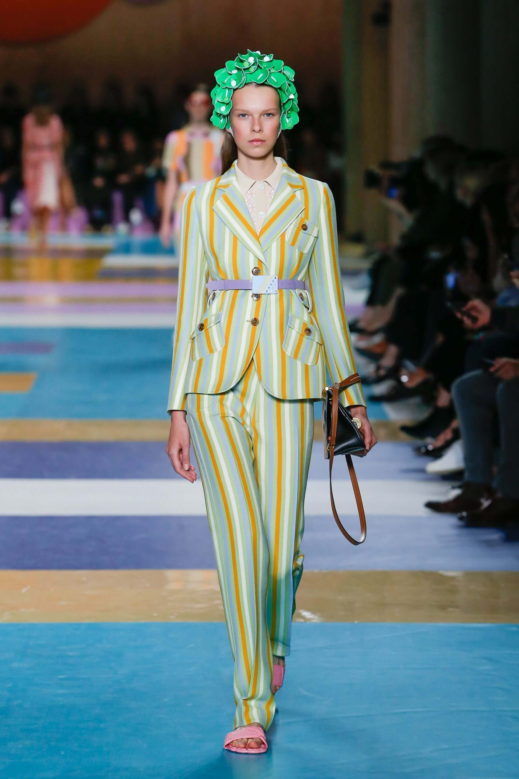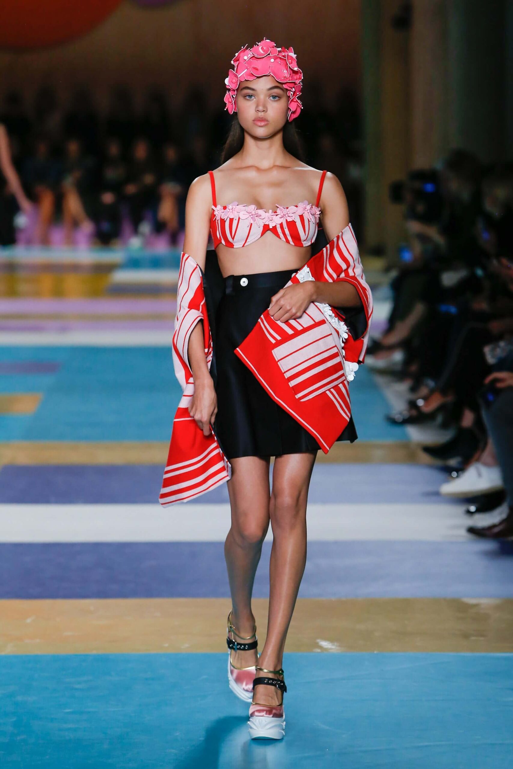 The Miu Miu crew took a trip to the beach. Well, it is Spring Summer. And so to the beach we went. Around us shapes decorated the plywood walls, a burnt orange circle burned bright and hot like the sun. Purples, whites and blues made up the clouds, a Miu Miu wonderland. And like any good wonderland it was vibrant and thrilling looking through this colour Kodachrome and this Polaroid film. It was a hot summer’s day at the beach, Miuccia style with sky blue patent leather coats and classic bold swirly ’70s printed day dresses. Bathing costumes and swimming hats like a Miu Miu synchronised swim team. It felt like an old school Hollywood pool party, or better still a Cinecitta one, so retro Rome yet something futuristic was happening. Gold platform sandals, optical prints and lozenges of ice cream colours. Totally hedonistic, good times, good vibes, high on colour and high on life. The Creatures oozed through the speakers, like a good golden honey: “Stranded on Venus sands.” There’s no better place to be stranded. This Miu Miu Wes-like wonderworld is where the magic happens.