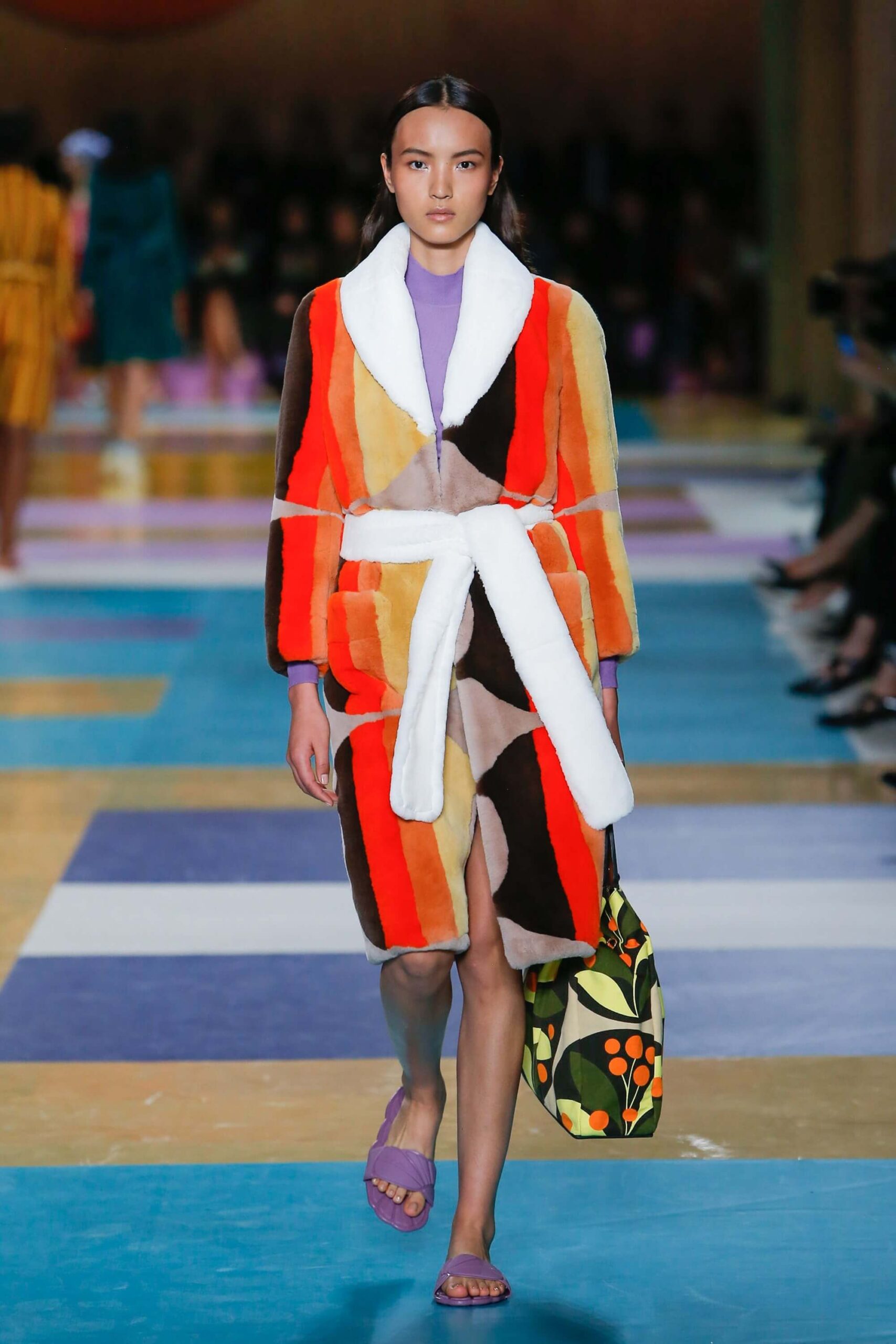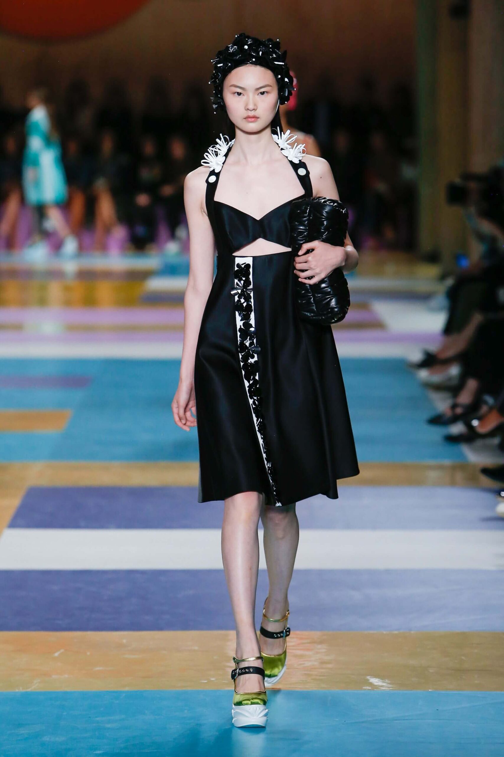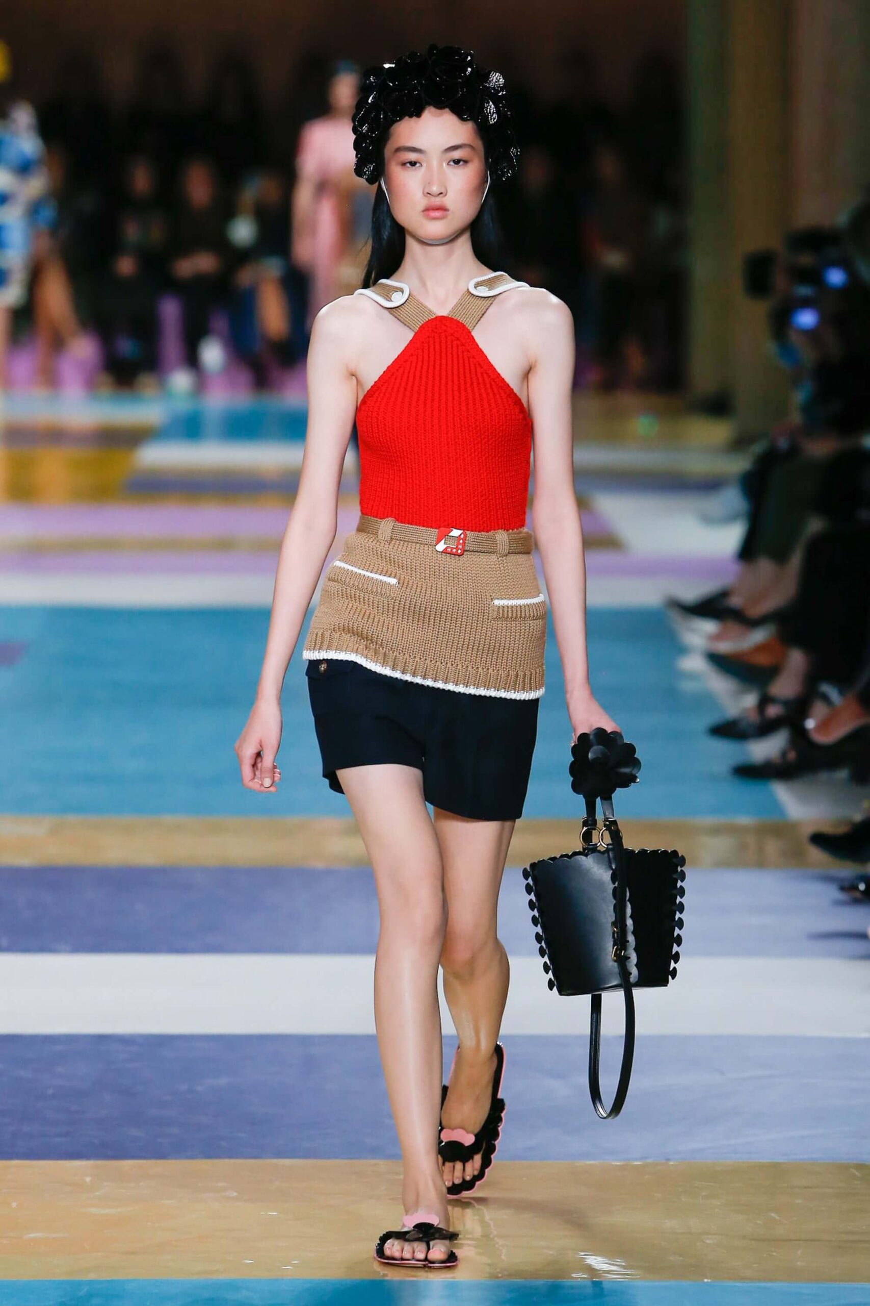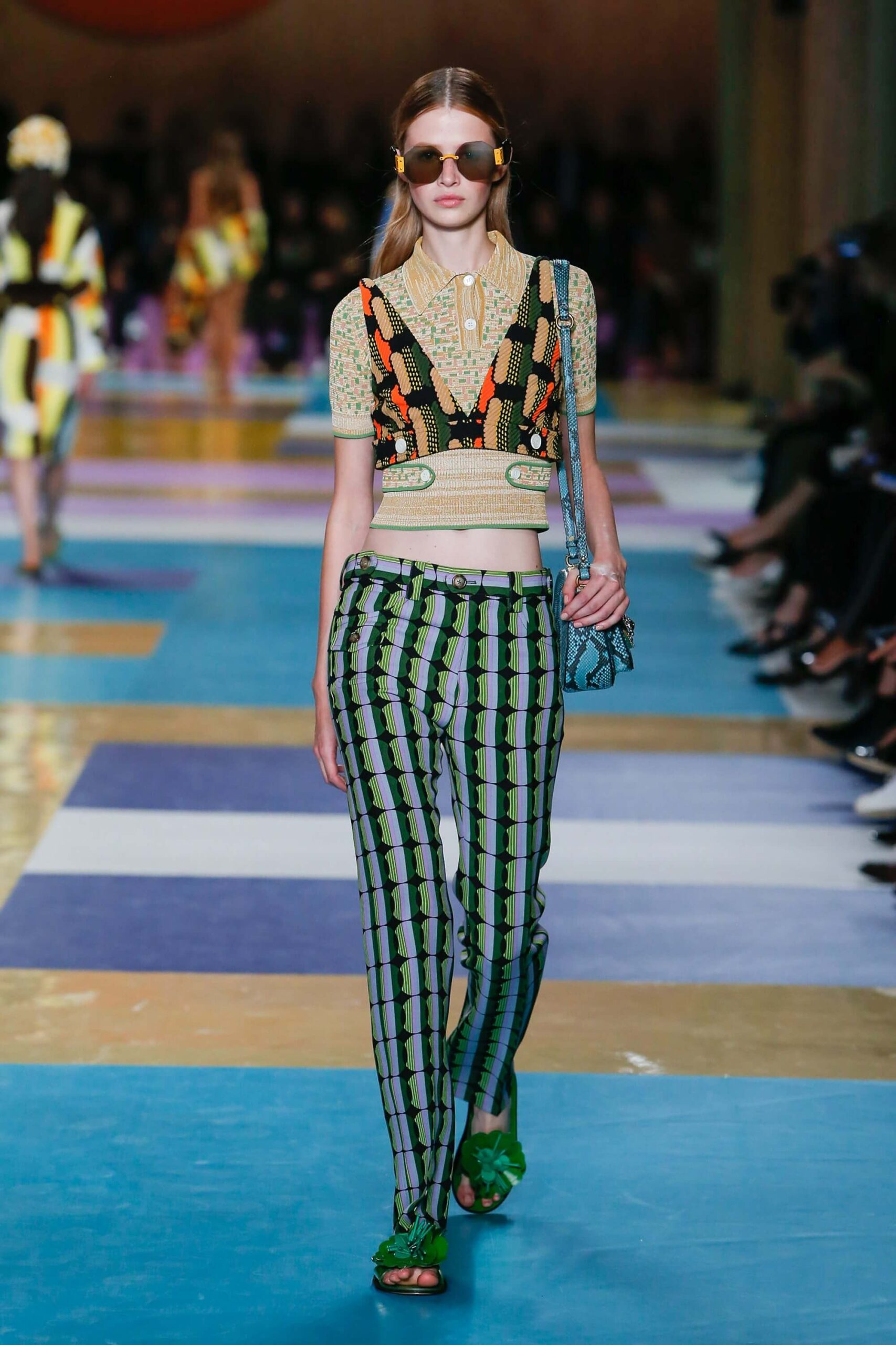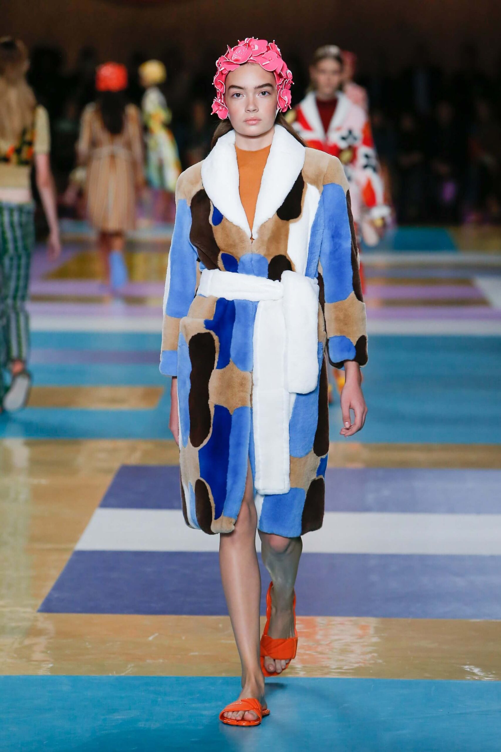 The Miu Miu crew took a trip to the beach. Well, it is Spring Summer. And so to the beach we went. Around us shapes decorated the plywood walls, a burnt orange circle burned bright and hot like the sun. Purples, whites and blues made up the clouds, a Miu Miu wonderland. And like any good wonderland it was vibrant and thrilling looking through this colour Kodachrome and this Polaroid film. It was a hot summer’s day at the beach, Miuccia style with sky blue patent leather coats and classic bold swirly ’70s printed day dresses. Bathing costumes and swimming hats like a Miu Miu synchronised swim team. It felt like an old school Hollywood pool party, or better still a Cinecitta one, so retro Rome yet something futuristic was happening. Gold platform sandals, optical prints and lozenges of ice cream colours. Totally hedonistic, good times, good vibes, high on colour and high on life. The Creatures oozed through the speakers, like a good golden honey: “Stranded on Venus sands.” There’s no better place to be stranded. This Miu Miu Wes-like wonderworld is where the magic happens.