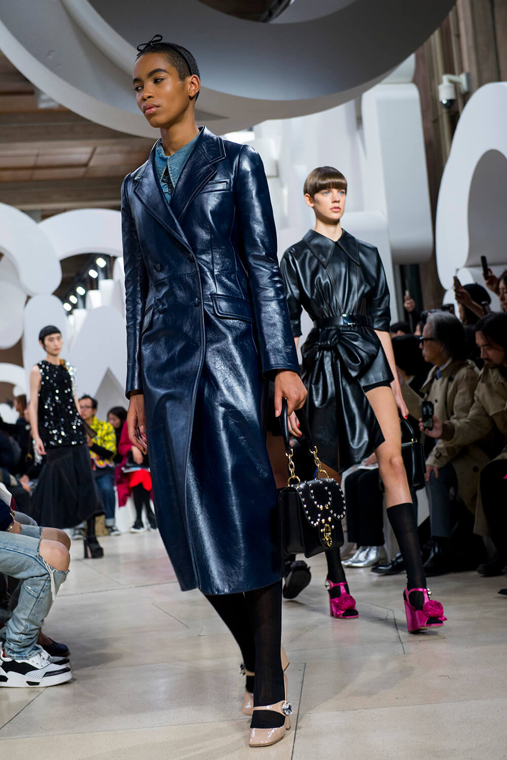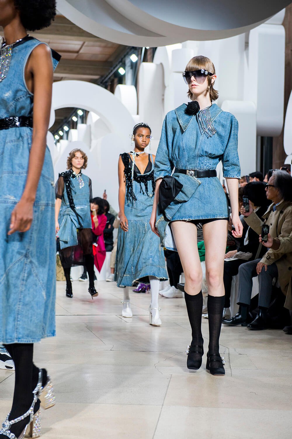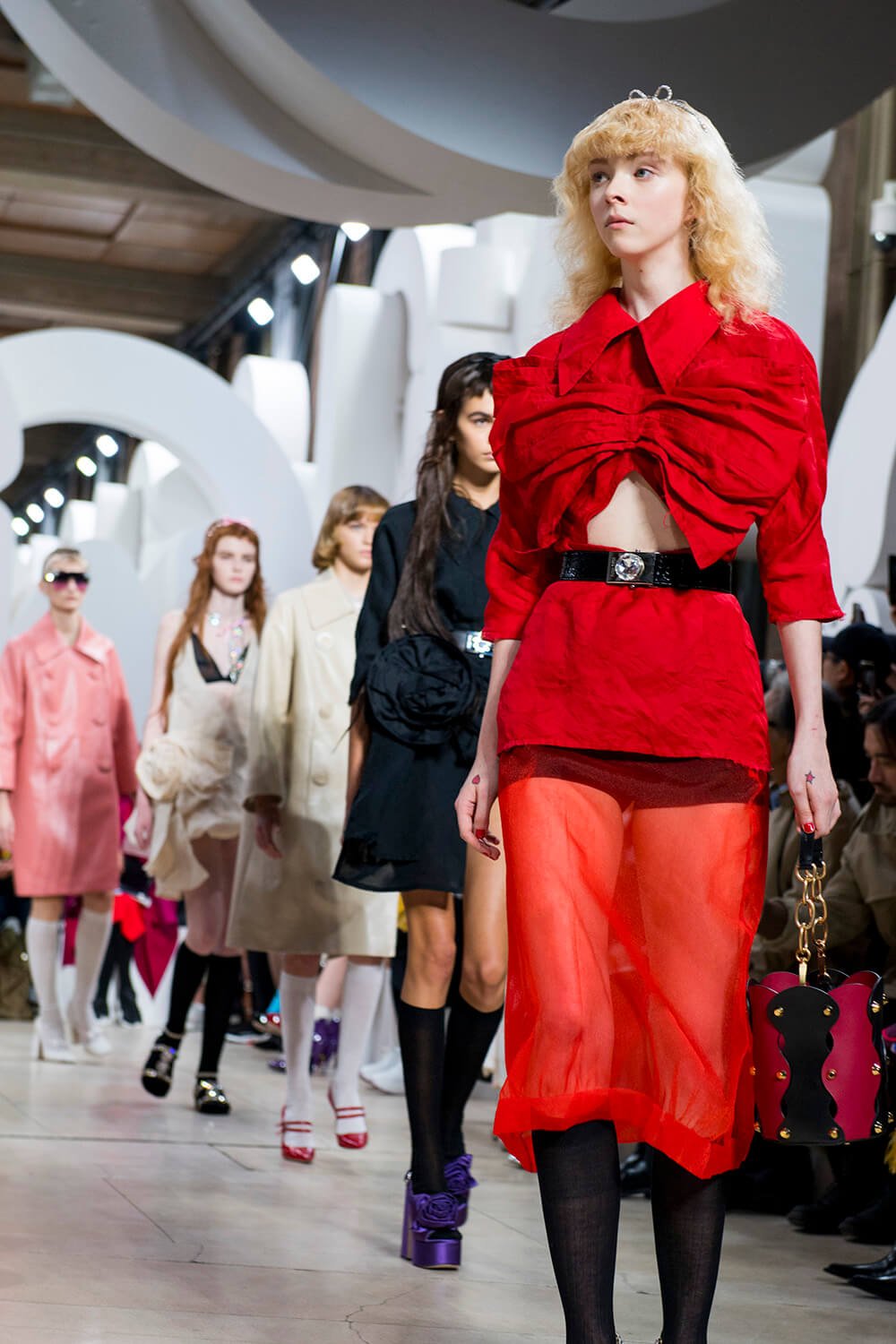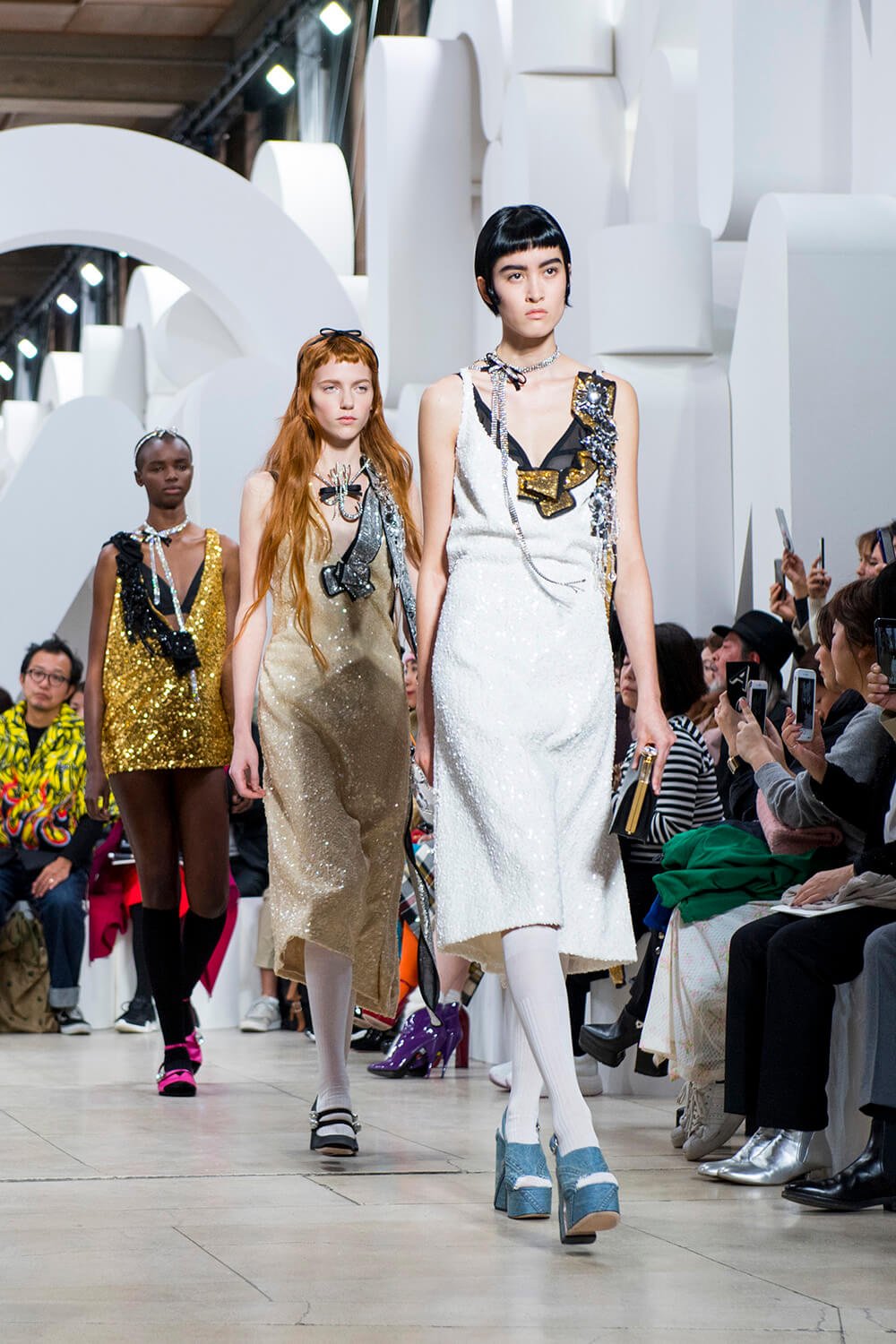 Why is the Miu Miu girl one of our favourite characters in fashion? Firstly, she’s got great taste in music (for SS19 she’s looping Prince’s beautifully melancholic acoustic version of Purple Rain). Then there’s her tendency to blur the line between night and day. In Miss Miu Miu’s head, there’s never a wrong time to cover yourself in diamanté fringing or lavish jet beads. She also loves to mix butch and femme, thinking nothing of wearing a man’s blazer and boyish polo top with skirts made from veils of sheer chiffon or sparkling sequins. She’s not a fabric snob – she wears flapper style slips made from Parachute nylon; and we love what she does with denim: fashioning it into swishing dirndls, swagged party dresses or mini skirts festooned with extravagant rosettes.