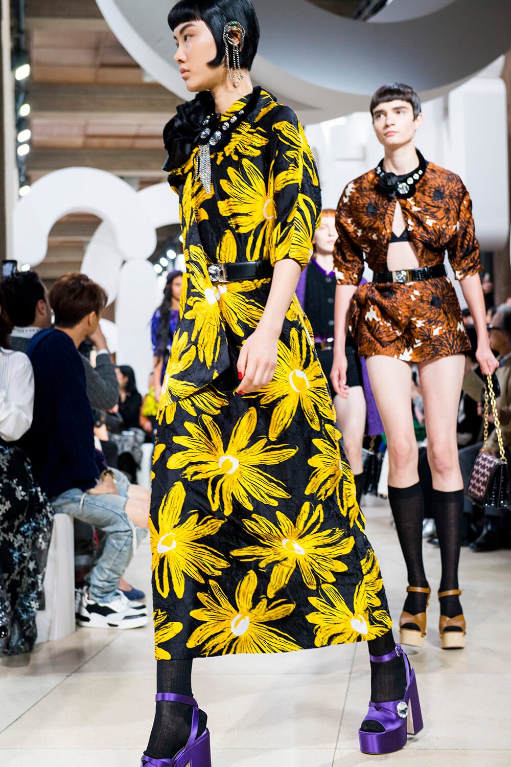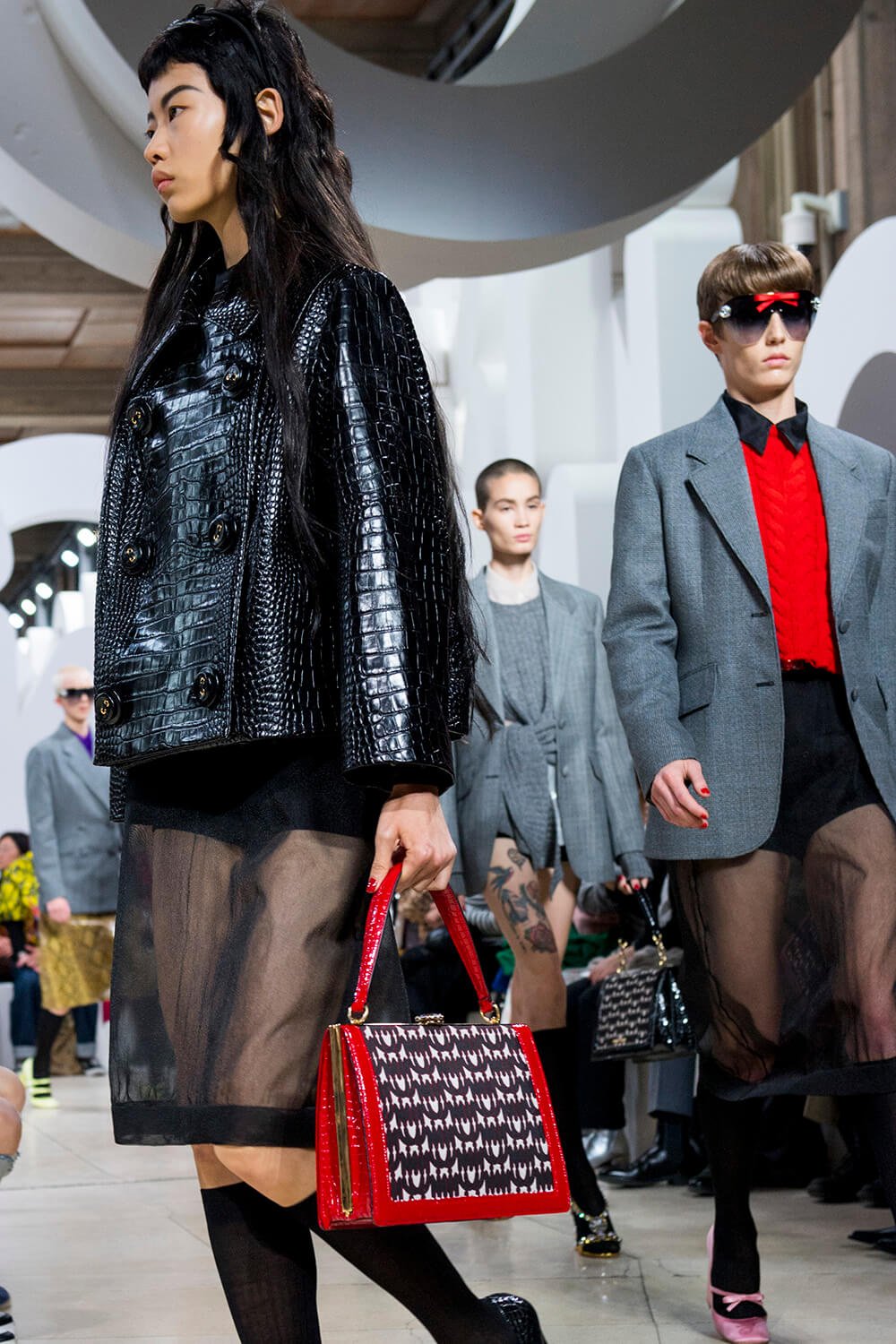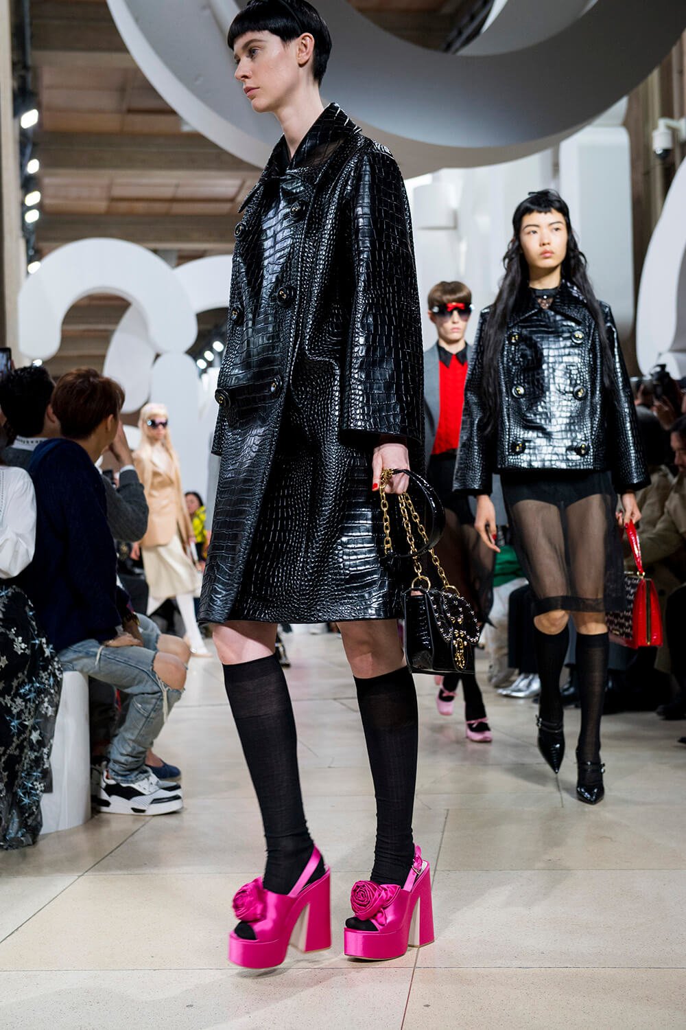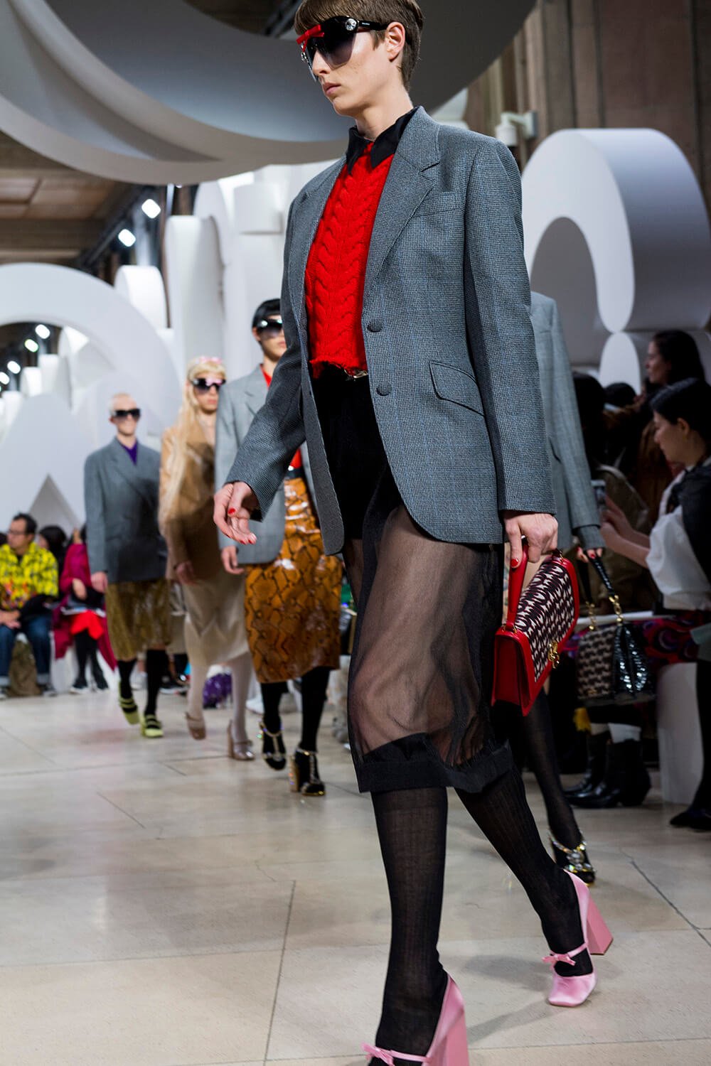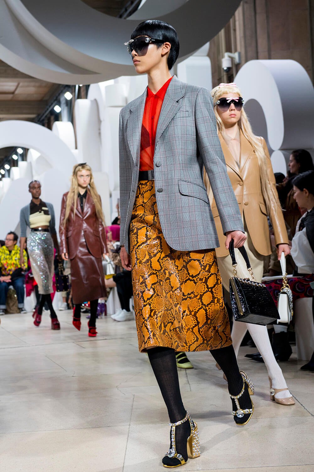 Why is the Miu Miu girl one of our favourite characters in fashion? Firstly, she’s got great taste in music (for SS19 she’s looping Prince’s beautifully melancholic acoustic version of Purple Rain). Then there’s her tendency to blur the line between night and day. In Miss Miu Miu’s head, there’s never a wrong time to cover yourself in diamanté fringing or lavish jet beads. She also loves to mix butch and femme, thinking nothing of wearing a man’s blazer and boyish polo top with skirts made from veils of sheer chiffon or sparkling sequins. She’s not a fabric snob – she wears flapper style slips made from Parachute nylon; and we love what she does with denim: fashioning it into swishing dirndls, swagged party dresses or mini skirts festooned with extravagant rosettes.