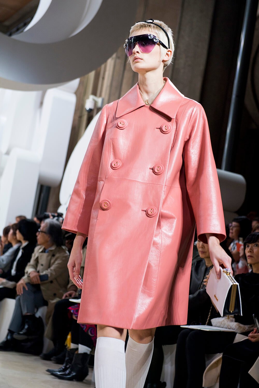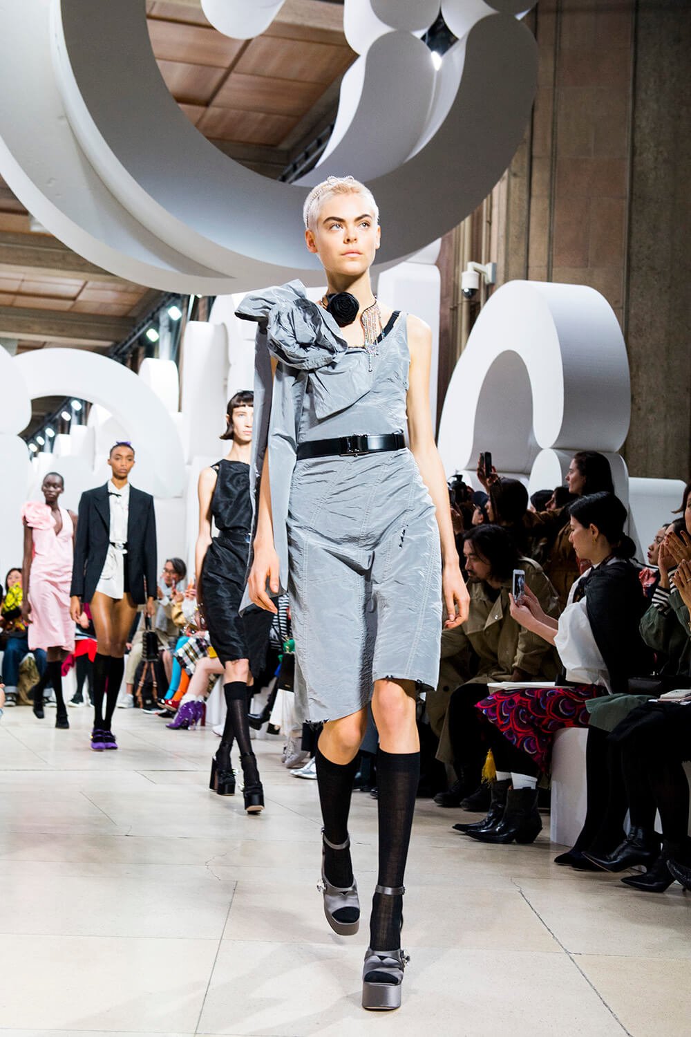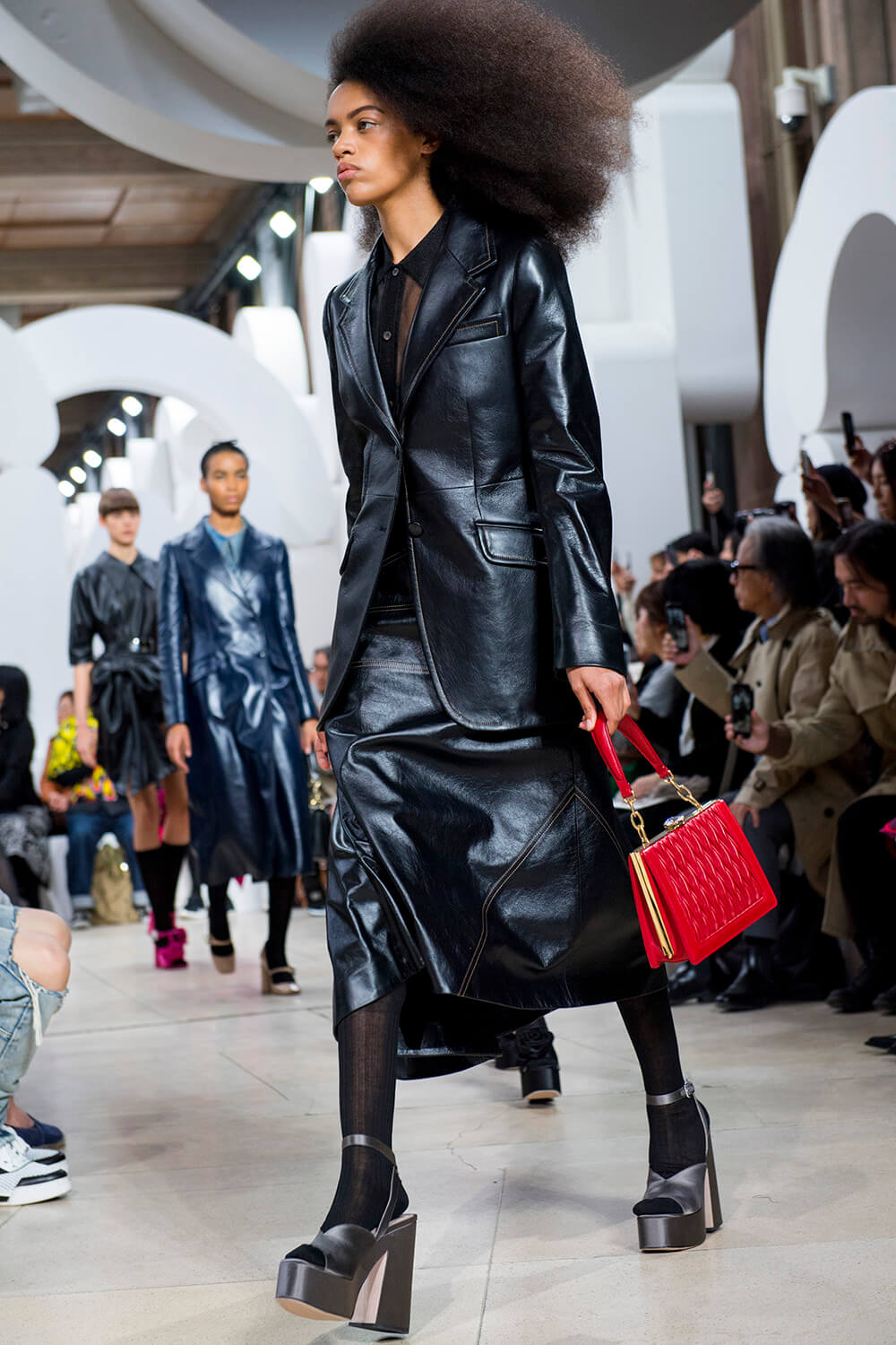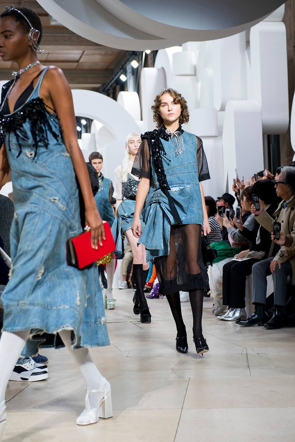 Why is the Miu Miu girl one of our favourite characters in fashion? Firstly, she’s got great taste in music (for SS19 she’s looping Prince’s beautifully melancholic acoustic version of Purple Rain). Then there’s her tendency to blur the line between night and day. In Miss Miu Miu’s head, there’s never a wrong time to cover yourself in diamanté fringing or lavish jet beads. She also loves to mix butch and femme, thinking nothing of wearing a man’s blazer and boyish polo top with skirts made from veils of sheer chiffon or sparkling sequins. She’s not a fabric snob – she wears flapper style slips made from Parachute nylon; and we love what she does with denim: fashioning it into swishing dirndls, swagged party dresses or mini skirts festooned with extravagant rosettes.