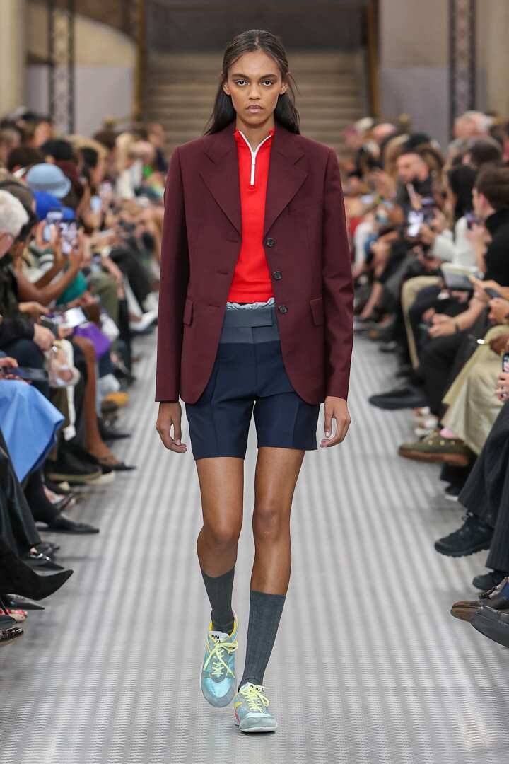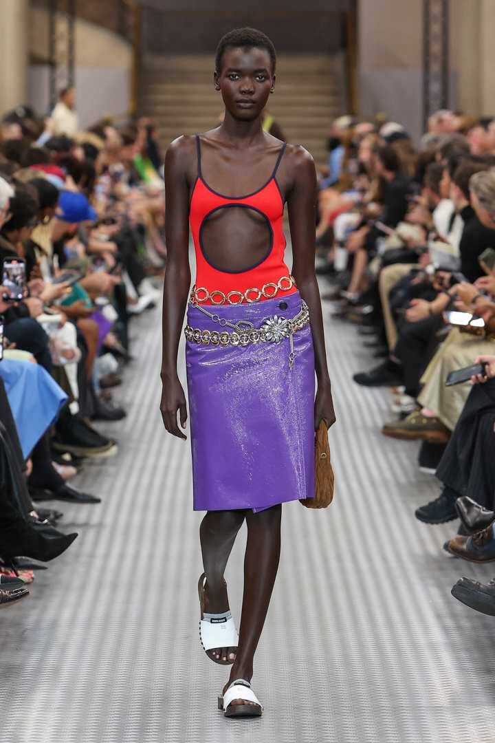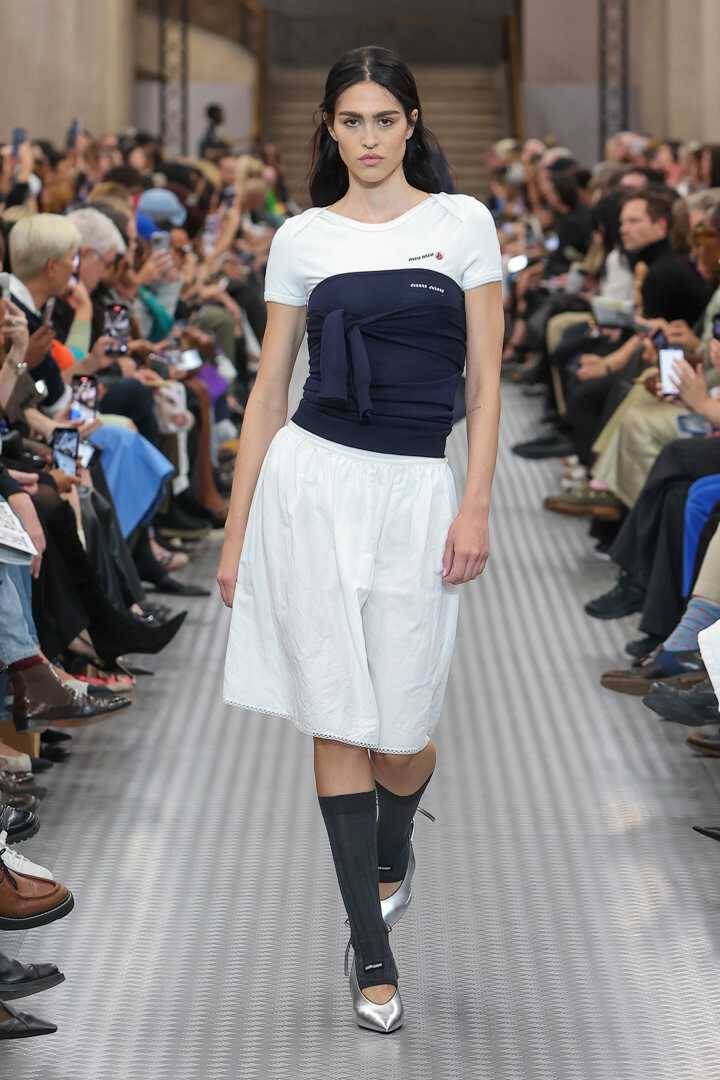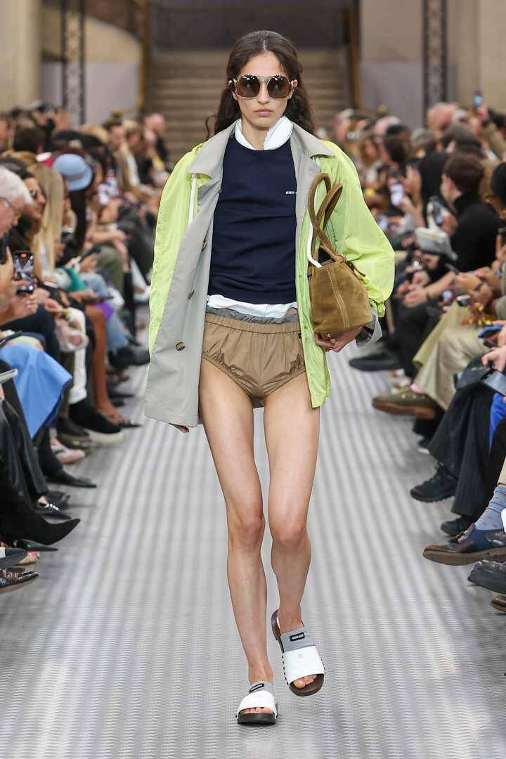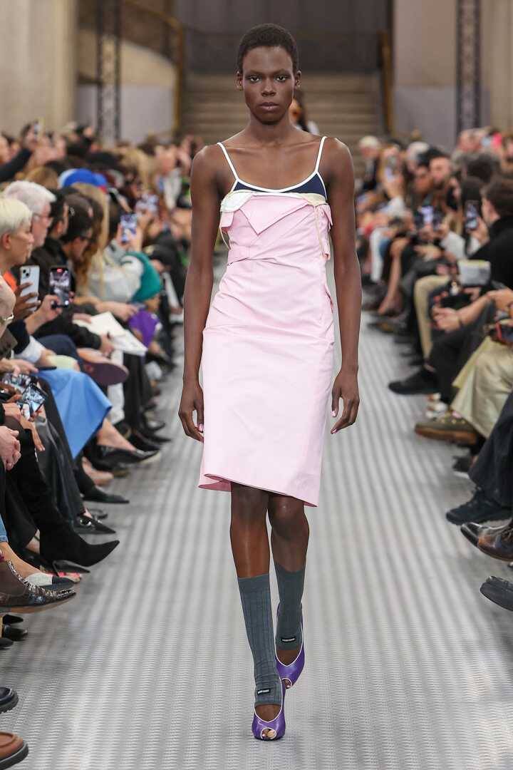 Little girls’ slips and pinafores, in flimsy cotton and silk were worn with knitted bodices which wrapped around the torso like a scarf snake. They looked like adaptions of school uniforms – a favourite Prada trope – as if the wearer had spent playtime running around and had stripped off a layer to cool down. Gym skirts and bloomers worn with cut-out swimsuits and shrunken track tops added a sports-day touch.