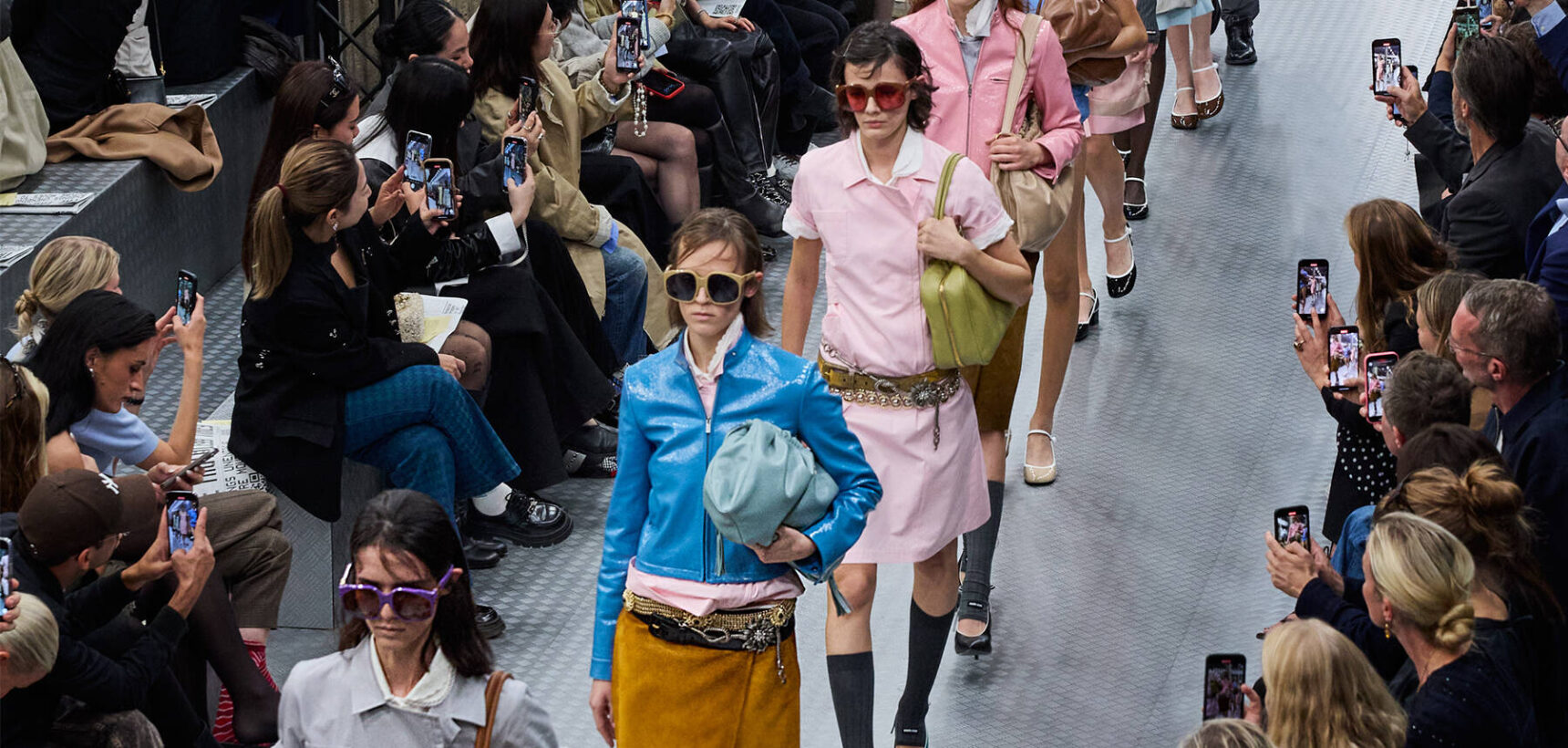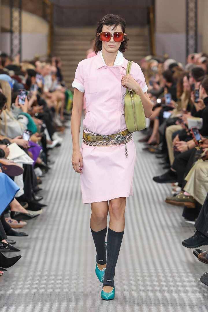 Miuccia Prada’s Miu Miu does not exist in a vacuum. It’s part of a discourse and for many seasons has been in conversation with a chosen artist. For SS25 that artist is Goshka Macuga who “envisaged” the catwalk setting as a newspaper printing factory, and put on a mise-en-scène movie featuring lovers confronting difficult truths about each other. In an election year, truth is an anxious concept. The Truthless Times newspaper, also produced by the artist and left on every seat, linked to articles about truth, perception and selfhood. Big topics. But anyone looking for an obvious link between the art, set and clothes that came down catwalk might struggle, Mrs Prada acknowledged,  “But it always works because we are interested in reality, in today.” If Macuga‘s work reflects anxious times, Prada’s seemed to reach for a simpler state of being.