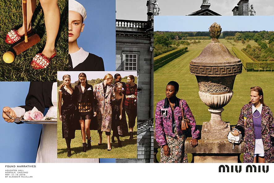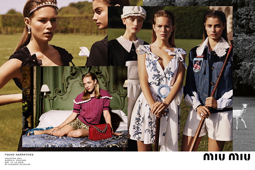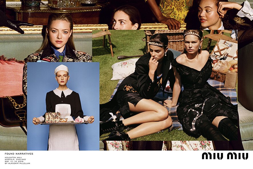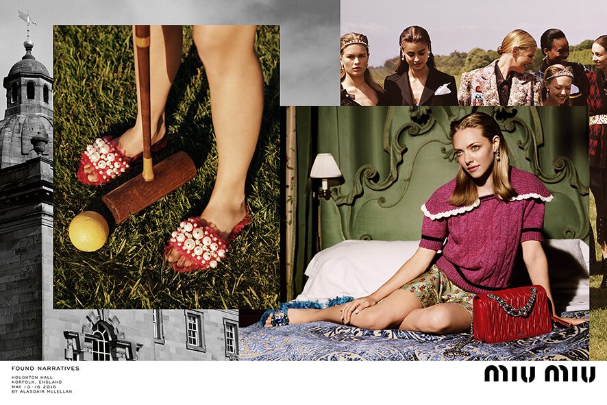 Imagine our excitement when at 17.14pm yesterday an email arrives into our inbox with the subject line “MIU MIU RELEASES “FOUND NARRATIVES”, F/W’16 ADVERTISING CAMPAIGN”. Usually, we are not the proponents of the use of a heavy-handed capitalised subject line, or email capitalisation en generale, but in the case of any communication from the Prada group, we make exceptions. Photographed by Alasdair McLellan, it stars her off Mean Girls, Amanda Seyfried (Miuccia loves a Hollywood ingenue, does she not?) alongside a selection of similarly facially blessed women of the model persuasion, draped across Houghton Hall in Norfolk. Think of this as a weekend away with your gal pals. Miuccia does hen weekend. “With its 24-hour lived-in decadence, it is the perfect environment in which to explore the layers of modernity and history in the motifs of this collection,” say the notes. “Tweed, argyle sweaters, oversized frilled collars and pearl slippers that speak of heritage, faith, craftsmanship, uniform and purpose are irreverently re-mixed for play and pleasure – a weekend of laughter and games.” Isn’t it beautiful? Bedeck us already!