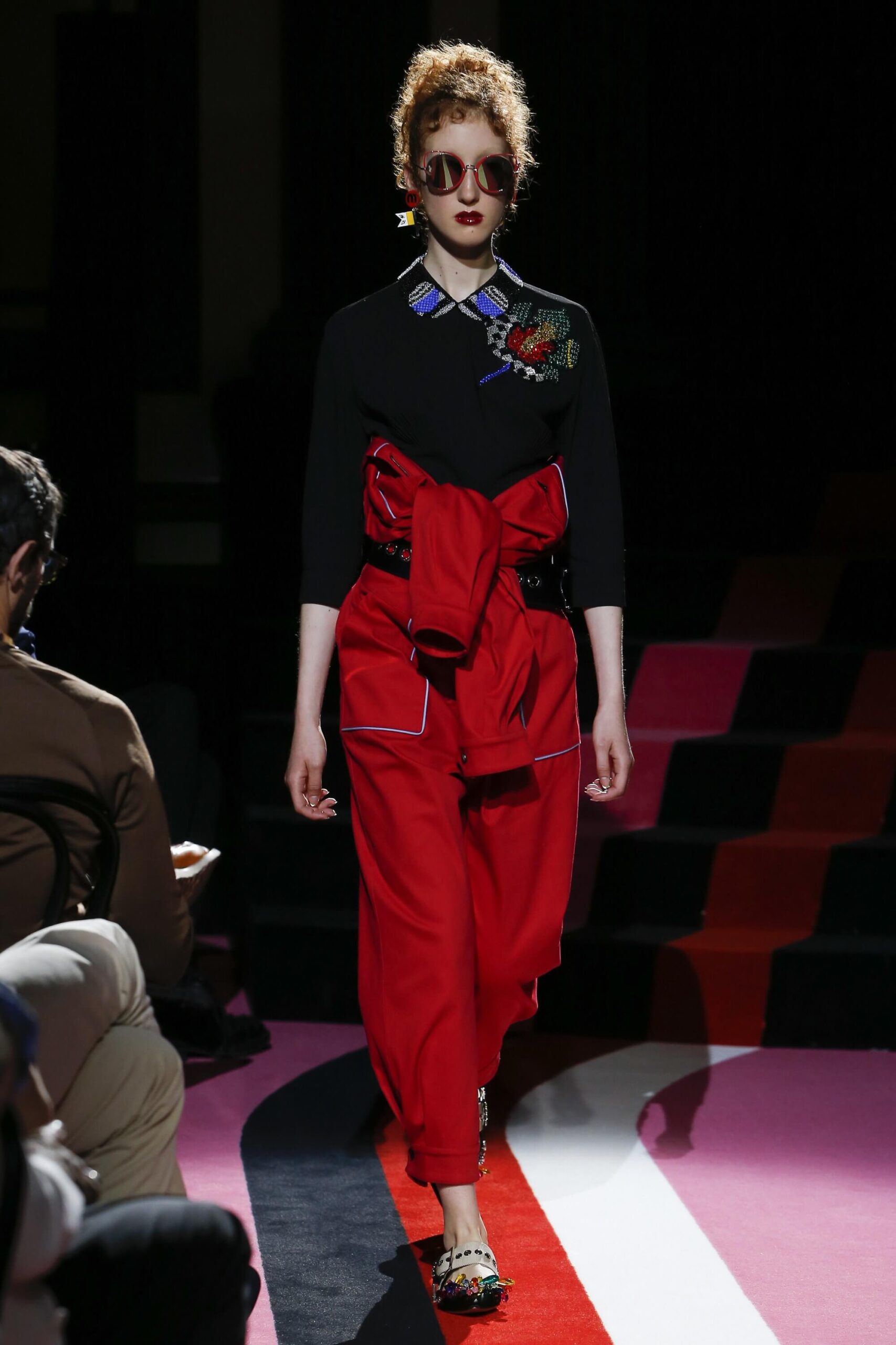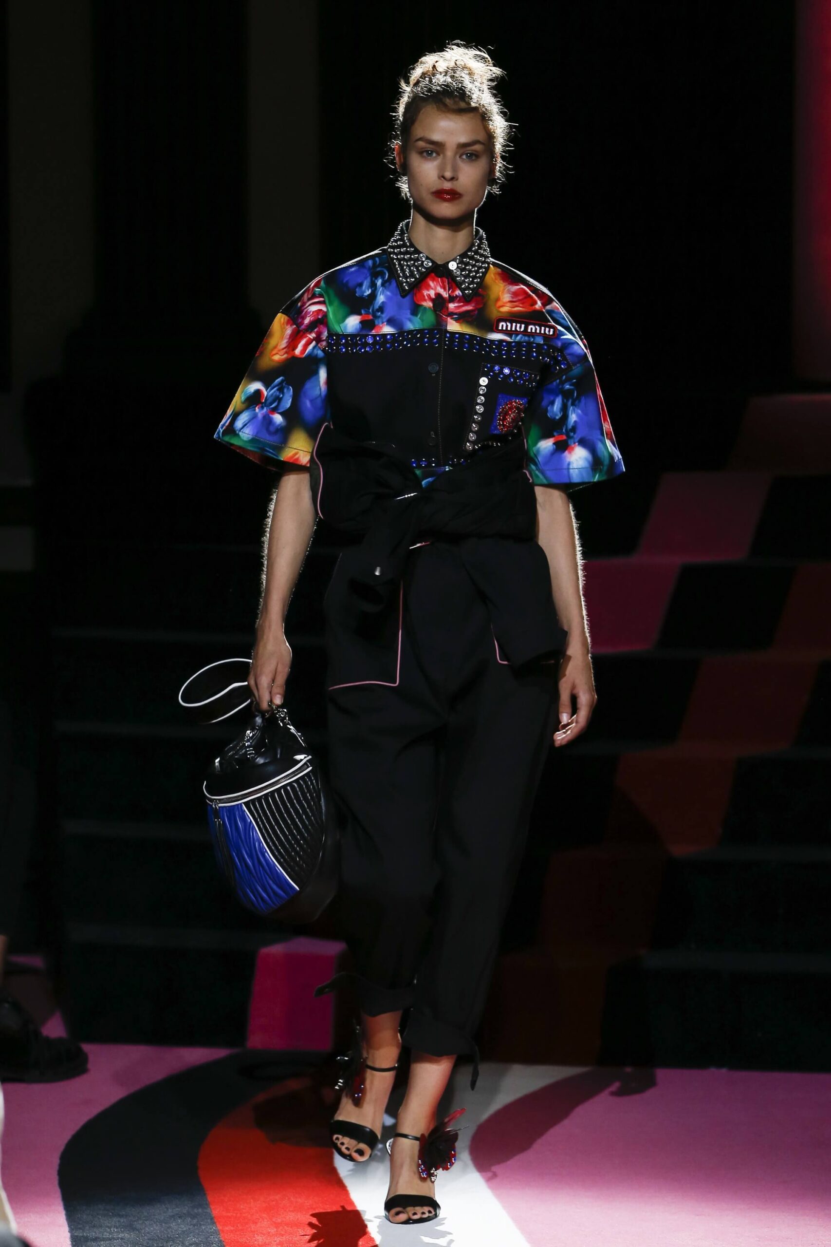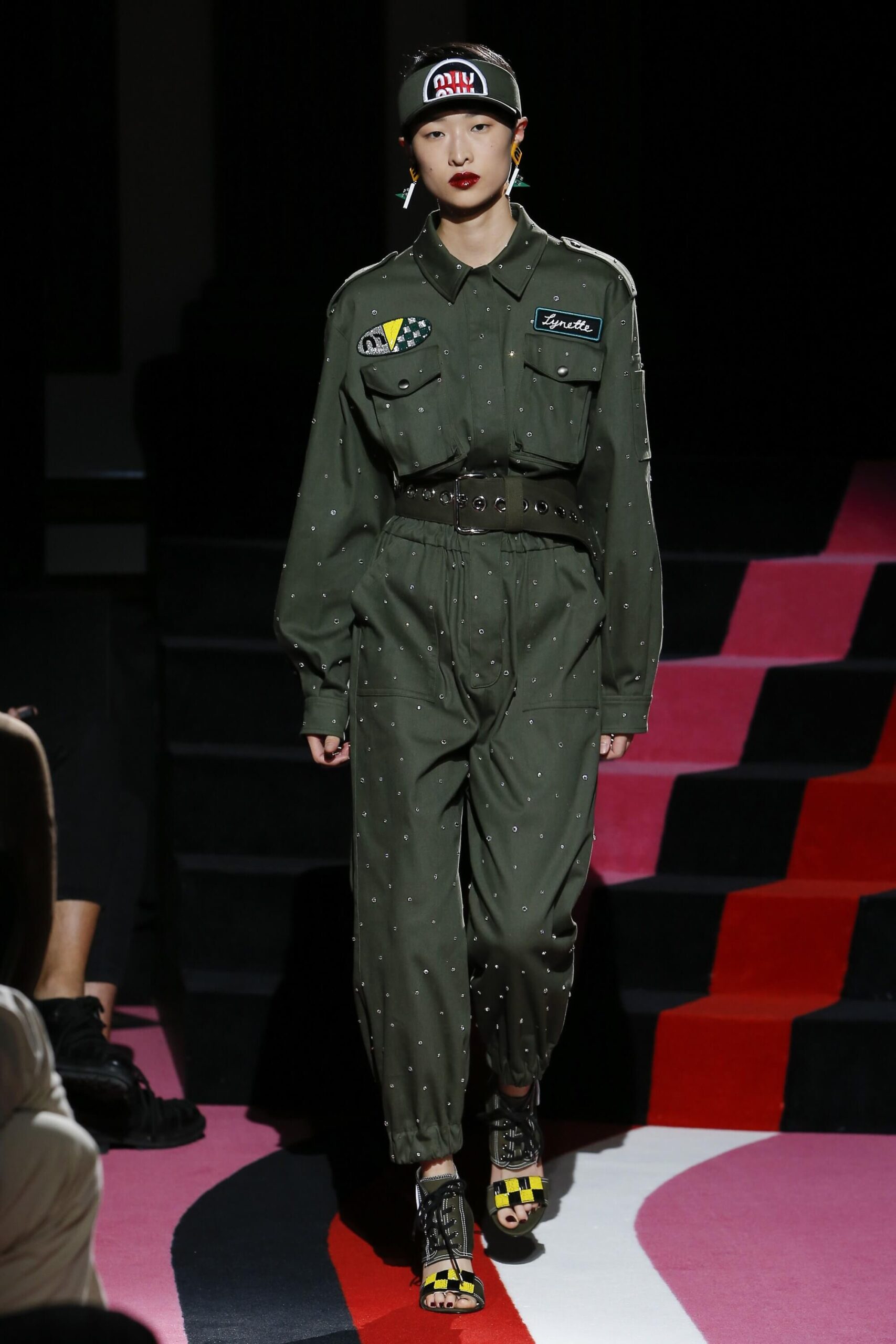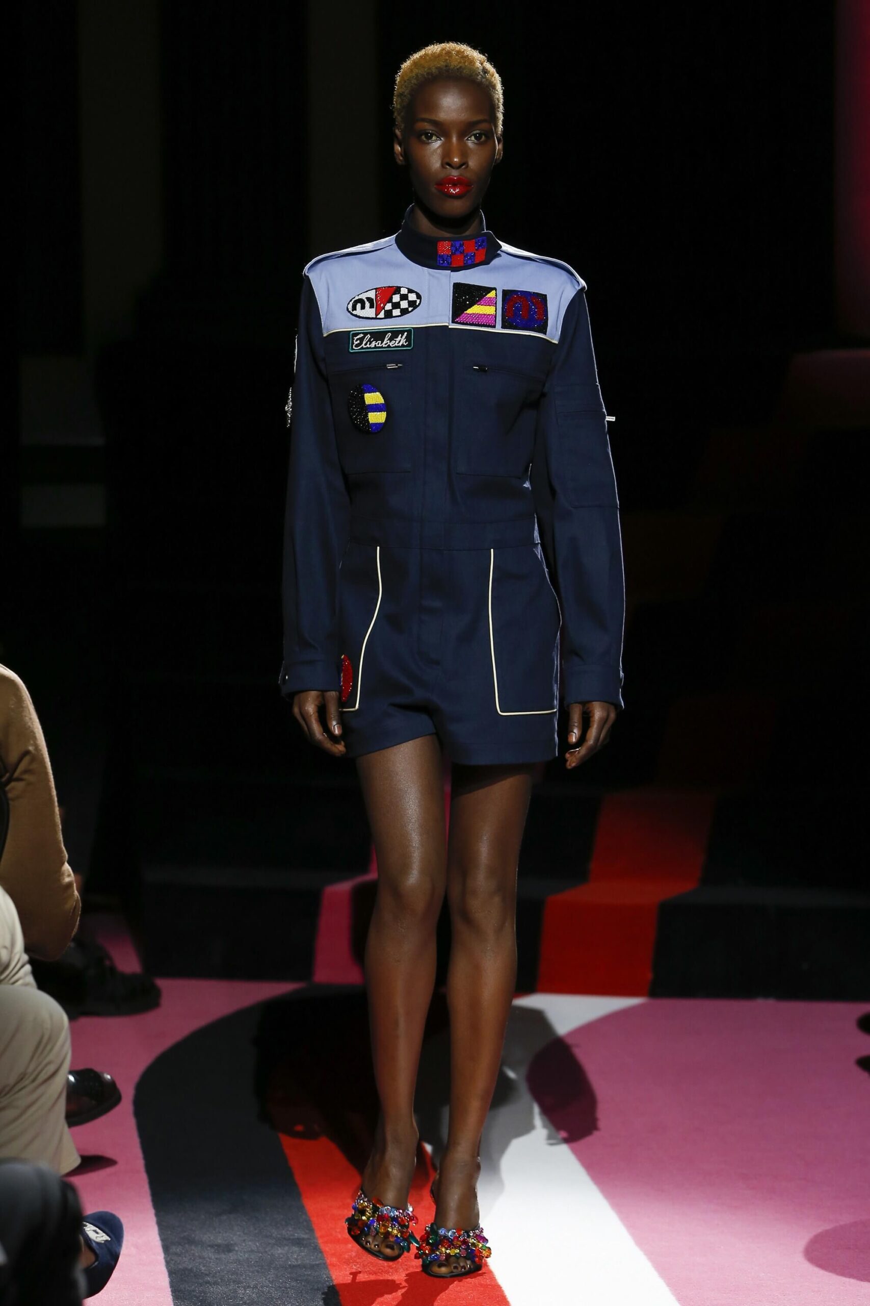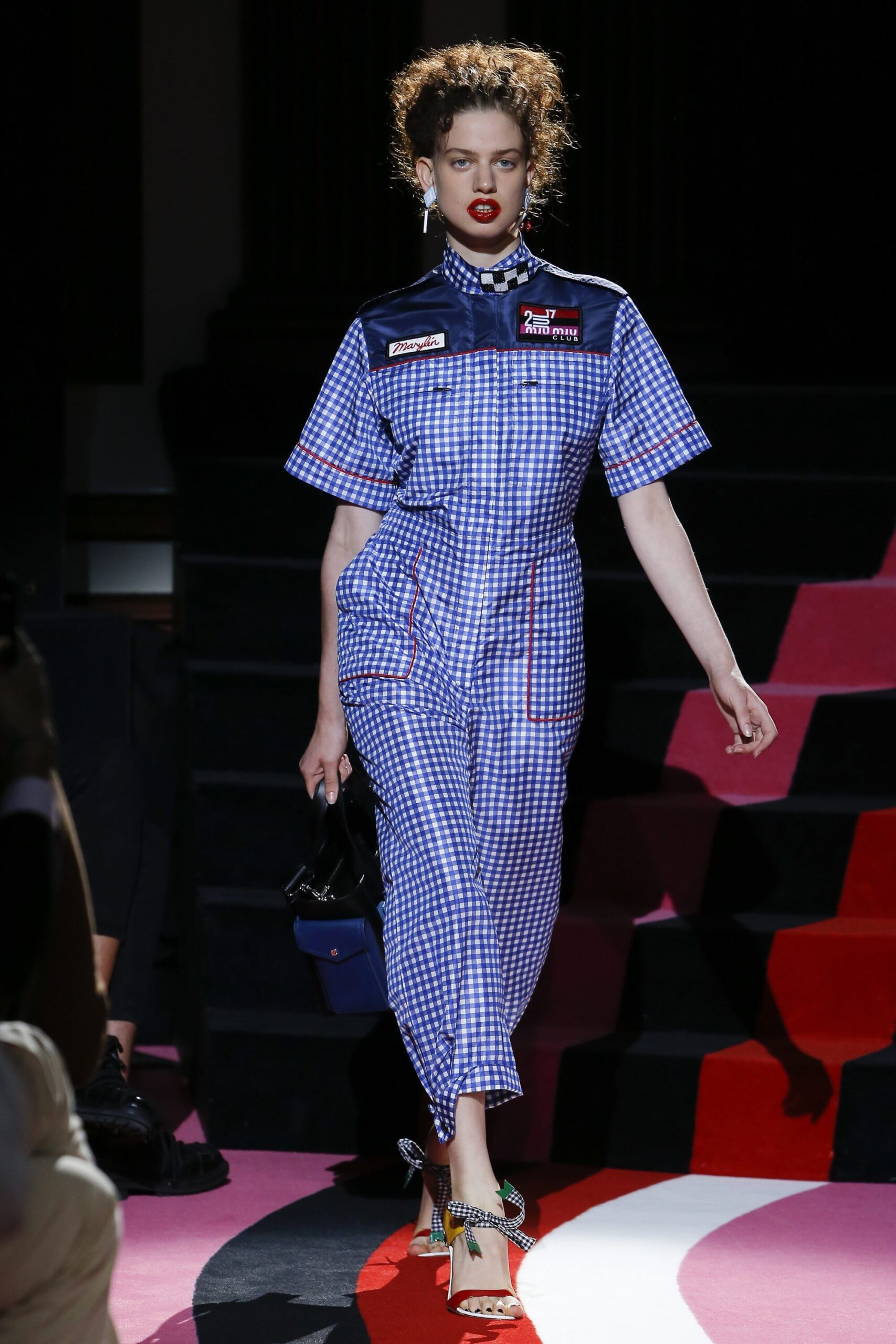Welcome to the Miu Miu club, where the drinks are, quite literally, free. We’re still drinking them. Har har. This evening Miuccia showed her Miu Miu Cruise collection in Paris, which was glamorous lady car mechanic. Which meant Miu Miu-branded boiler suits, some short, some full length, some tied around the waist, demonstrated on lady supermodels Adwoa Aboah, Bella Hadid, Kendall Jenner et al. Sexy and practical. Very into it. As Garth said; “saves deciding what you’re going to wear in the morning, non?”