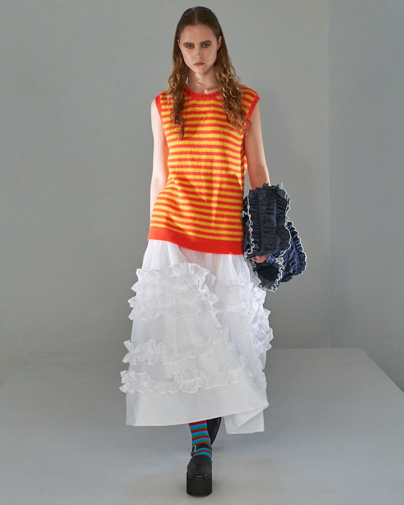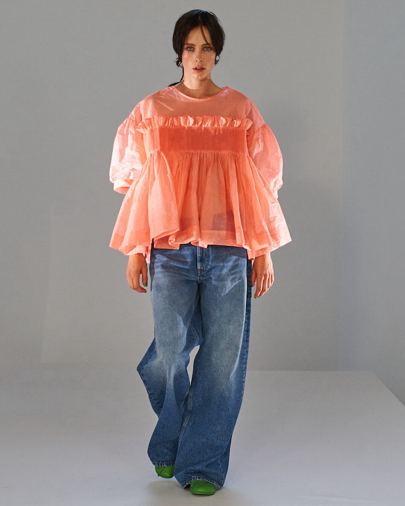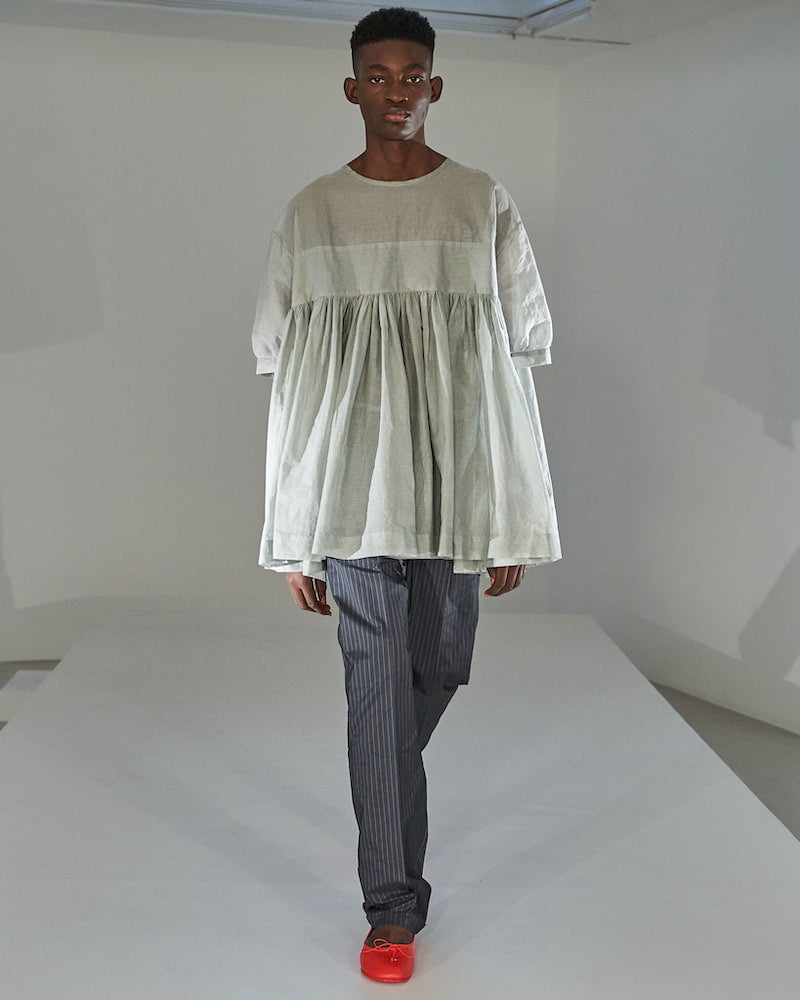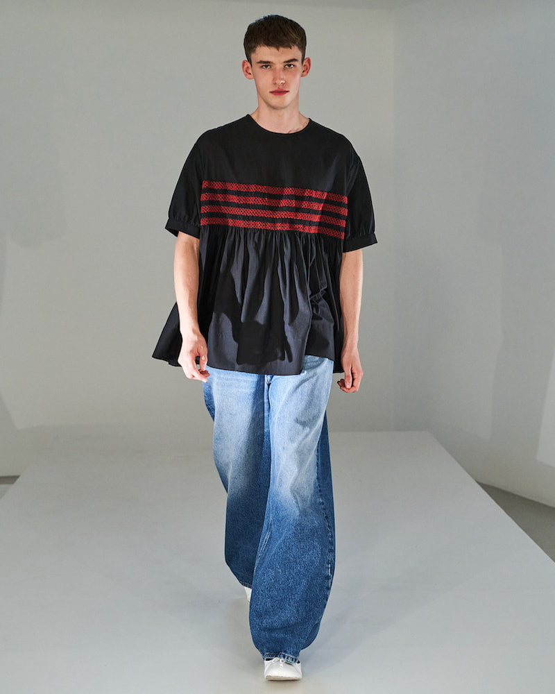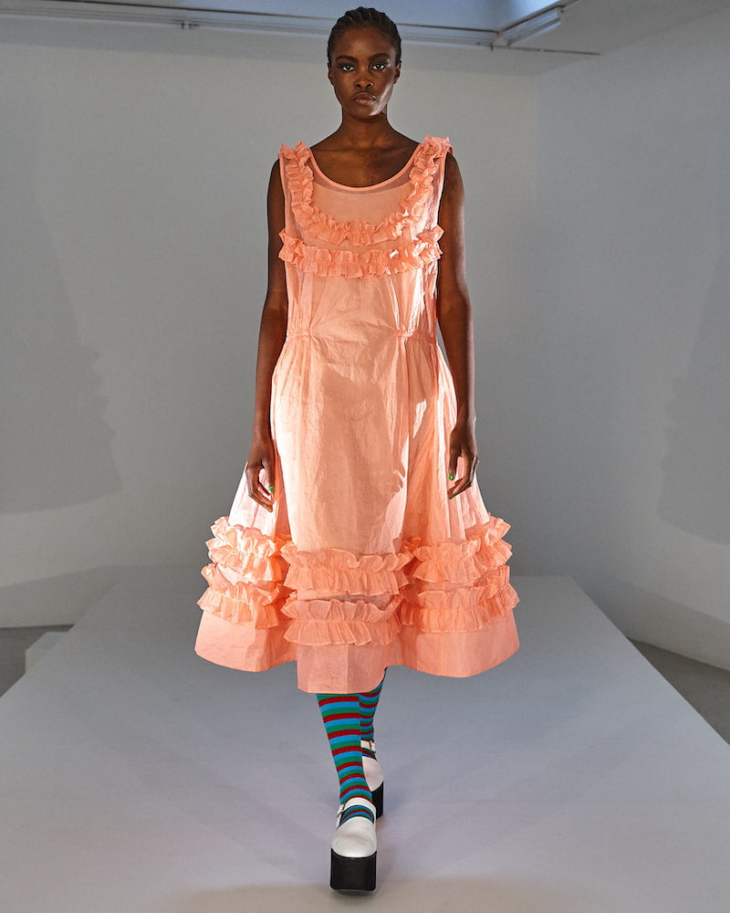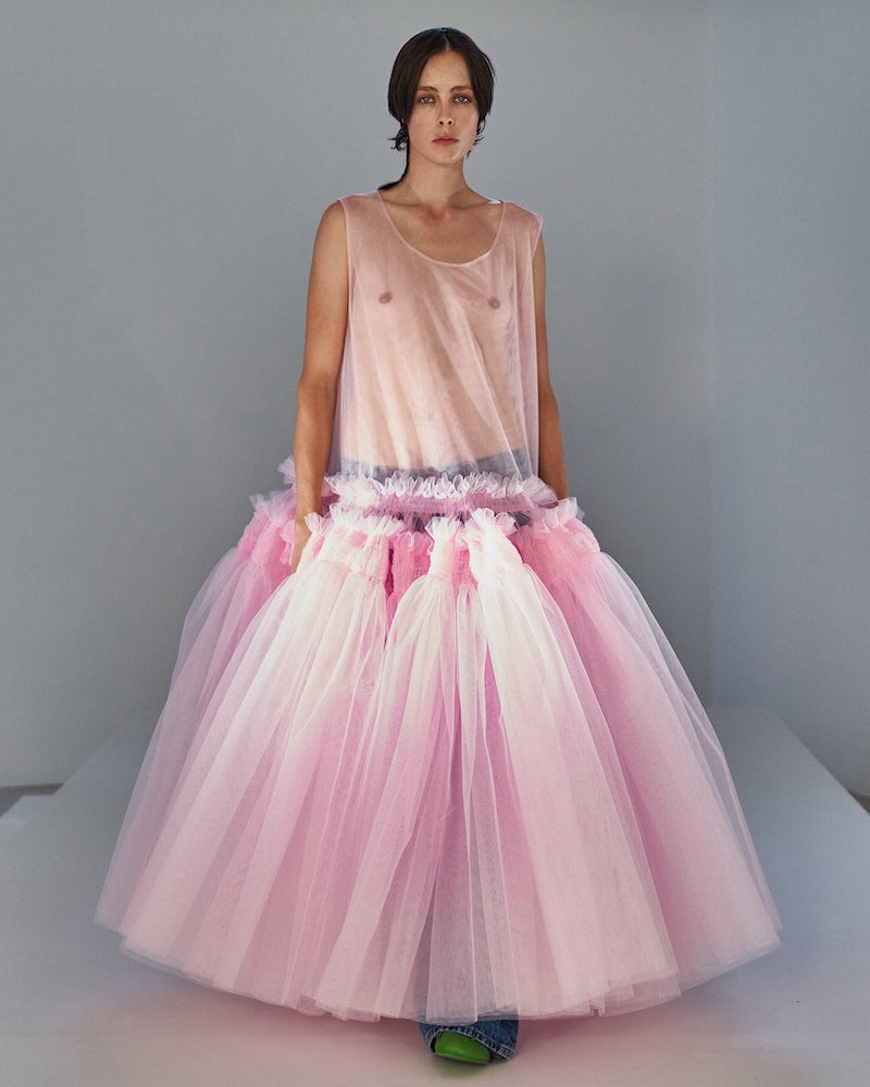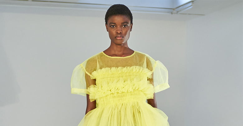 Molly Goddard designed her SS22 collection whilst eight months pregnant. That provided ready-made inspiration for a collection that turned mini-me dressing on its head. “I blew up baby clothes I wore as a child to adult size, tracing the pattern and making it 10 or 20 times bigger,” she explained. It’s an idea she’d explored in her graduation collection, which established her smock-tastic signature style and those beloved Molly Goddard smocks have huge appeal.