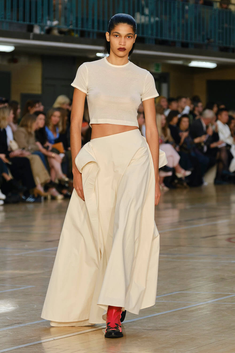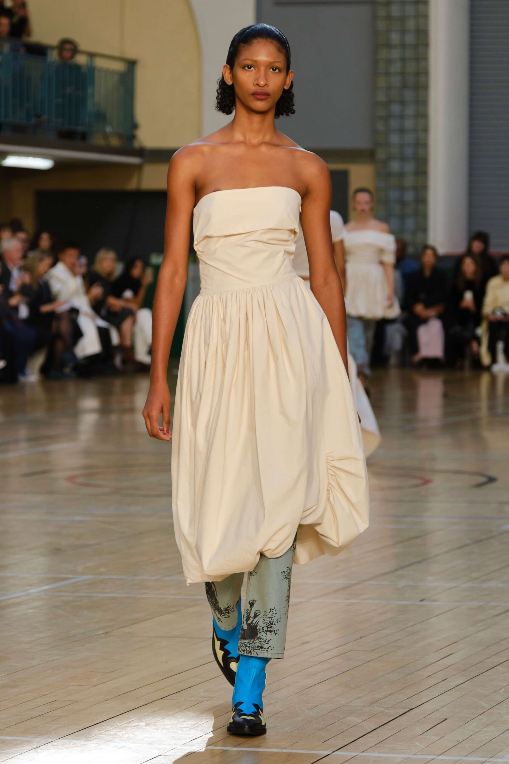 Goddard wanted the show to be “slower, messier, more spacious”, with models criss-crossing each other inside the Seymour Leisure Centre. They wore baggy jeans beneath their dresses and sheer skirts, while the brand’s quickly expanding menswear output featured shirred shirts and hooded cardies. Despite their prettiness, these clothes are for living in.