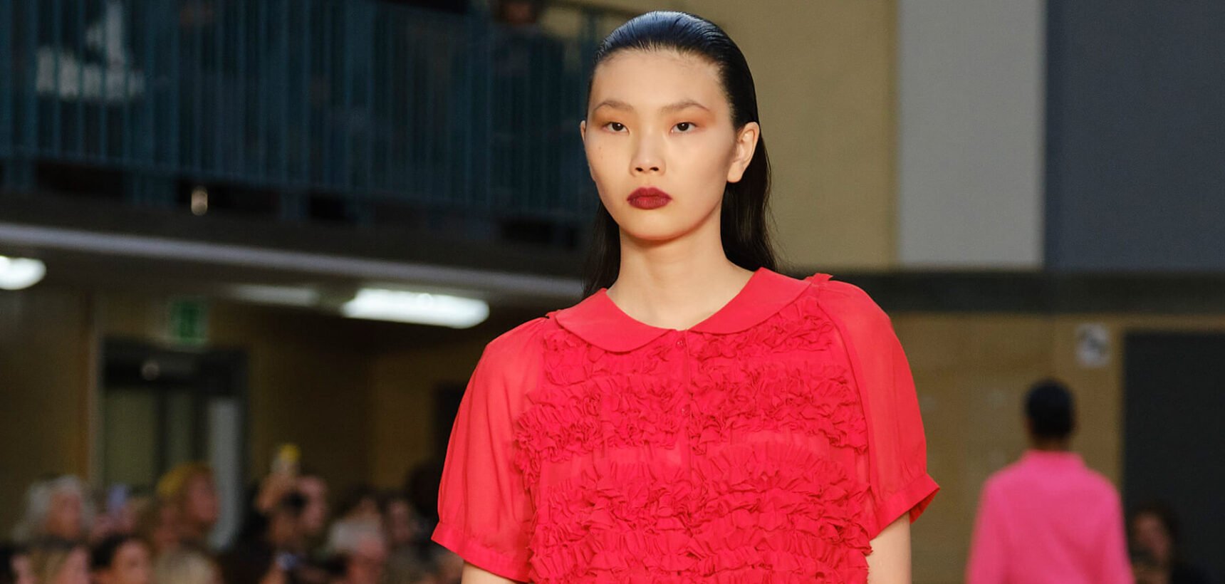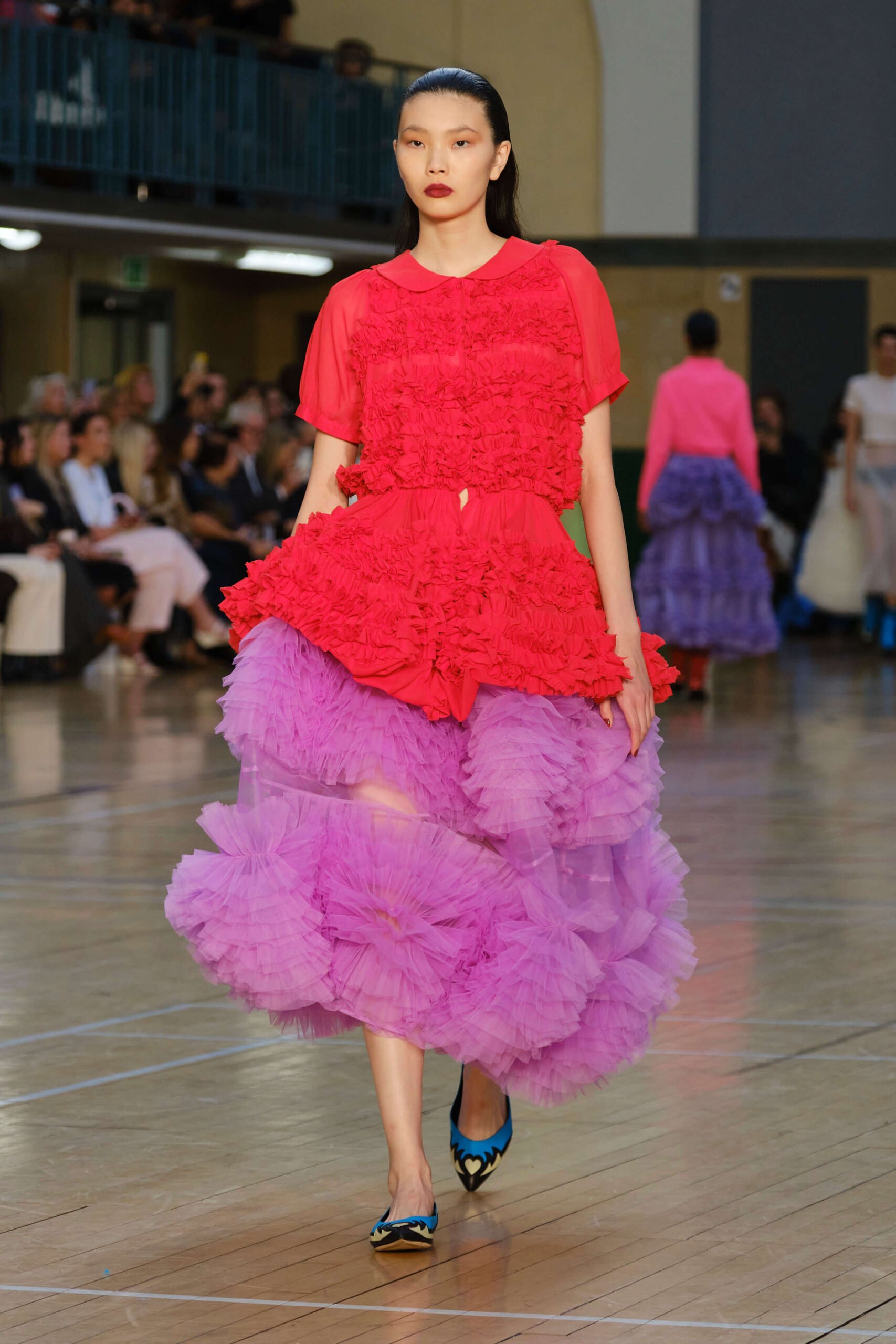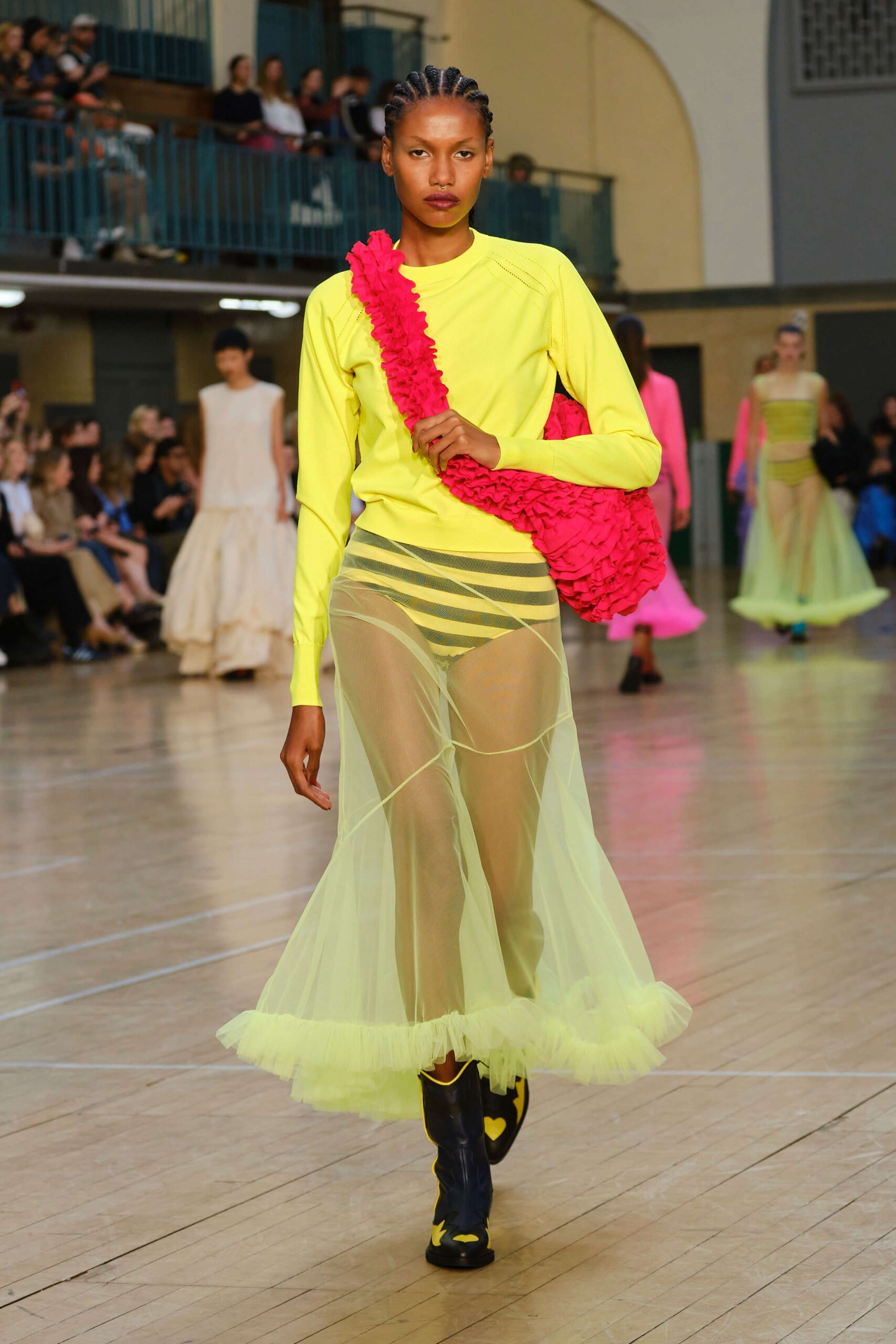 There are few joys in fashion which match the final procession of a Molly Goddard show. Her signature frocks which froth with tulle and taffeta are like the sweetest confectionaries you’d find displayed in your favourite bakery. This season’s delightful shades of raspberry, sorbet yellow, neon green and icing white only added to their desirability.