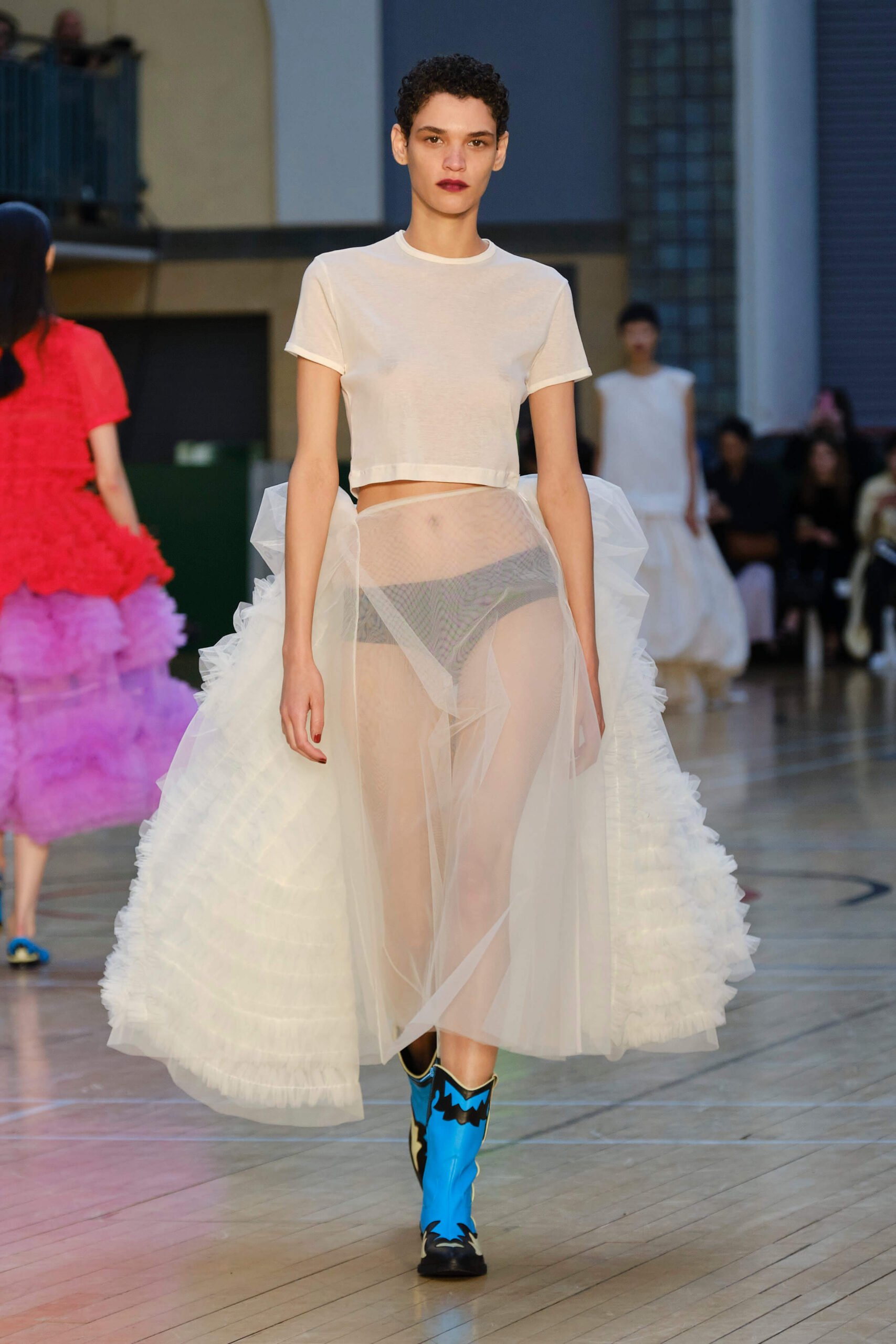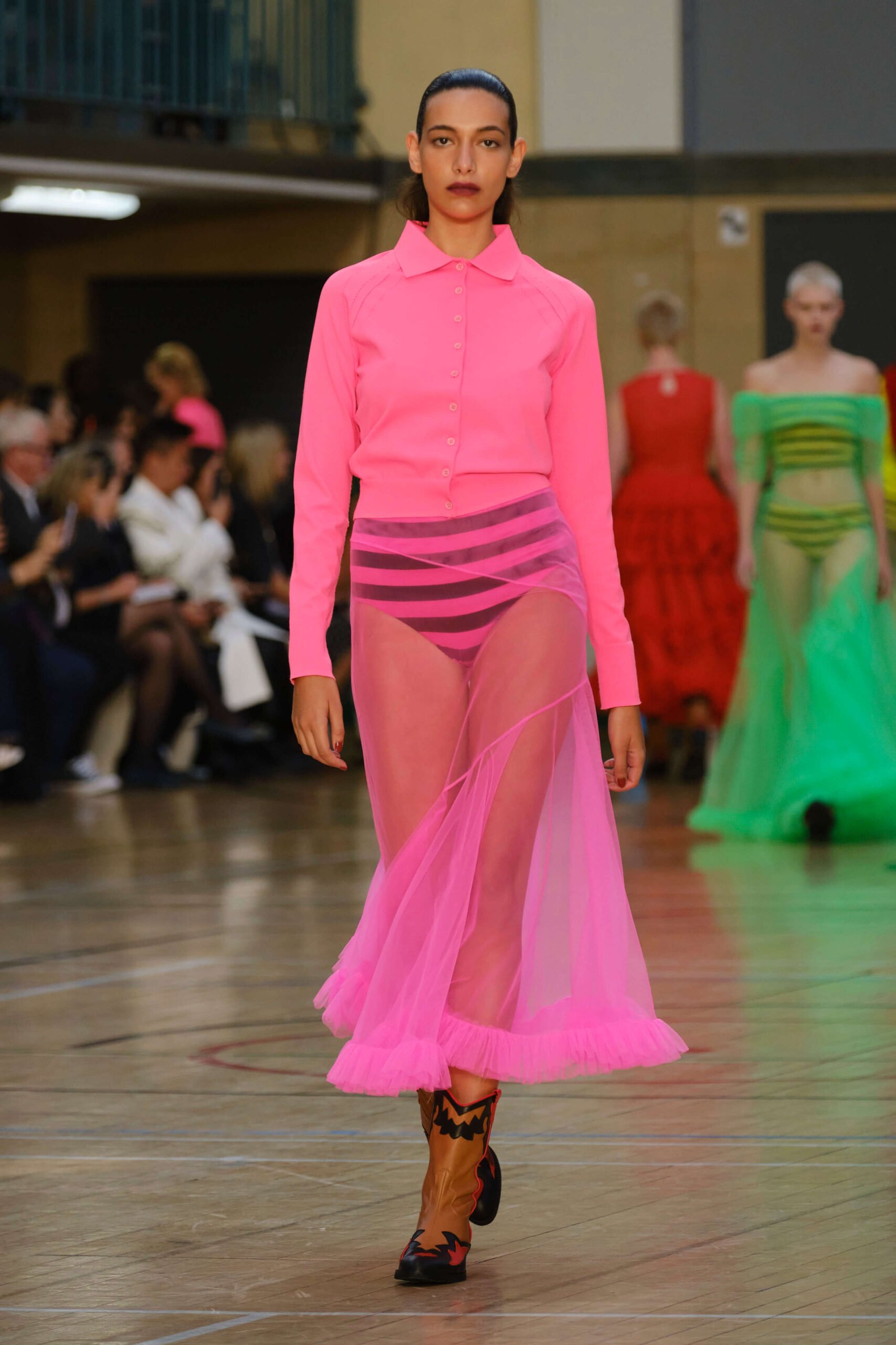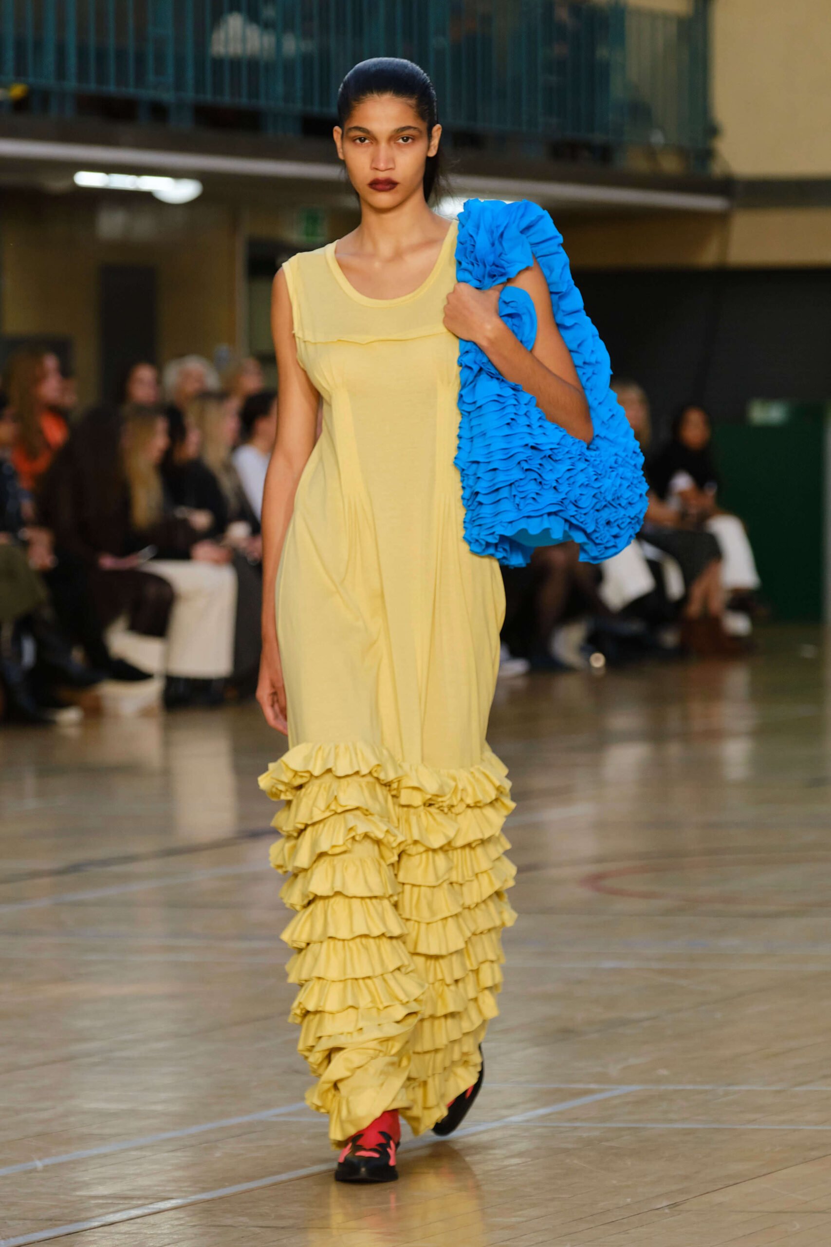There are few joys in fashion which match the final procession of a Molly Goddard show. Her signature frocks which froth with tulle and taffeta are like the sweetest confectionaries you’d find displayed in your favourite bakery. This season’s delightful shades of raspberry, sorbet yellow, neon green and icing white only added to their desirability.