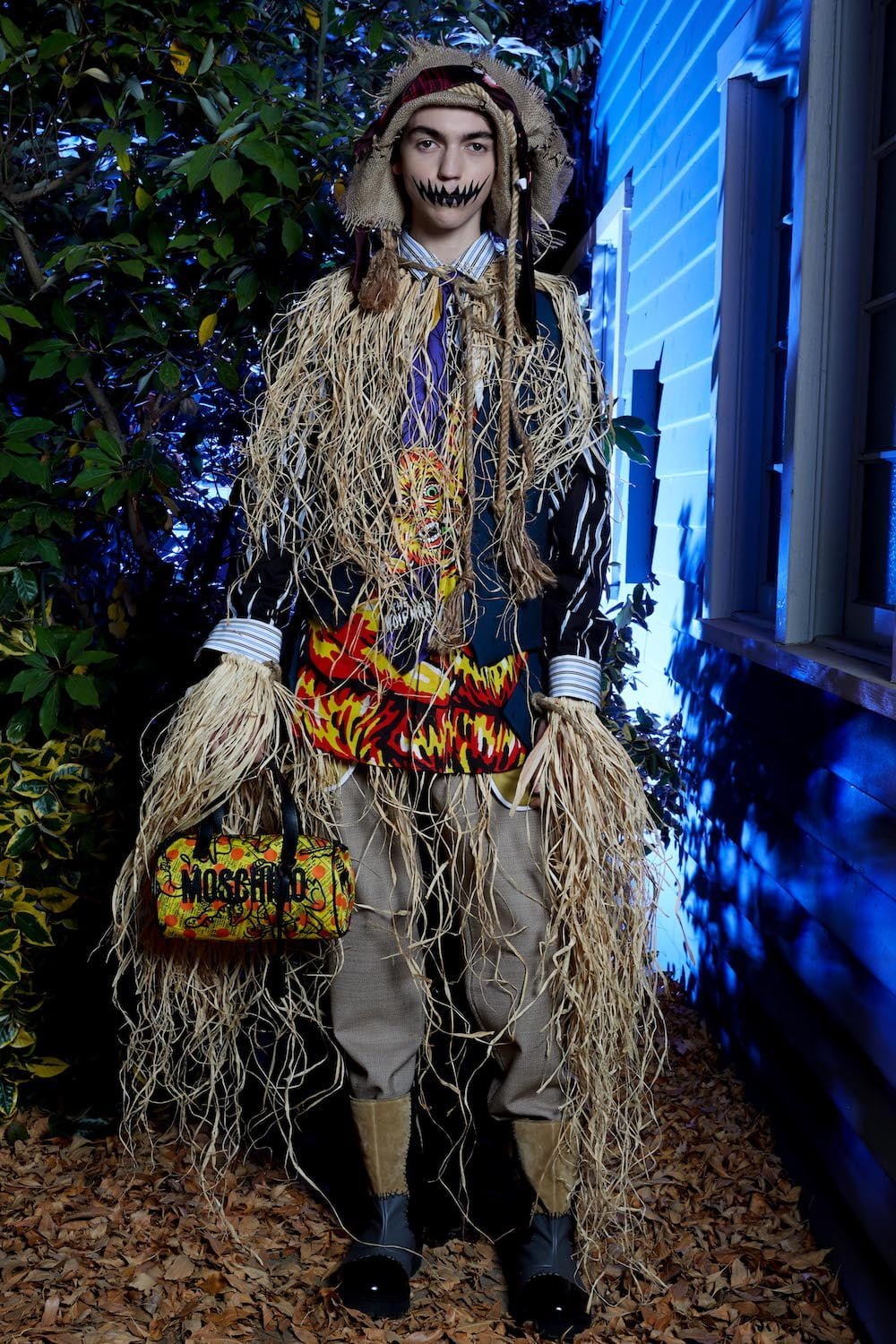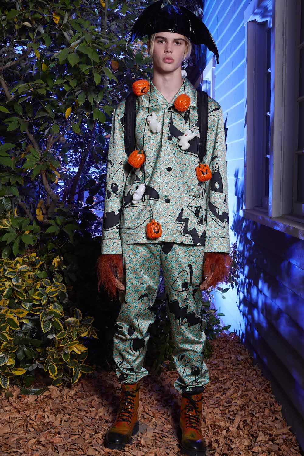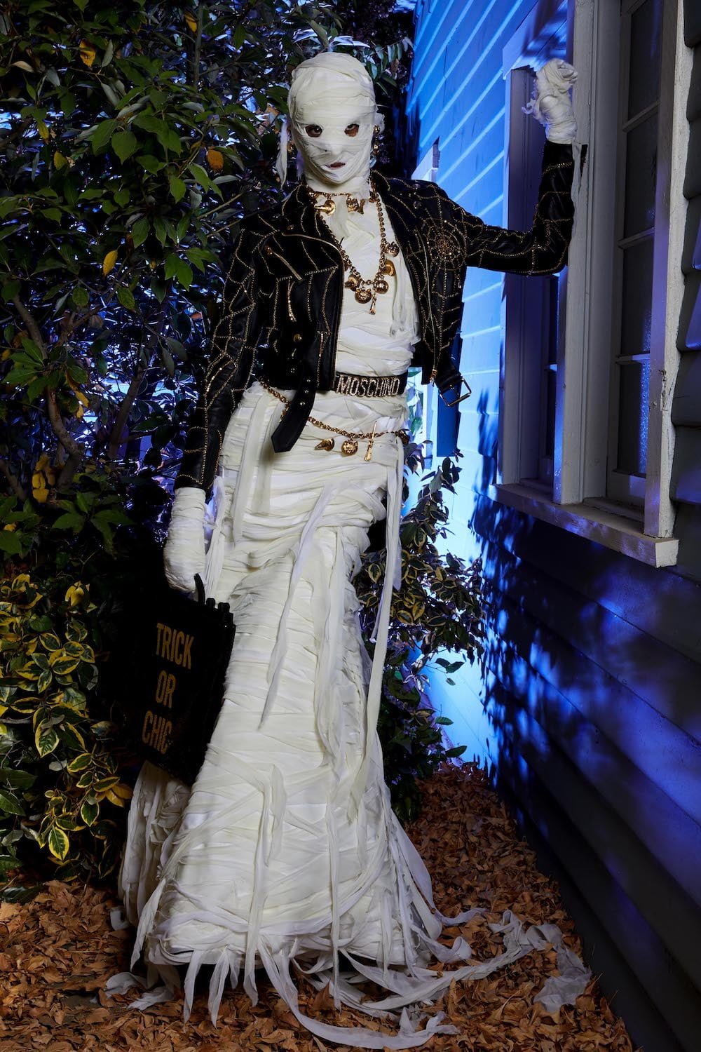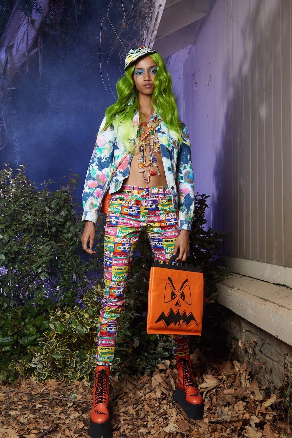 Once upon a time in Hollywood… Yes, these events are based on a true story. A Hollywood horror film directed by Jeremy Scott. Moschino madness. This is Spooky Couture, hear them scream. Fade in… The exterior of American suburbia. When Drew Barrymore’s Casey asked Ghostface: “What do you want?” He replied: “To see your insides.” Scream is one of Scott’s favourite horror film, as he told us backstage before the show. And so we watched Suki Waterhouse as Casey open the show, blood-curdling shrieking and squealing as she ran down Colonial Street at Universal Studios before Scott’s slew of monsters invaded sweet suburbia. Why suburbia? “It’s always the idealistic, beautifully manicured, perfect place where something so sinister happens because everyone’s guards are down. They think it’s so wonderful and serene and safe and then the spooks come out. It’s always a normal place and then… BOO!” Zombies and mummies and corpse brides, oh my. Spiders crawled over fairy floss sequin covered dresses and witches slinked by in silky slip dresses in bone white and blood red. Ghouls shrieked on bouncy tutus and safety pins slicked through the heads of suited up boys. Get ’em. Yes, the boys. They stomped in combat boots and beetlejuice style suits. Mouths were slashed and masks a-maniac. Jeremy Scott’s chosen horror film soundtrack is Broken English Club’s Channel 83; a heart thumping beat mixed with horror film moments, the chanting of child serial killer ‘Mary Bell Mary Bell Child of Hell’. The Shining’s Grady twins marched in bubblegum pink platforms – as they should in the Moschino world – and Morticia Addams flounced in all her power, dripping in silky slick midnight black. A beautiful nightmare. Moschino monsters are the ones we love to have living under our bed. Here’s Jeremy!