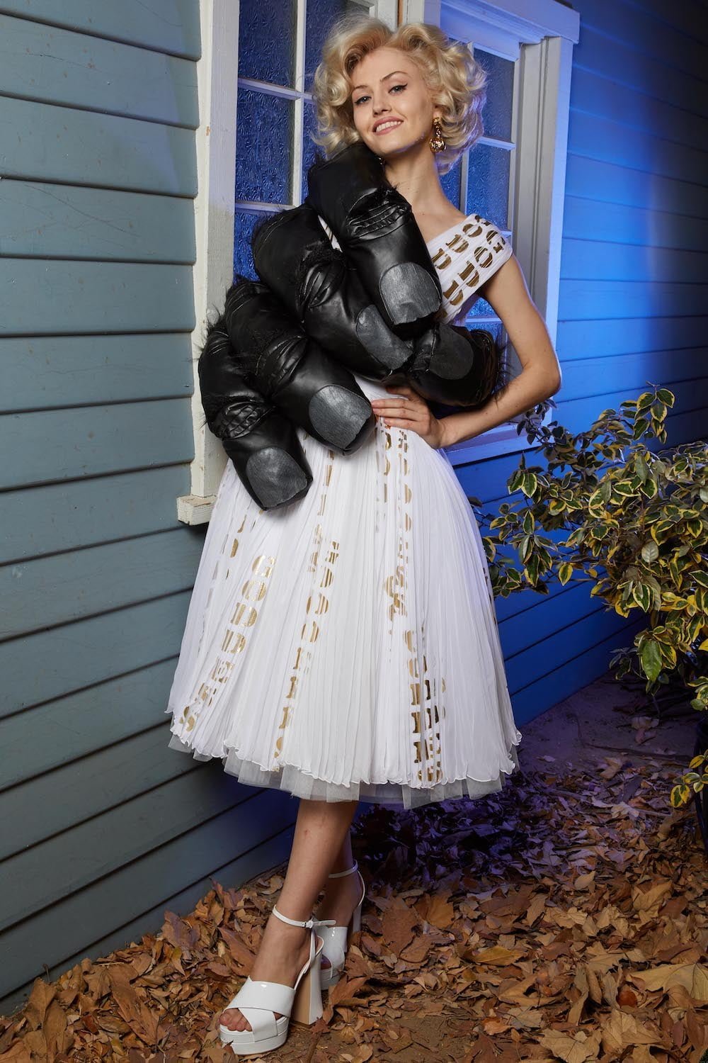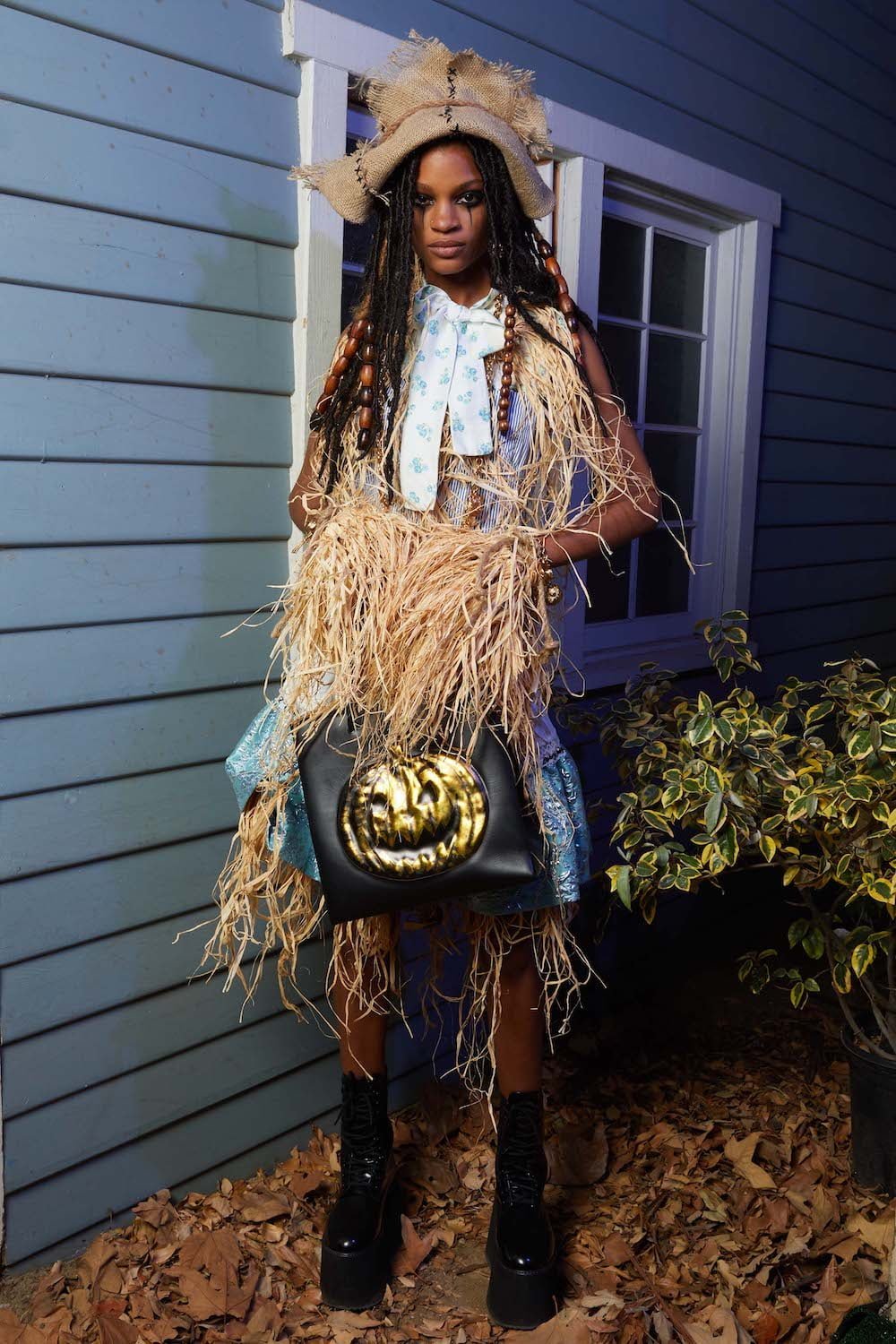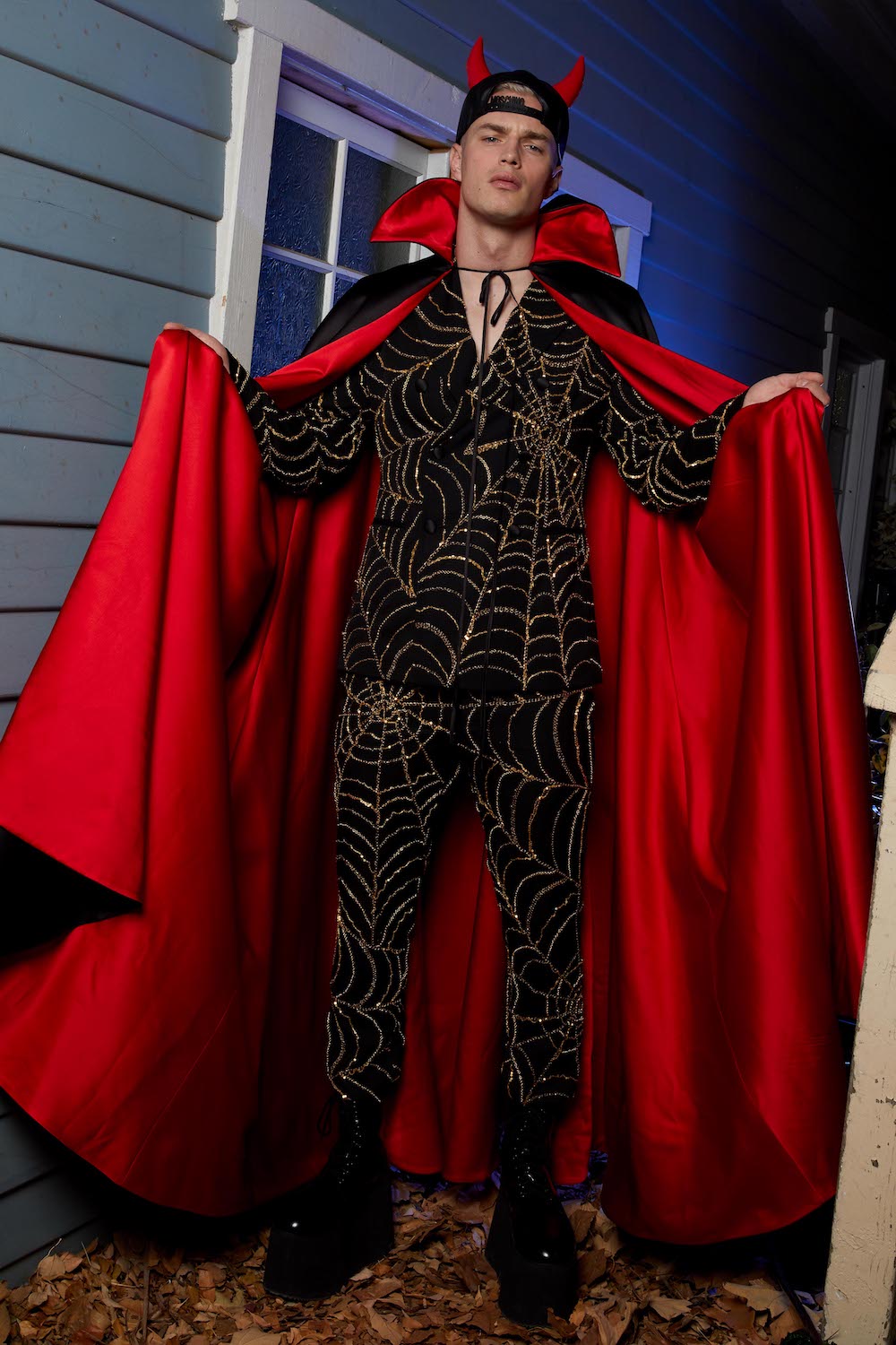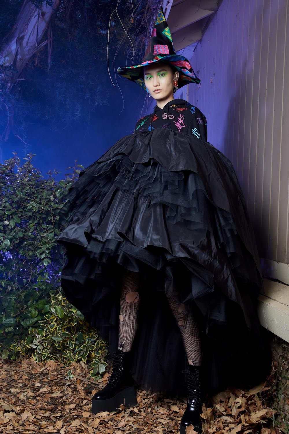 Once upon a time in Hollywood… Yes, these events are based on a true story. A Hollywood horror film directed by Jeremy Scott. Moschino madness. This is Spooky Couture, hear them scream. Fade in… The exterior of American suburbia. When Drew Barrymore’s Casey asked Ghostface: “What do you want?” He replied: “To see your insides.” Scream is one of Scott’s favourite horror film, as he told us backstage before the show. And so we watched Suki Waterhouse as Casey open the show, blood-curdling shrieking and squealing as she ran down Colonial Street at Universal Studios before Scott’s slew of monsters invaded sweet suburbia. Why suburbia? “It’s always the idealistic, beautifully manicured, perfect place where something so sinister happens because everyone’s guards are down. They think it’s so wonderful and serene and safe and then the spooks come out. It’s always a normal place and then… BOO!” Zombies and mummies and corpse brides, oh my. Spiders crawled over fairy floss sequin covered dresses and witches slinked by in silky slip dresses in bone white and blood red. Ghouls shrieked on bouncy tutus and safety pins slicked through the heads of suited up boys. Get ’em. Yes, the boys. They stomped in combat boots and beetlejuice style suits. Mouths were slashed and masks a-maniac. Jeremy Scott’s chosen horror film soundtrack is Broken English Club’s Channel 83; a heart thumping beat mixed with horror film moments, the chanting of child serial killer ‘Mary Bell Mary Bell Child of Hell’. The Shining’s Grady twins marched in bubblegum pink platforms – as they should in the Moschino world – and Morticia Addams flounced in all her power, dripping in silky slick midnight black. A beautiful nightmare. Moschino monsters are the ones we love to have living under our bed. Here’s Jeremy!