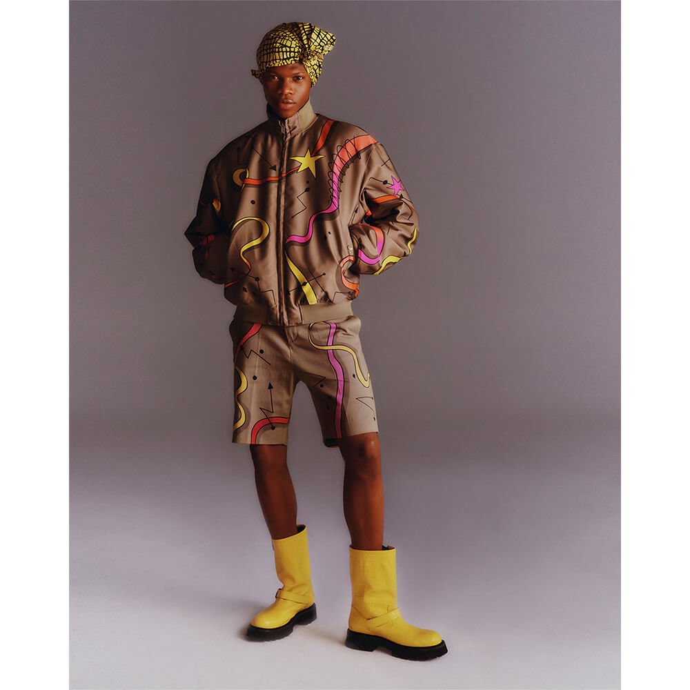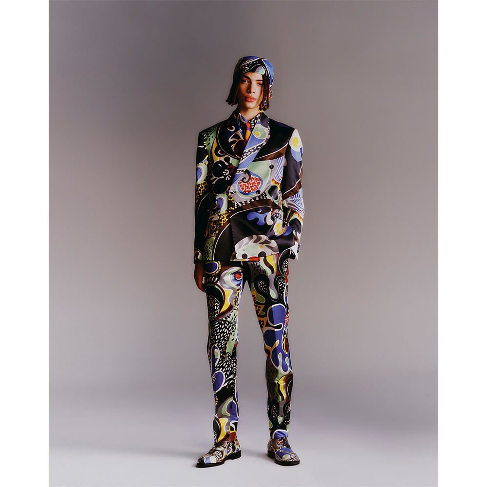 To take the fashion pack to the skies, retro styling pervades in the groovy graphics and printwork, juxtaposing multi-fabric geometrics and a motley of effervescent hues – think panelled and patched denim, eccentric trenches and bold board shorts. Elsewhere, a golden geometric upholstery print – inspired by the seats of a seventies Hawaiian Airlines DC-9 on route from Honolulu – weaves its way into expert tailoring. Next stop: floral fresco straight out of a vintage travel poster.