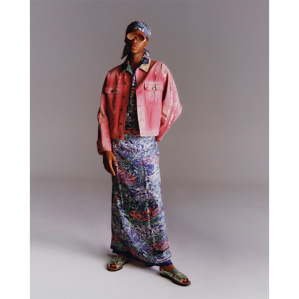 When it comes to the colours, Scott opted for a go-go palette that boasts flashes of newfangled funk and sun-soaked nostalgia. Prepare to indulge in biscuit browns and saffrons, pineapple yellow, indigo and grapefruit tie-dyed denim, alongside mod flamingo pinks, purples and saturated chartreuses. By injecting the dynamic silhouettes with a certified dose of psychedelic panache, no doubt, a sense of liberated hedonism comes embosomed throughout.