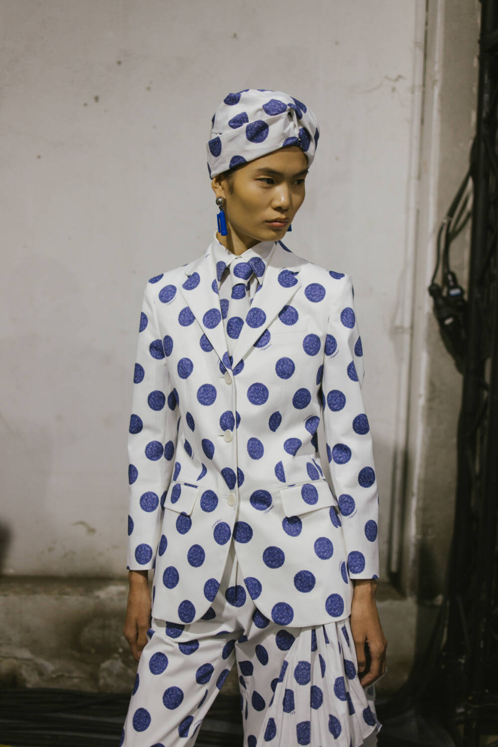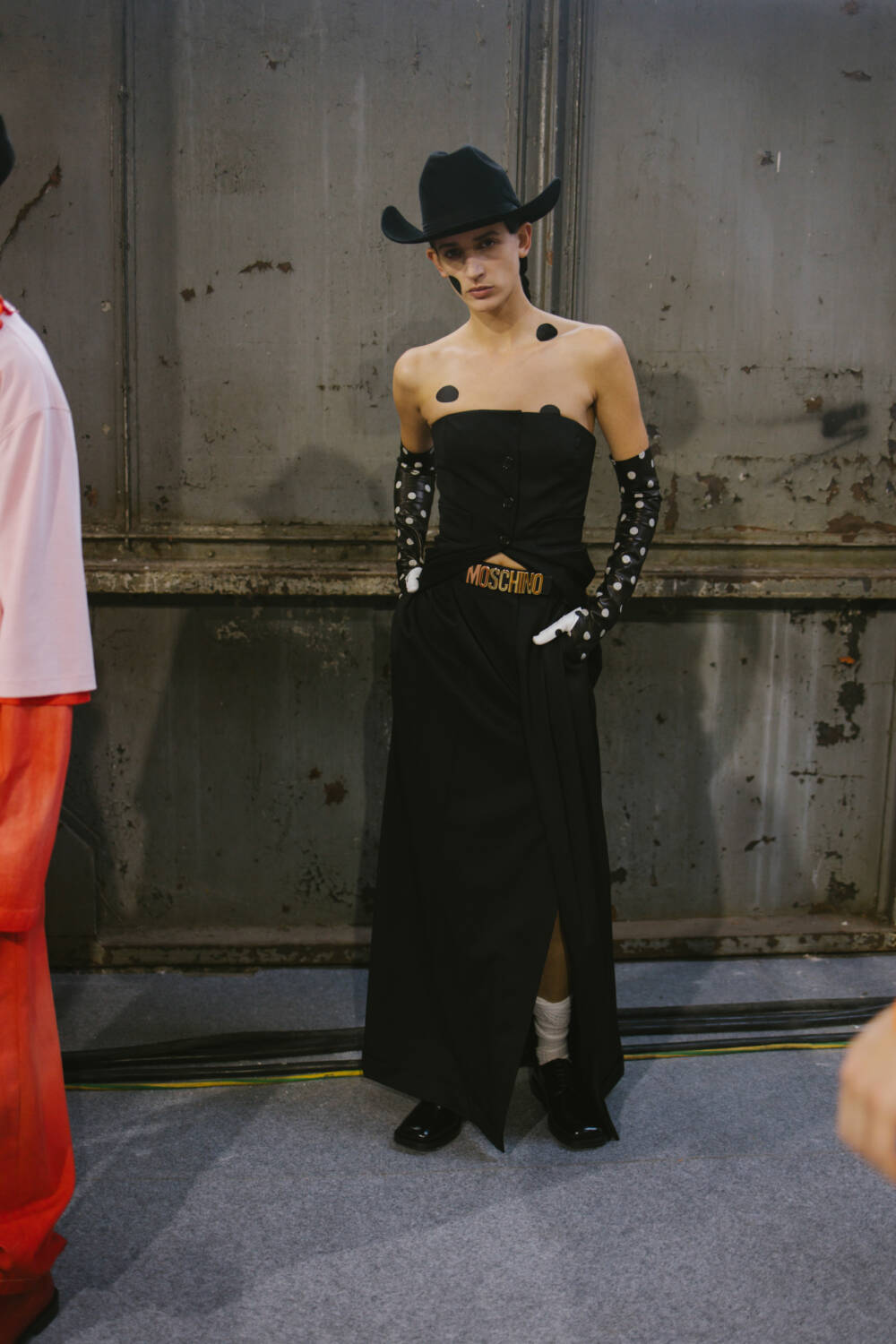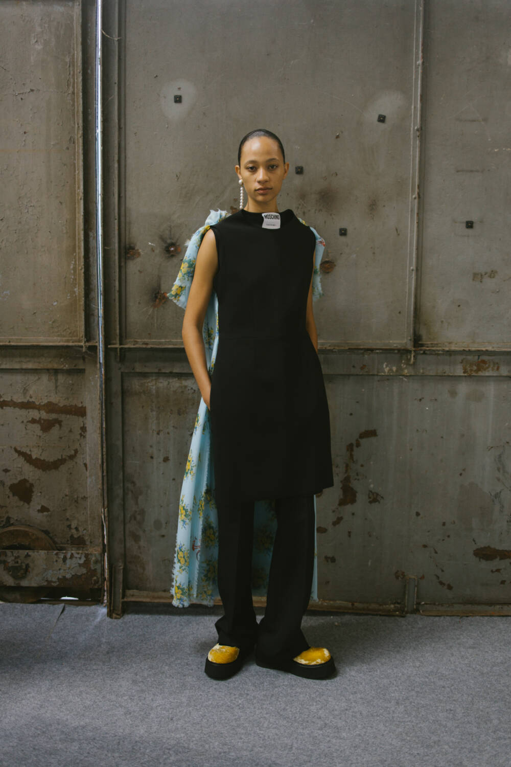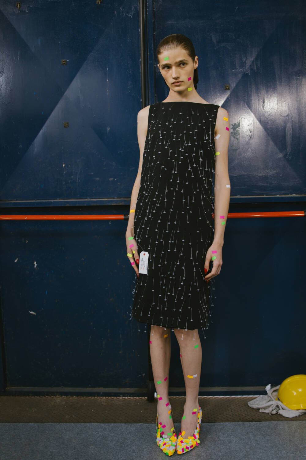 His 21st-century take on the Moschino legacy began with a photograph he found of Franco Moschino draping fabric on a mannequin – it inspired his opening looks of bed sheet gowns. The designer’s love of of making the ordinary extraordinary was expressed throughout the show, but nowhere more delightfully than on an LBD which quivered, all over, with hundreds of plastic price tags (they looked like feathers from afar). Appiolaza finds many ways to pay homage to Franco Moschino, from smiley face bags to signature polkadots that escaped the clothes and were daubed on the models skin, as well as child like drawings on the back of coats which were based on drawing Franco did as a child.