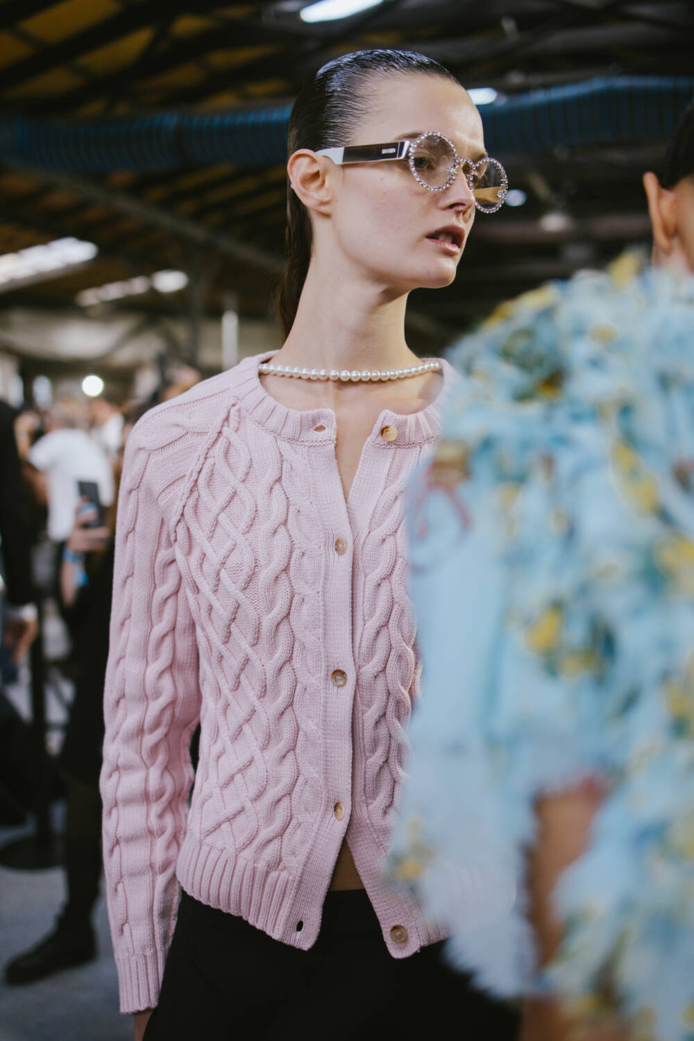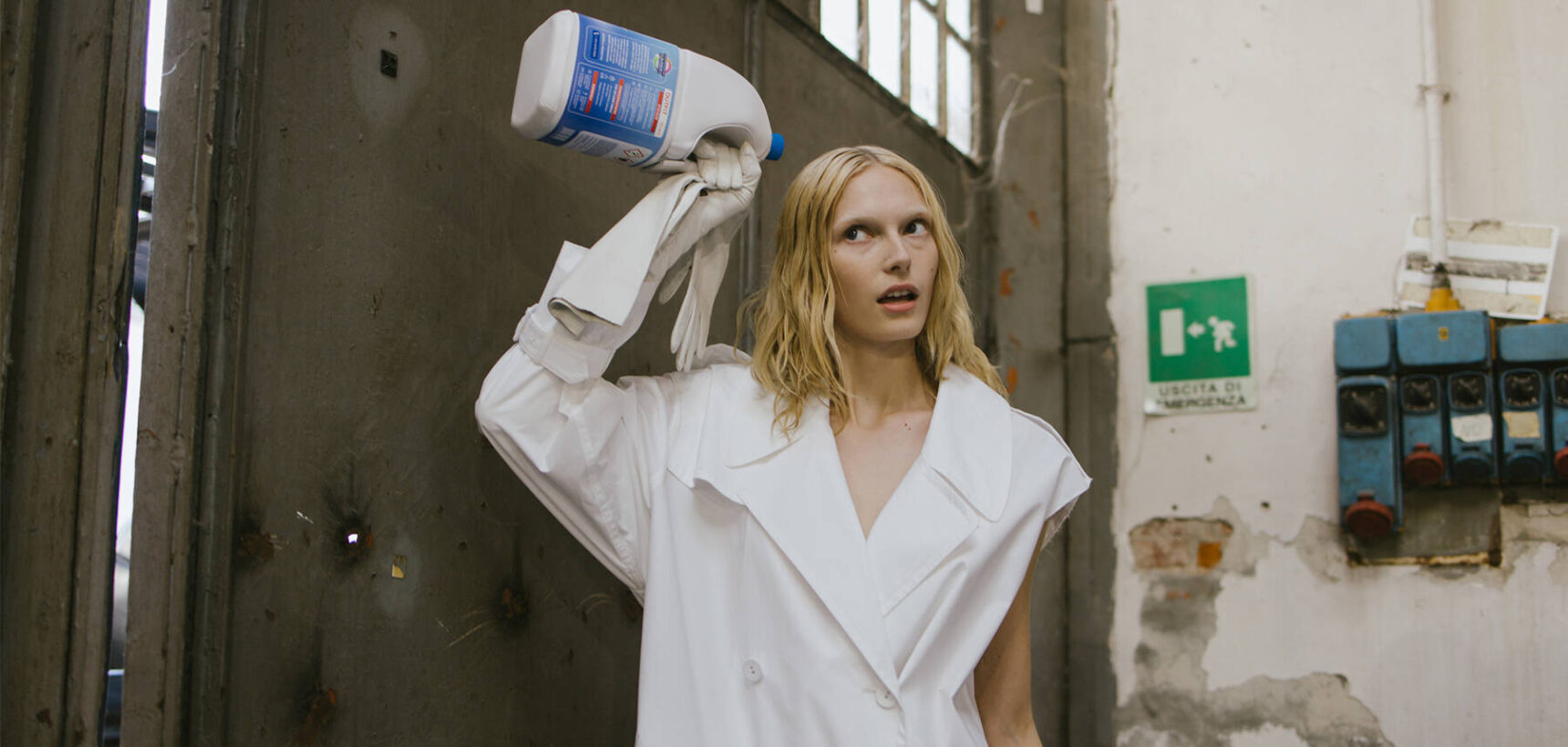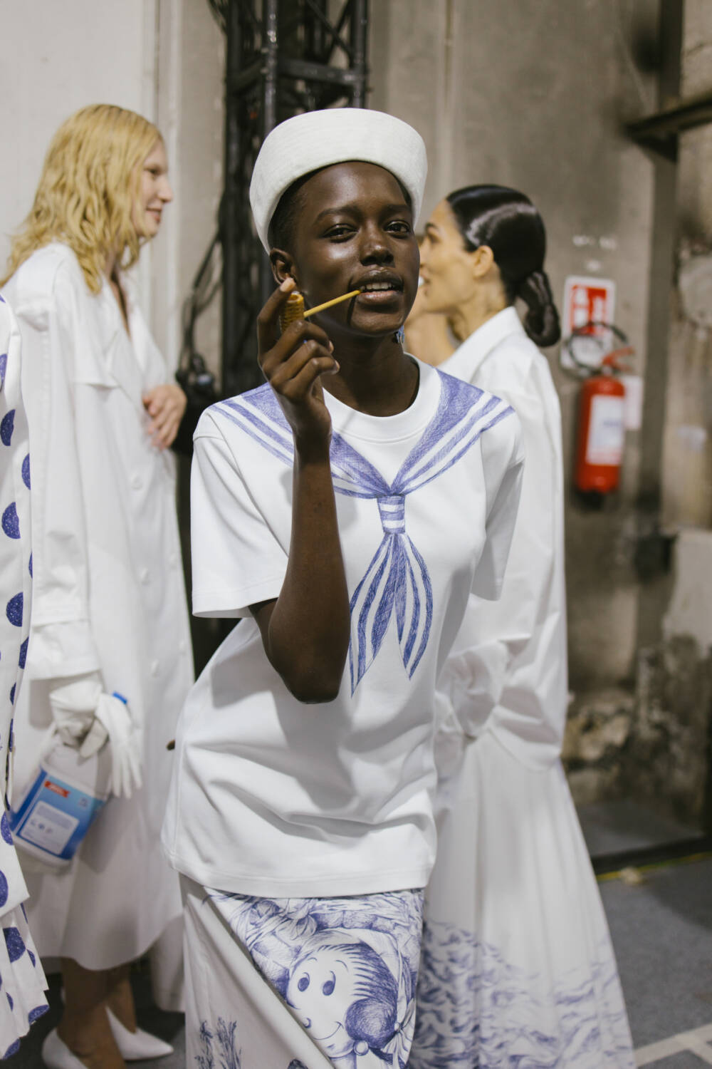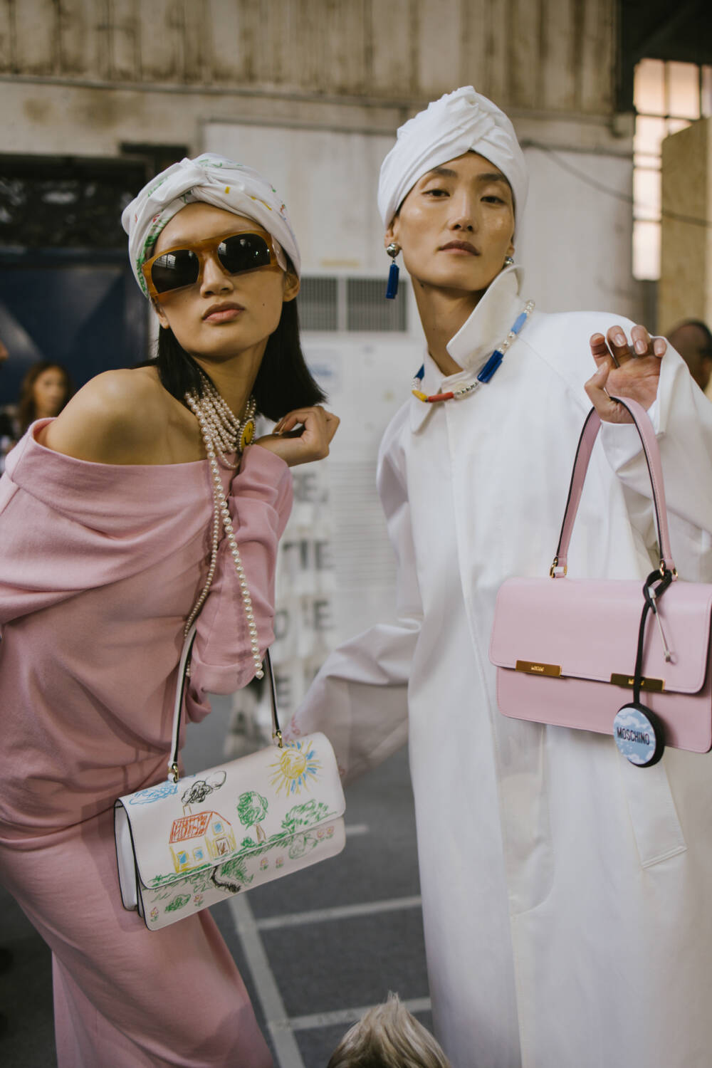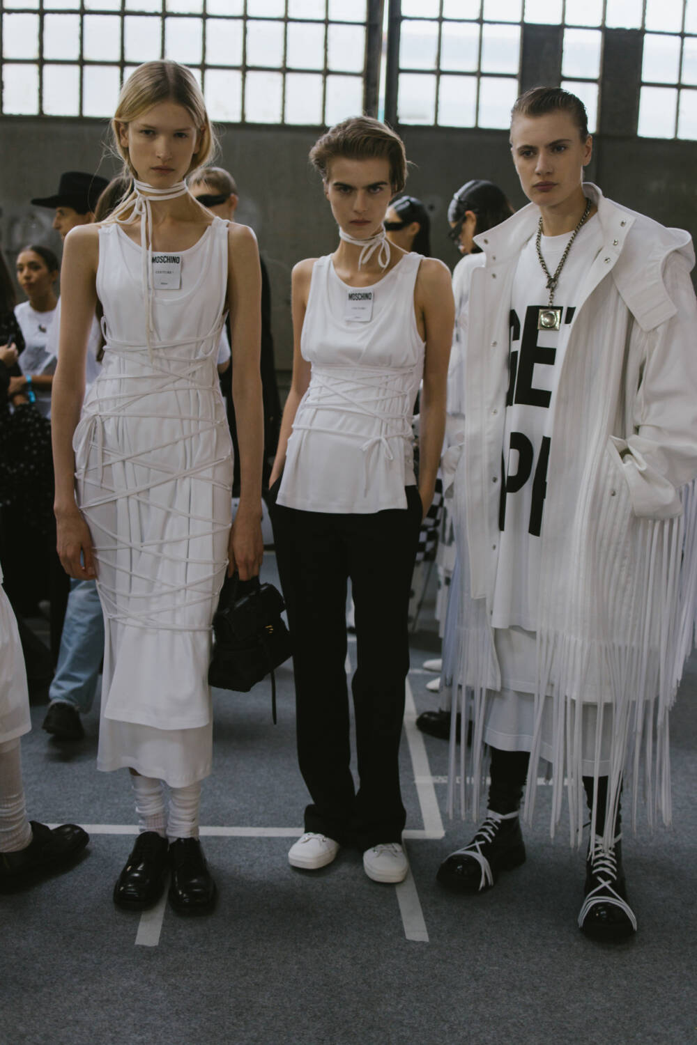 His 21st-century take on the Moschino legacy began with a photograph he found of Franco Moschino draping fabric on a mannequin – it inspired his opening looks of bed sheet gowns. The designer’s love of of making the ordinary extraordinary was expressed throughout the show, but nowhere more delightfully than on an LBD which quivered, all over, with hundreds of plastic price tags (they looked like feathers from afar). Appiolaza finds many ways to pay homage to Franco Moschino, from smiley face bags to signature polkadots that escaped the clothes and were daubed on the models skin, as well as child like drawings on the back of coats which were based on drawing Franco did as a child.