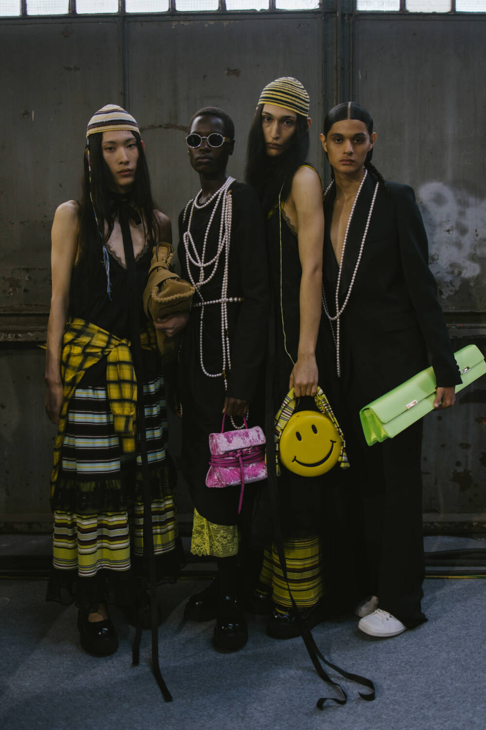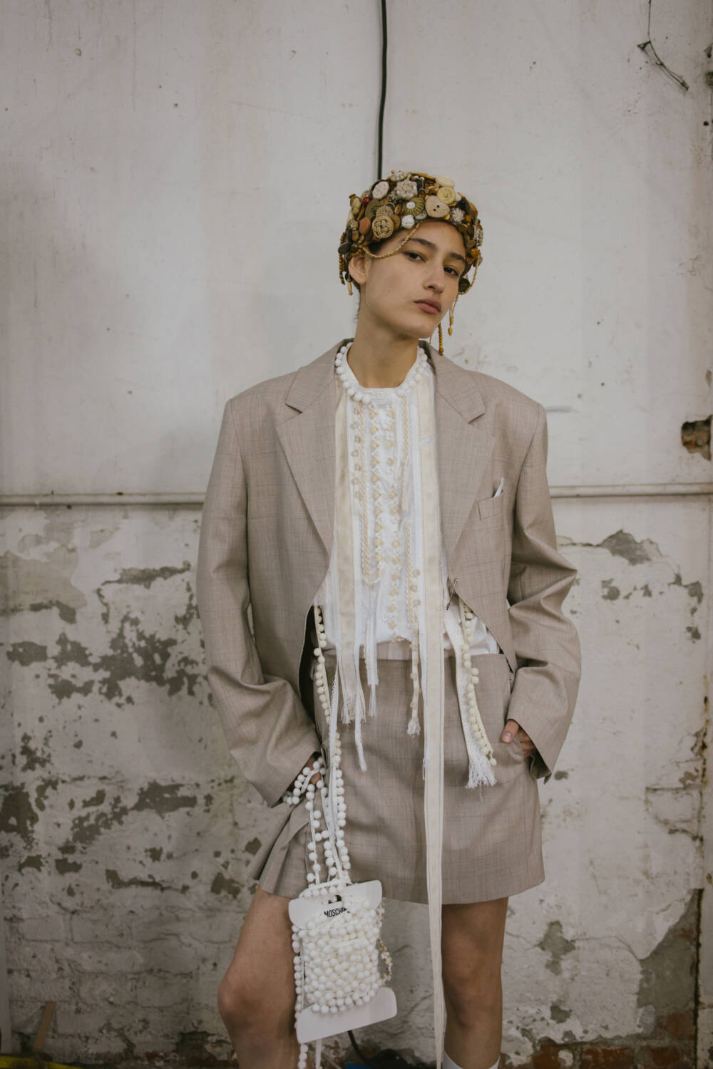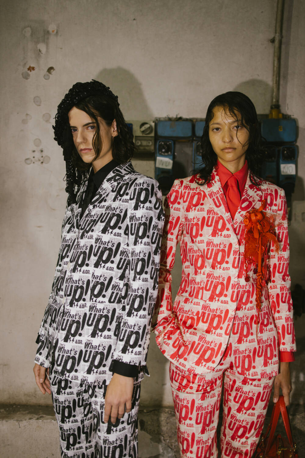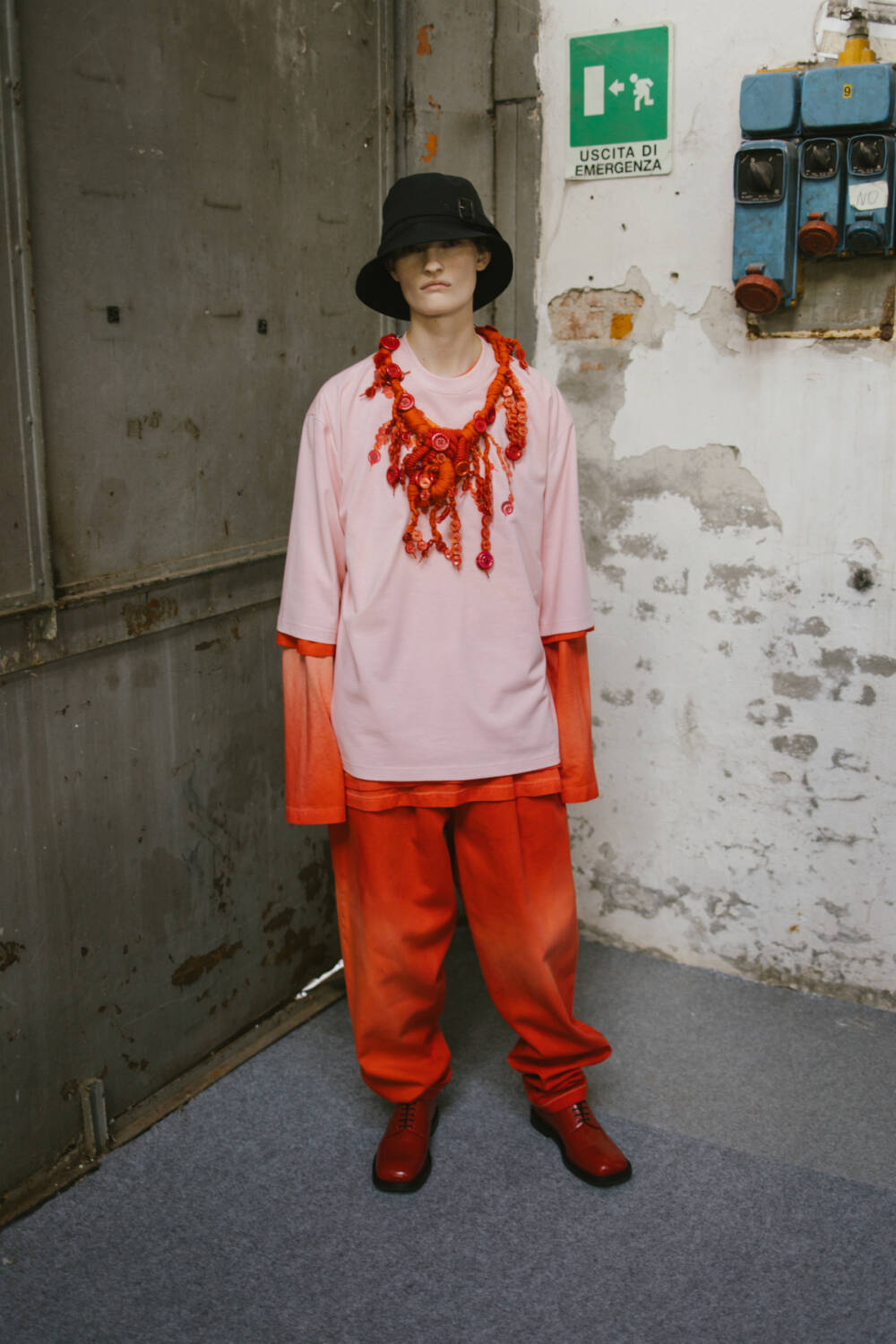 Appiolaza is also drawn to youth culture tribes and how they express their sense of belonging through clothes. He found his own tribe in fashion, through magazines like i-D where he discovered the work of influential stylist Judy Blame. The designer paid homage, asking i-D founder Terry Jones to collaborate on slogan graphics (“THINK TWICE”, “WEAR AND CARE”, “WHAT’S UP!”) and collaborating with Trust Judy Blame on trompe l’oeil T-shirts bearing his objet trouvé jewellery, which likened to band T-shirts “because we are fans.” Other looks – in a collection brimming with ideas – referenced Blame’s distinctive Buffalo silhouettes. You could feel the optimistic energy.