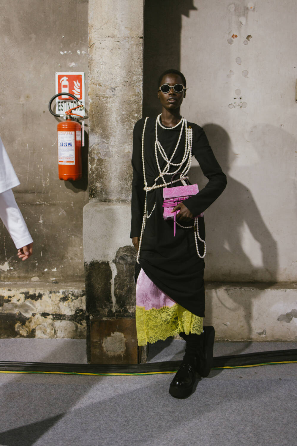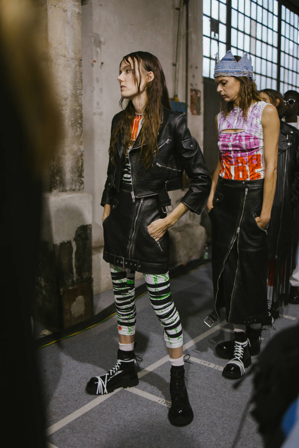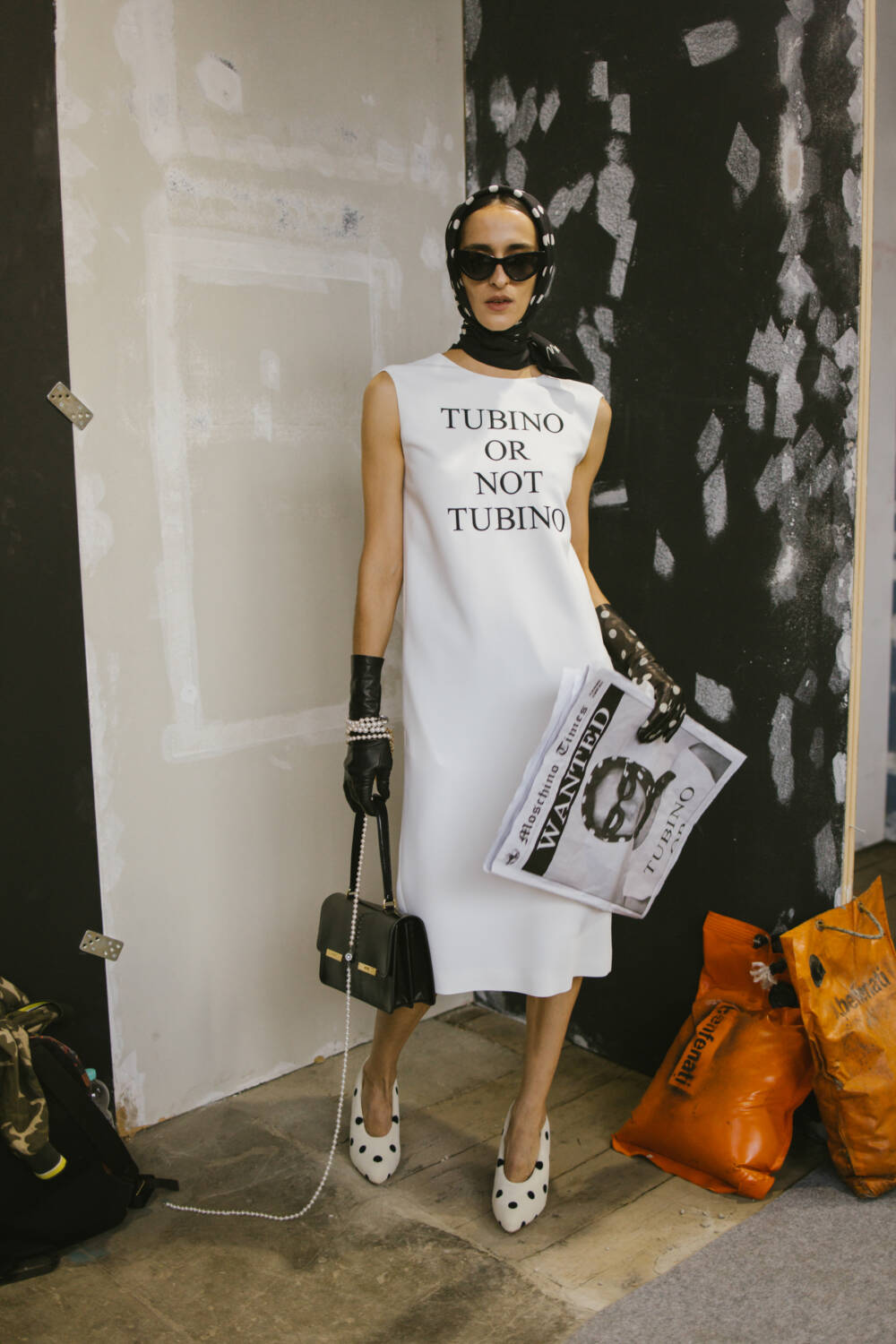 Appiolaza is also drawn to youth culture tribes and how they express their sense of belonging through clothes. He found his own tribe in fashion, through magazines like i-D where he discovered the work of influential stylist Judy Blame. The designer paid homage, asking i-D founder Terry Jones to collaborate on slogan graphics (“THINK TWICE”, “WEAR AND CARE”, “WHAT’S UP!”) and collaborating with Trust Judy Blame on trompe l’oeil T-shirts bearing his objet trouvé jewellery, which likened to band T-shirts “because we are fans.” Other looks – in a collection brimming with ideas – referenced Blame’s distinctive Buffalo silhouettes. You could feel the optimistic energy.