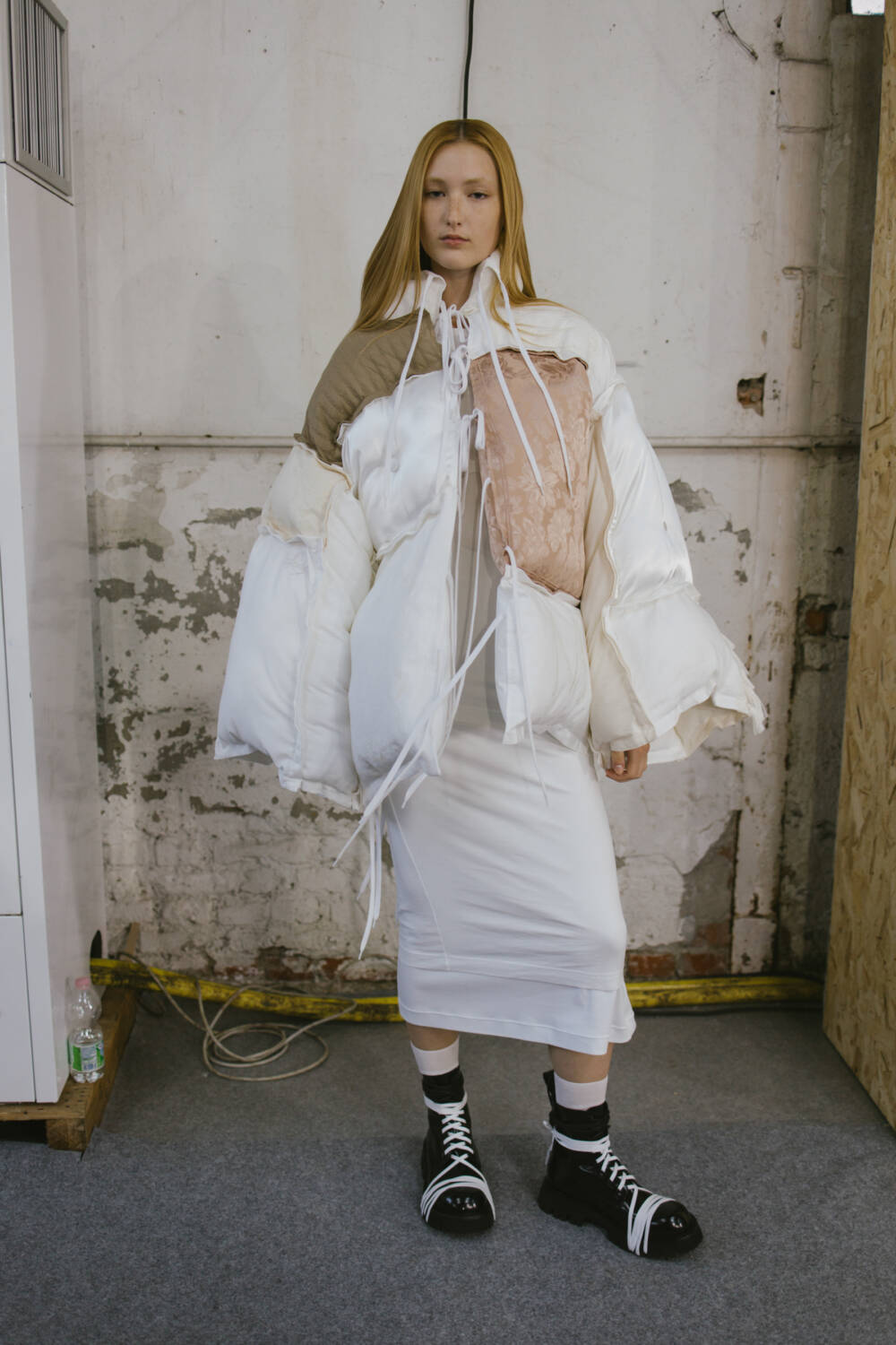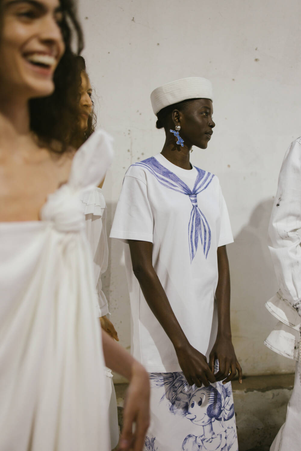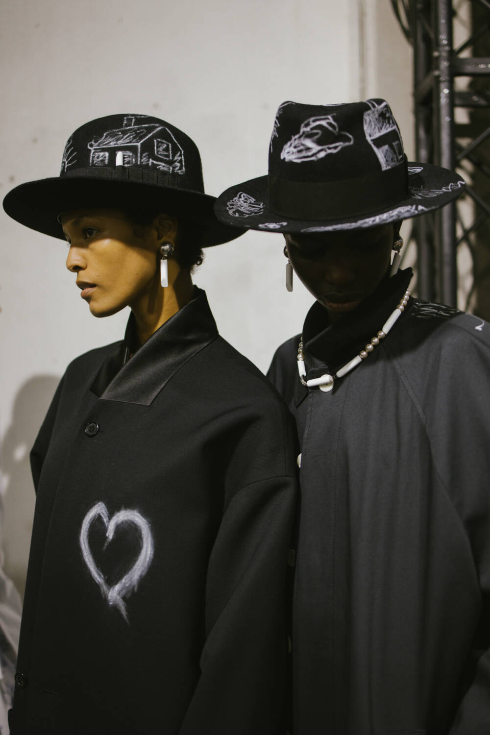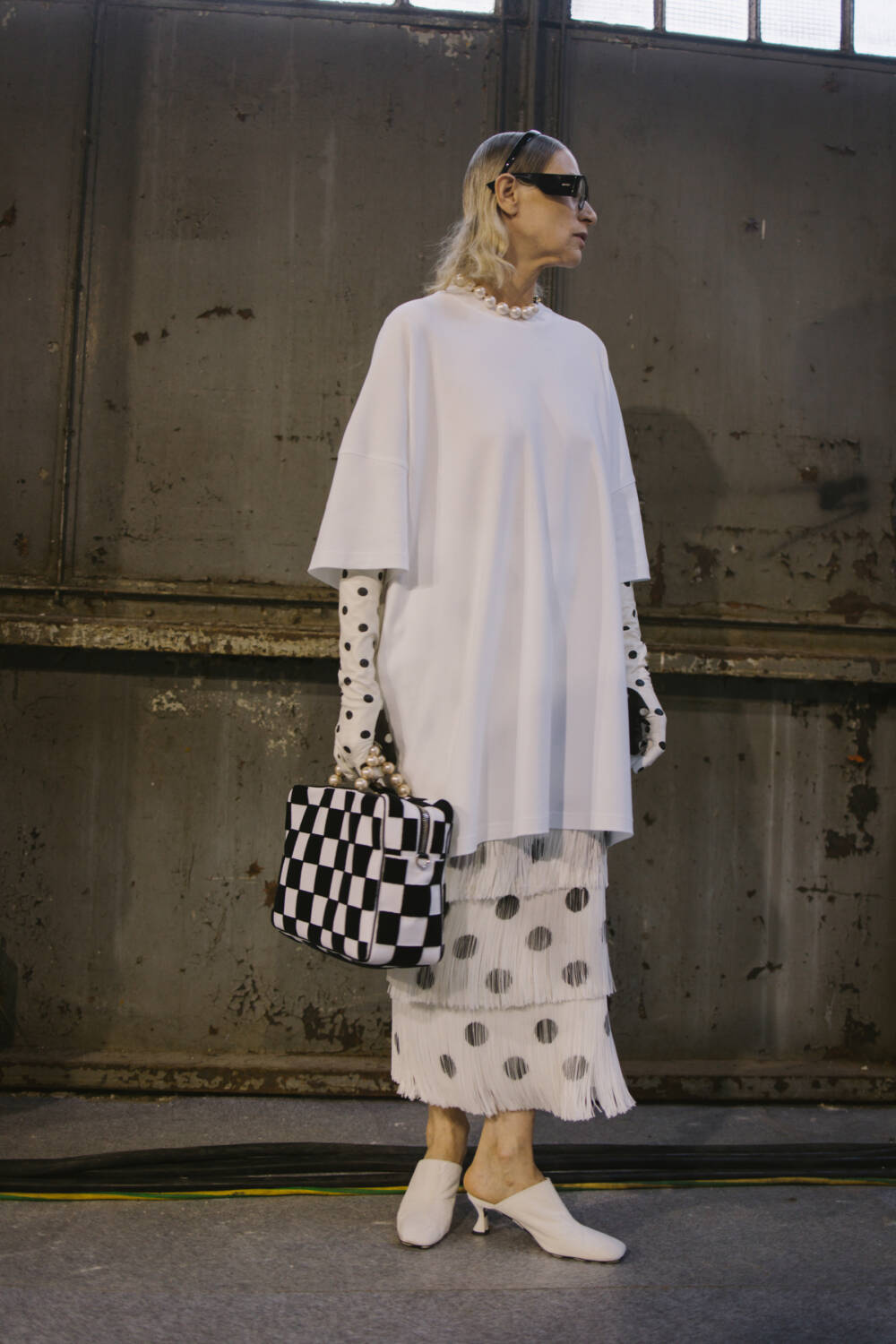 Appiolaza is also drawn to youth culture tribes and how they express their sense of belonging through clothes. He found his own tribe in fashion, through magazines like i-D where he discovered the work of influential stylist Judy Blame. The designer paid homage, asking i-D founder Terry Jones to collaborate on slogan graphics (“THINK TWICE”, “WEAR AND CARE”, “WHAT’S UP!”) and collaborating with Trust Judy Blame on trompe l’oeil T-shirts bearing his objet trouvé jewellery, which likened to band T-shirts “because we are fans.” Other looks – in a collection brimming with ideas – referenced Blame’s distinctive Buffalo silhouettes. You could feel the optimistic energy.