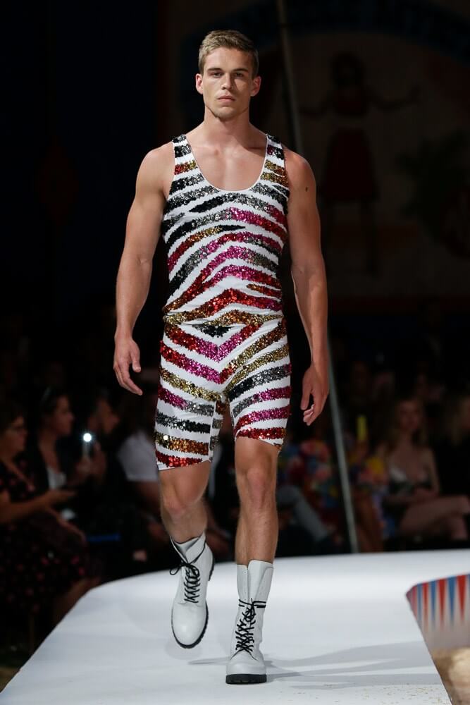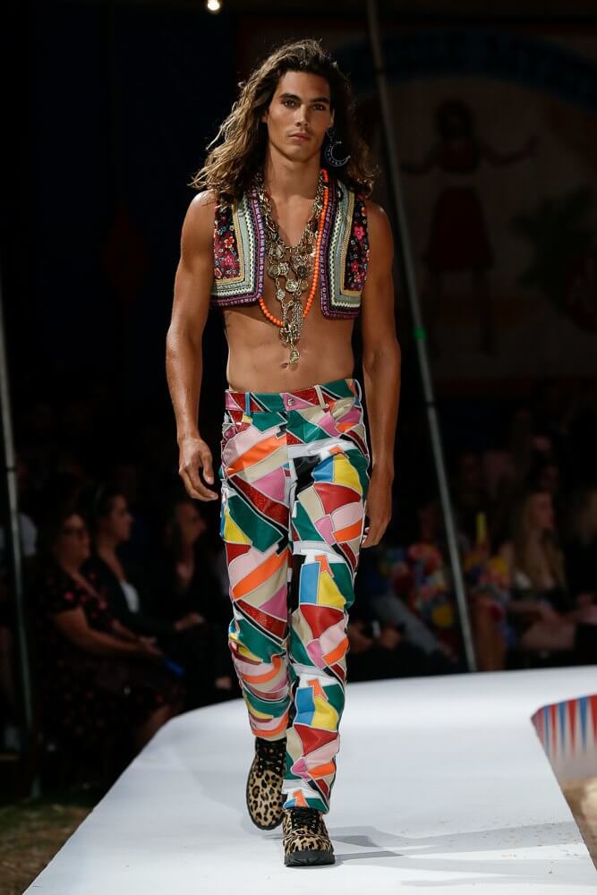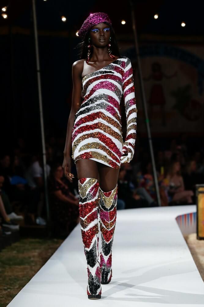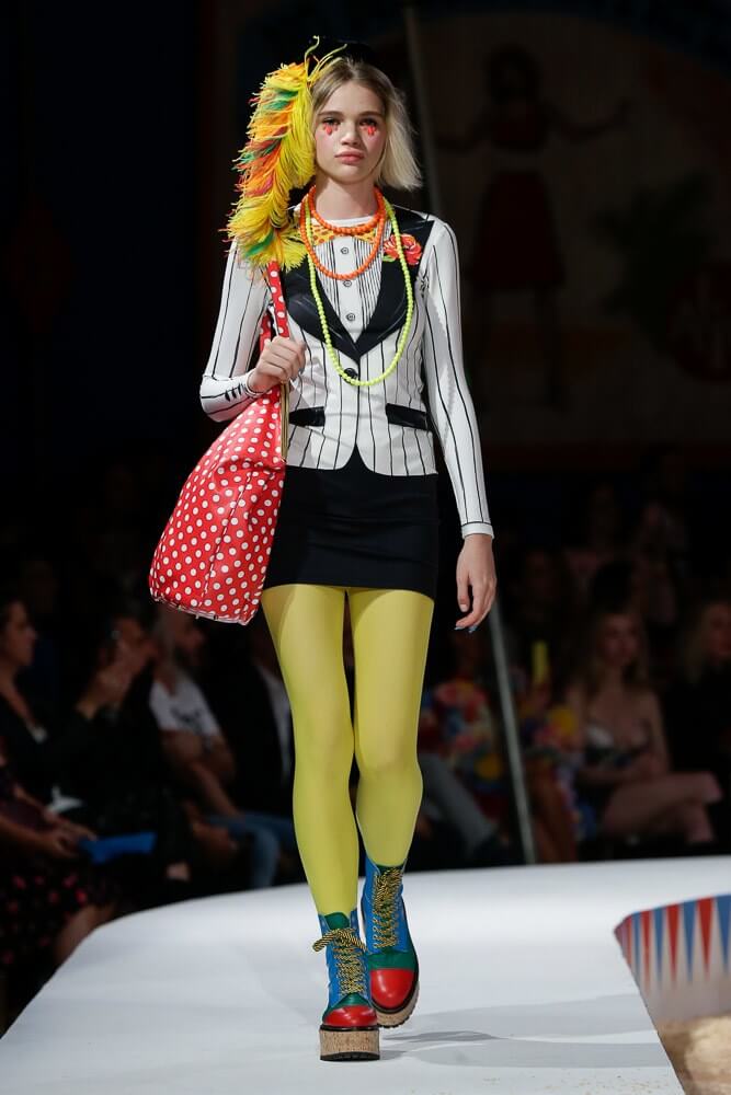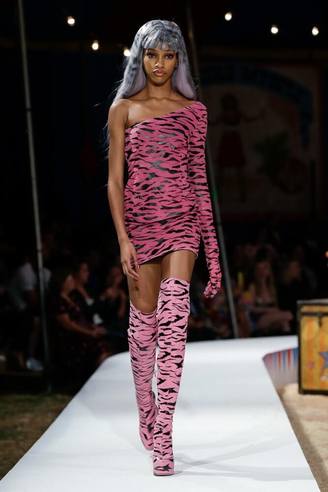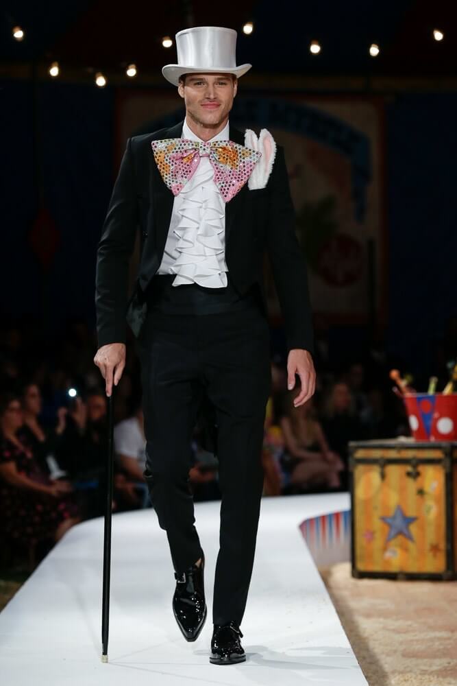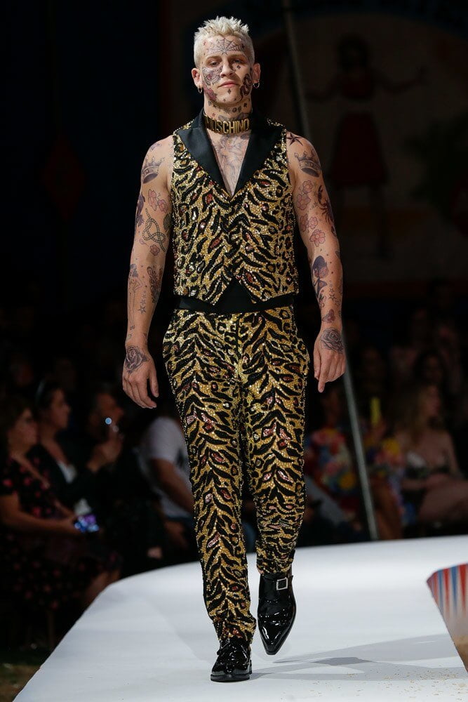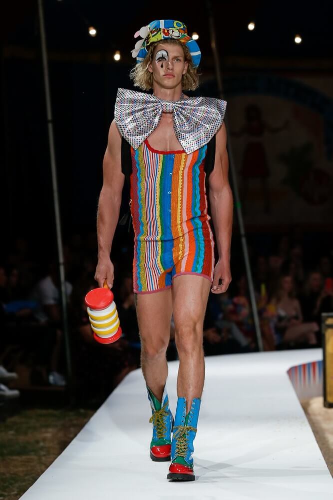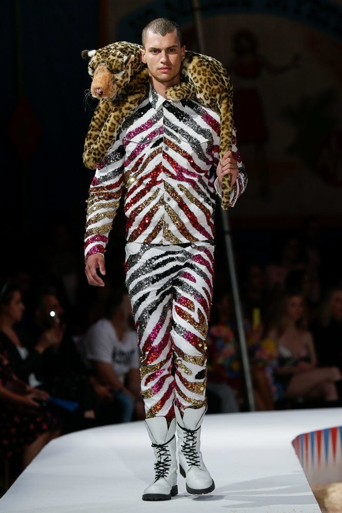 There’s only two types of people in the world: the ones that entertain and the ones that observe. Jeremy Scott is the put on a show kinda guy. He’s like a ringleader, he calls the shots, he’s like a firecracker, he makes it hot when he puts on a show. Not to paraphrase/ completely requote Britney Spears but Jeremy Scott did recreate a circus for his Moschino womenswear Resort 2019 and menswear Spring/ Summer 2019 all-in-one extravaganza in Los Angeles over the weekend. Spotlights were on all Jeremy’s faves as they worked the craziest flashes of triangular block colouring prints, flared red hot pants with waist chains and ties larger than life. It was over the top in the way that Moschino always is, but Scott manages to reign it in to still make it #fashion. He’s good at that. There were clowns in ballooning dresses complete with gaudy flowers, ringleaders in the shiniest tracksuits and shorts so high waisted they reached the top of ribs. All that Moschino magnificence was still there, waved into branded dog-collar style chokers (are they making a comeback so soon), full leopard print looks, embroidered denim and Scott style LBD’s. All eyes on Moschino in the centre of the ring ready for Jeremy Scott to crack that whip.