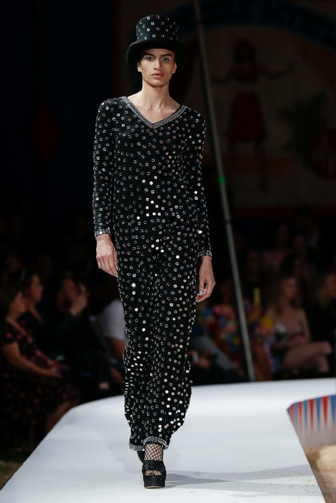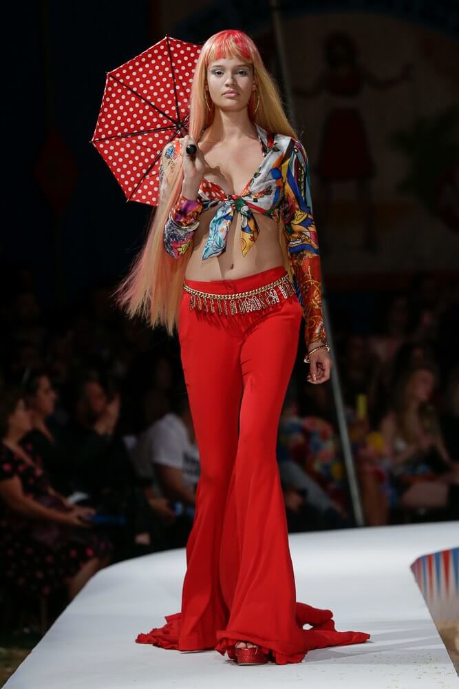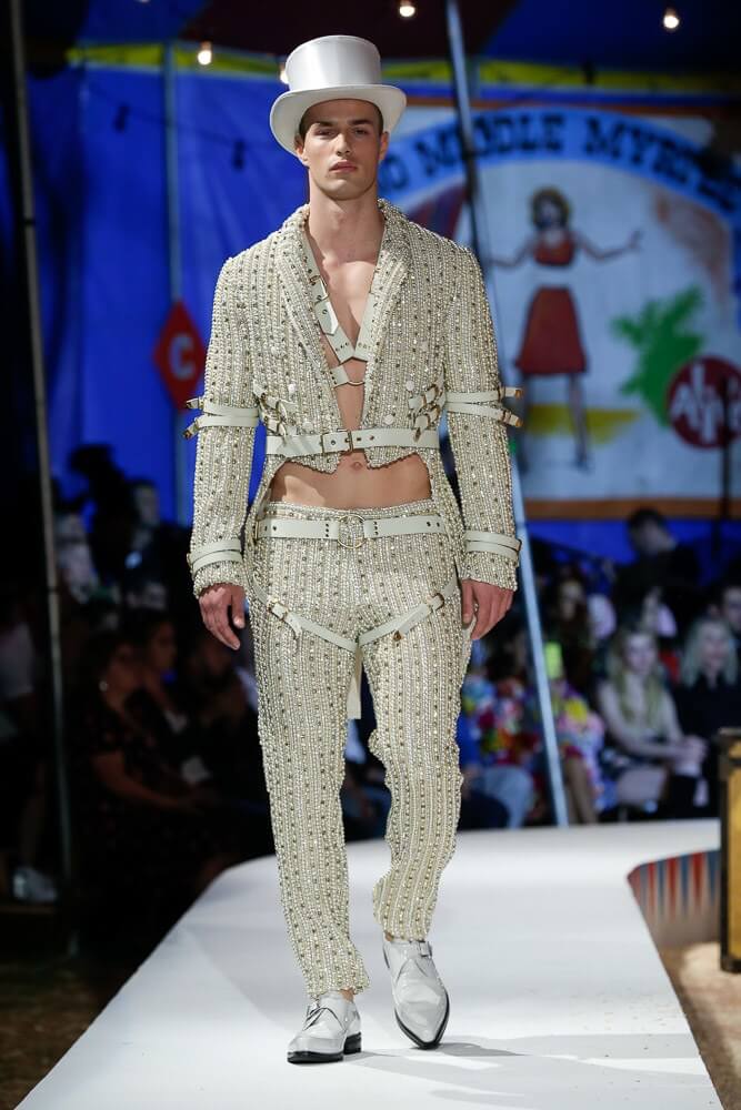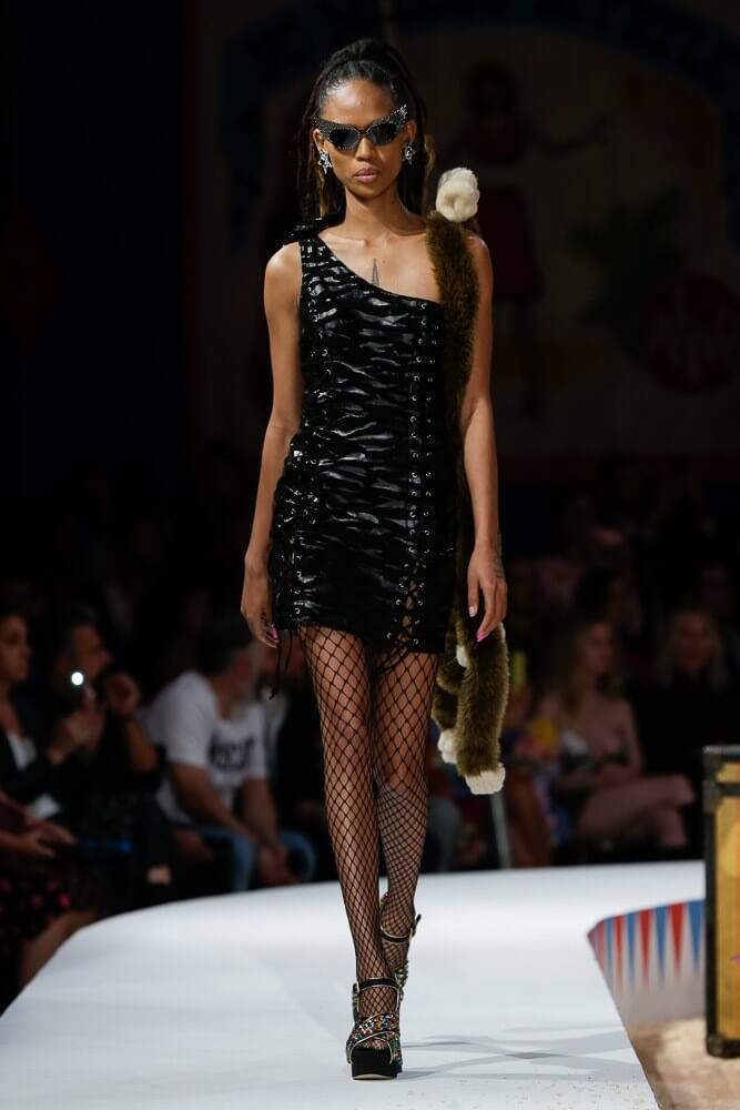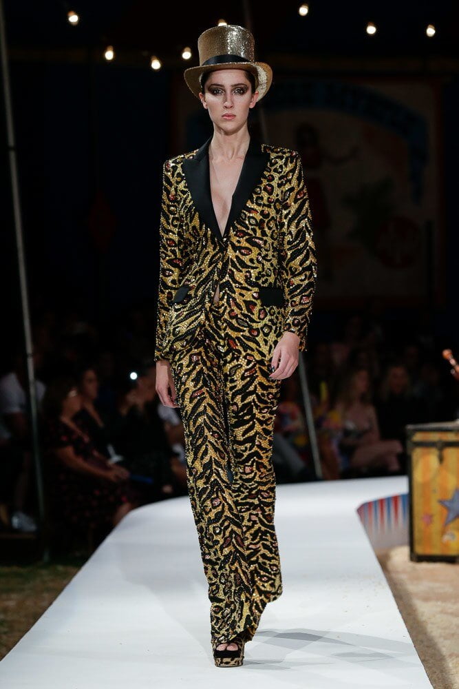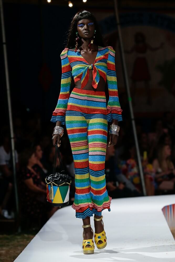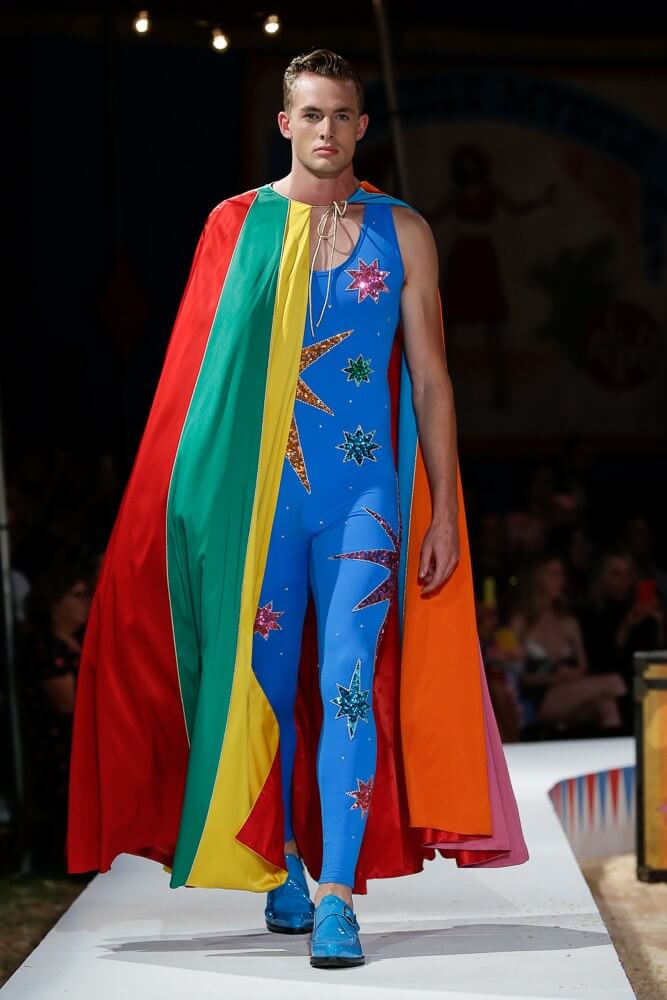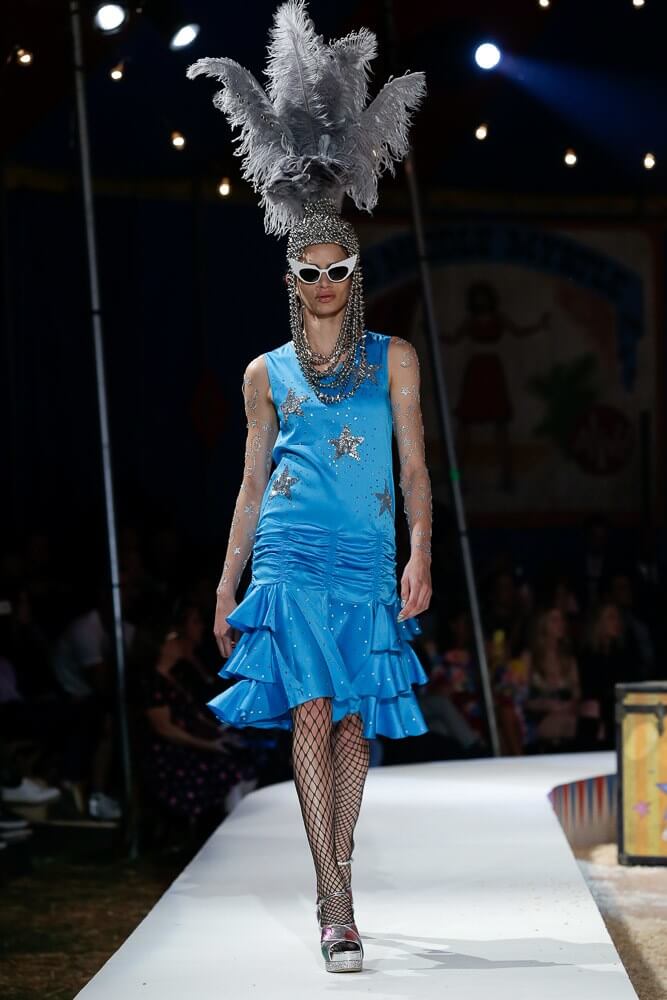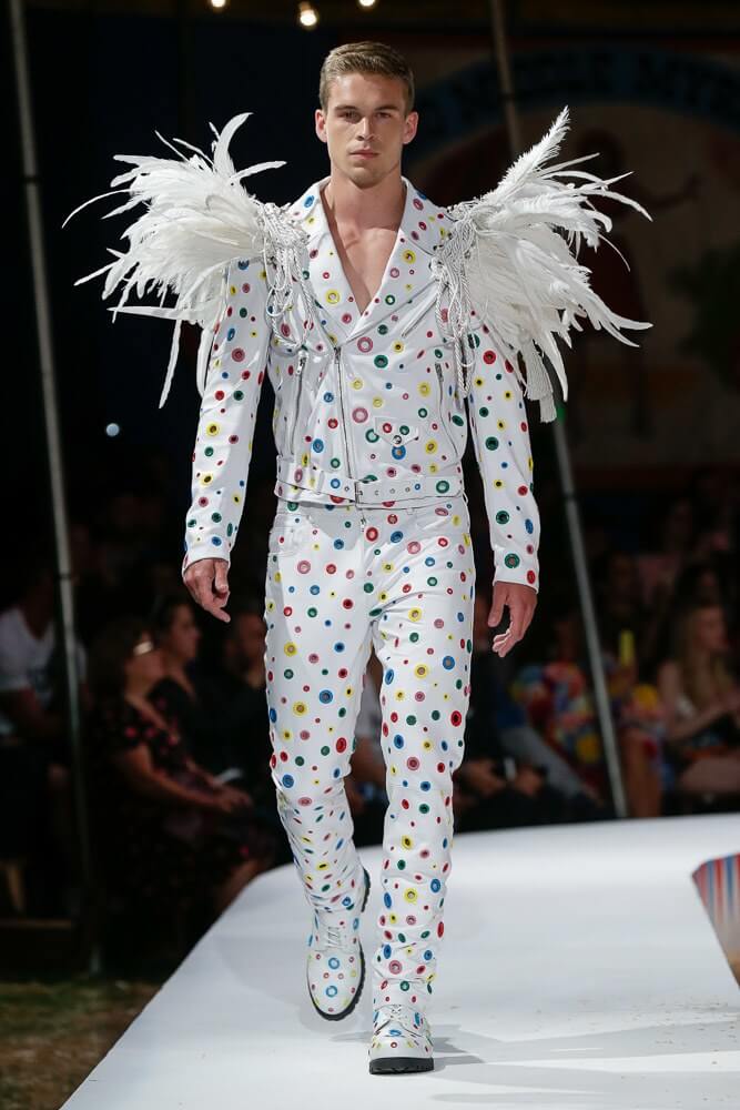 There’s only two types of people in the world: the ones that entertain and the ones that observe. Jeremy Scott is the put on a show kinda guy. He’s like a ringleader, he calls the shots, he’s like a firecracker, he makes it hot when he puts on a show. Not to paraphrase/ completely requote Britney Spears but Jeremy Scott did recreate a circus for his Moschino womenswear Resort 2019 and menswear Spring/ Summer 2019 all-in-one extravaganza in Los Angeles over the weekend. Spotlights were on all Jeremy’s faves as they worked the craziest flashes of triangular block colouring prints, flared red hot pants with waist chains and ties larger than life. It was over the top in the way that Moschino always is, but Scott manages to reign it in to still make it #fashion. He’s good at that. There were clowns in ballooning dresses complete with gaudy flowers, ringleaders in the shiniest tracksuits and shorts so high waisted they reached the top of ribs. All that Moschino magnificence was still there, waved into branded dog-collar style chokers (are they making a comeback so soon), full leopard print looks, embroidered denim and Scott style LBD’s. All eyes on Moschino in the centre of the ring ready for Jeremy Scott to crack that whip.