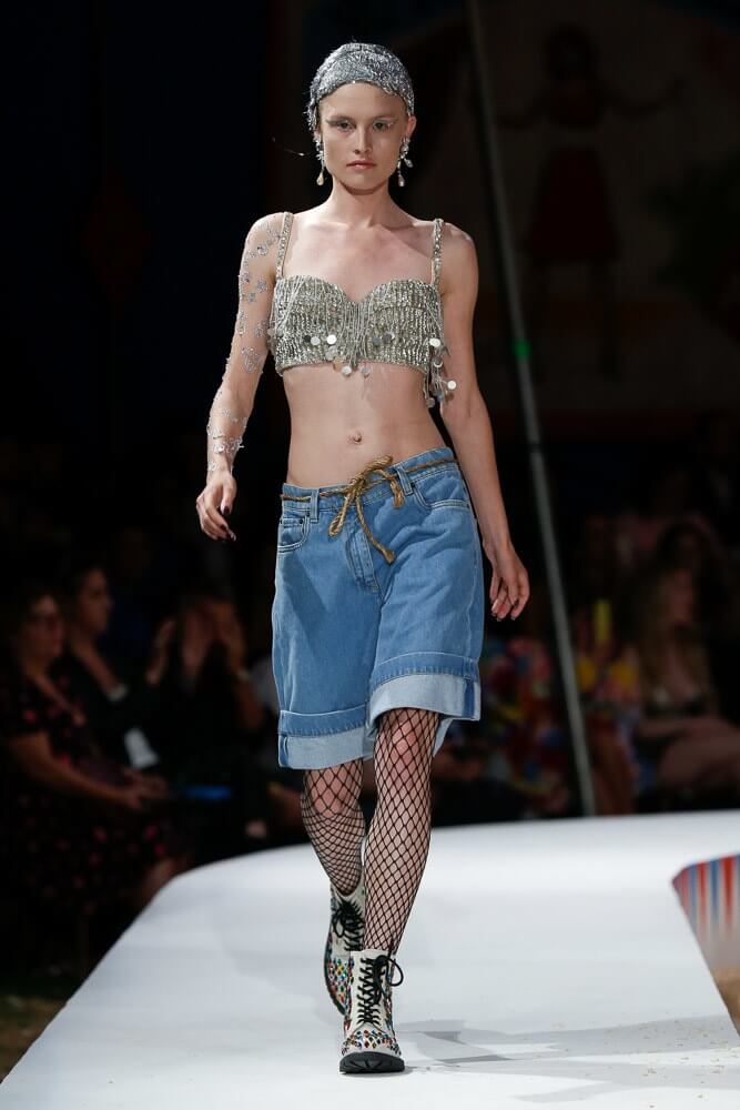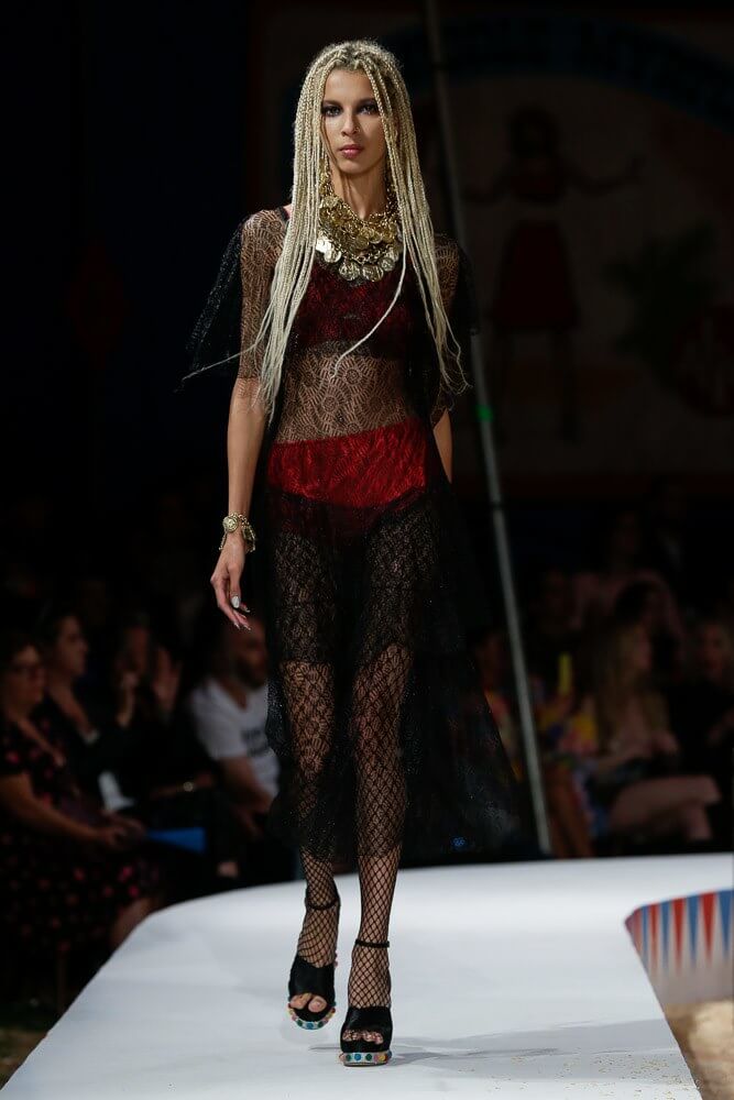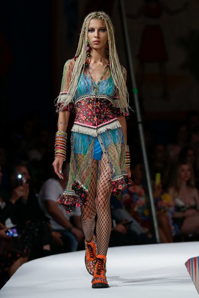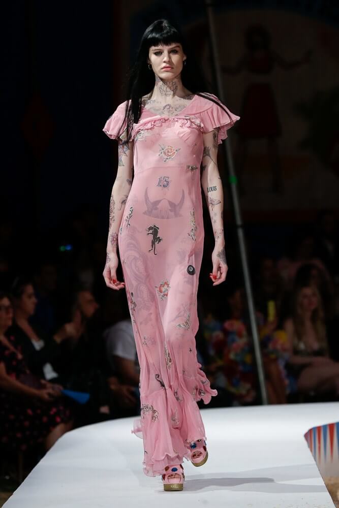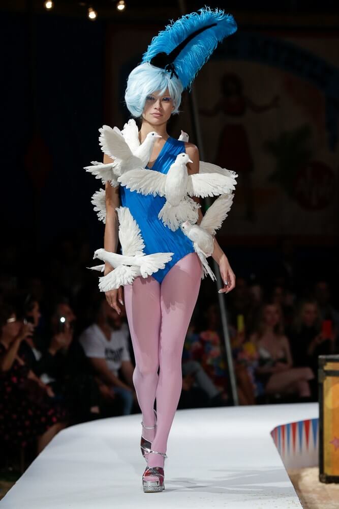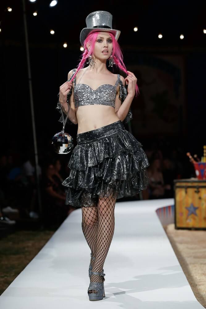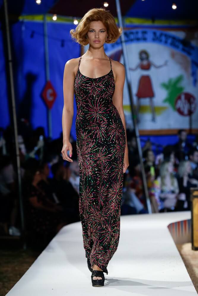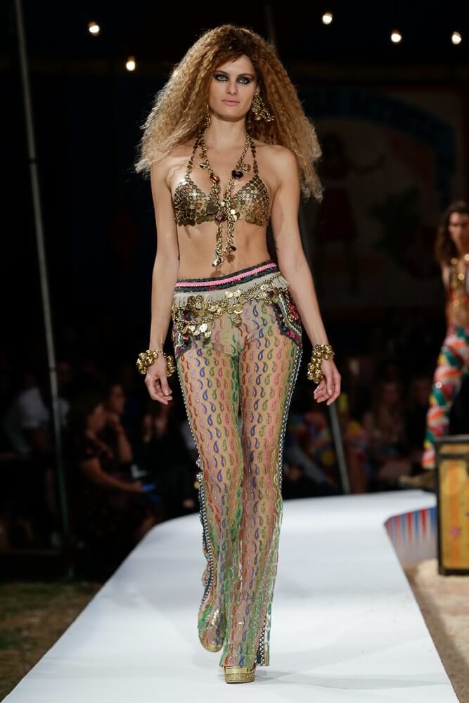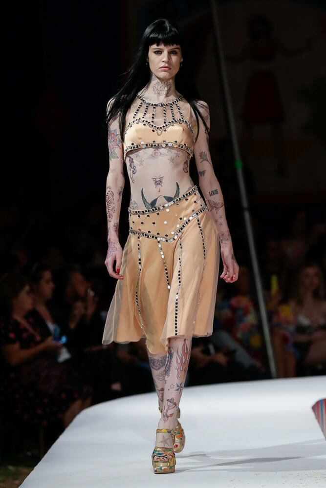 There’s only two types of people in the world: the ones that entertain and the ones that observe. Jeremy Scott is the put on a show kinda guy. He’s like a ringleader, he calls the shots, he’s like a firecracker, he makes it hot when he puts on a show. Not to paraphrase/ completely requote Britney Spears but Jeremy Scott did recreate a circus for his Moschino womenswear Resort 2019 and menswear Spring/ Summer 2019 all-in-one extravaganza in Los Angeles over the weekend. Spotlights were on all Jeremy’s faves as they worked the craziest flashes of triangular block colouring prints, flared red hot pants with waist chains and ties larger than life. It was over the top in the way that Moschino always is, but Scott manages to reign it in to still make it #fashion. He’s good at that. There were clowns in ballooning dresses complete with gaudy flowers, ringleaders in the shiniest tracksuits and shorts so high waisted they reached the top of ribs. All that Moschino magnificence was still there, waved into branded dog-collar style chokers (are they making a comeback so soon), full leopard print looks, embroidered denim and Scott style LBD’s. All eyes on Moschino in the centre of the ring ready for Jeremy Scott to crack that whip.