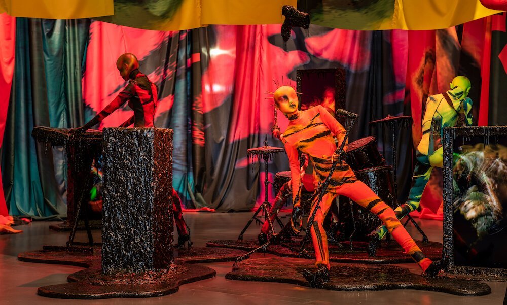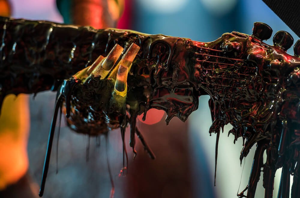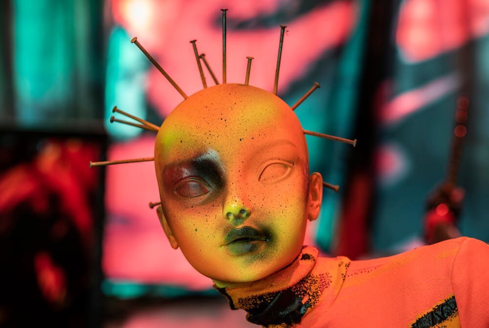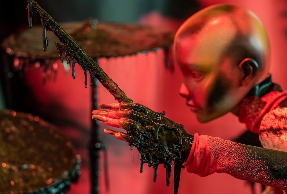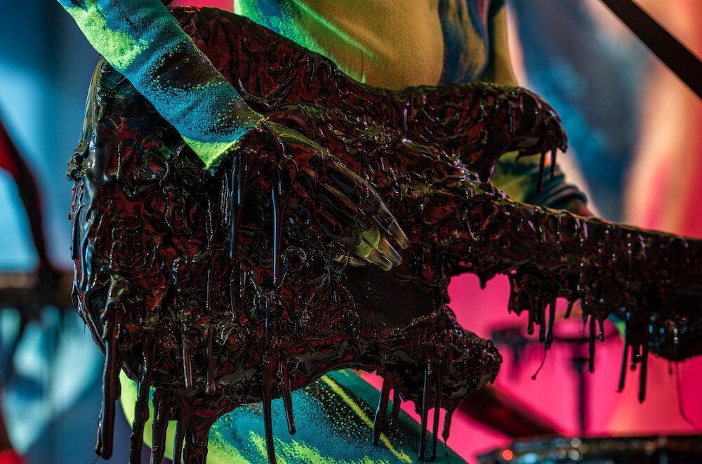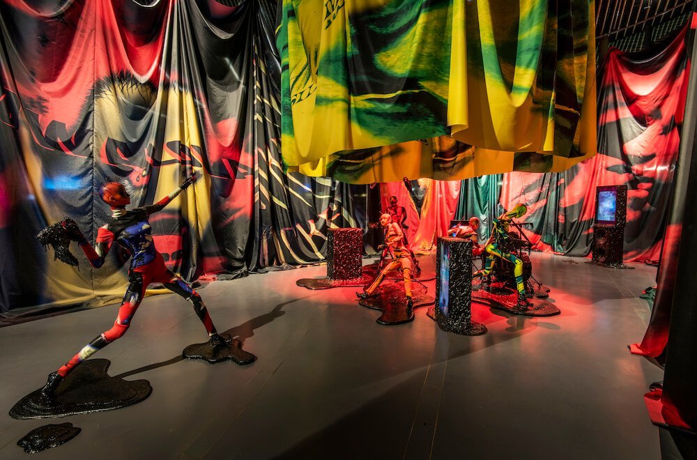 Getting down and dirty, the instruments on display are smothered in a thick tar, slithering into pools at the mannequins’ ankles. The sticky black texture also coats screens which play short and snappy clips that collide into one another. Both psychedelic and slightly creepy, the films courtesy of Jordan Hemingway, Jamie Reid and experimental musician Yves Tumour, feature faces morphing into one another and alien-like creatures staggering into the opaque unknown. Whilst attempting to absorb this method of madness, you’re towered by draping swatches of fabric doused in graphics made in collaboration with Leo Columbo. The curtains burst with the vivid hues that have quickly become Mowalola signatures. Burnt oranges, blood reds and Nickelodeon slime greens drip from the drapes, the mannequins and even their curled acrylics.