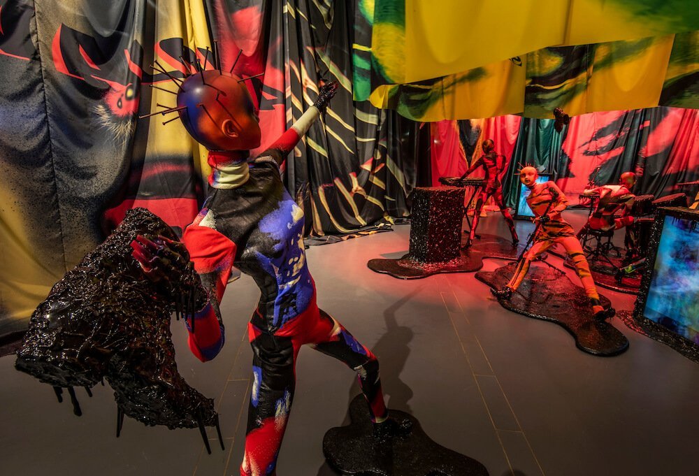 Move over The Hex Girls, there’s a new spooky band in town – and they’re coming for blood. For her first solo exhibition, Fashion East designer Mowalola has transformed the Now Gallery in Greenwich Peninsula into a concert arena that looks as if it has survived the apocalypse. The focal point is a quartet of menacing mannequins. Taking centre stage, they shred guitars, man the keys and play the drums with a ferocious bite – all whilst a groupie stands at the sidelines, ready to chuck a boot into the crowd. The top of their heads spiked, their torsos clad in tie-dye catsuits from the designer’s 2017 graduate collection – it’s like watching the Sex Pistols whilst on Acid.