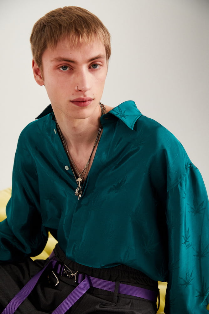 The final result is a psychedelic party, costumed in marble-print twinsets, neon suiting and T-shirts stamped with the word ‘Fluidity’; the brand’s manifesto. “We have to stay young by keeping up to date with new cultures, with the new generations,” says Giorgetti, channelling the freedom of Gen Z via trippy motifs, like magic mushrooms across silky twinsets, or hemp flowers stamped across denim. “This is the DNA of MSGM.”