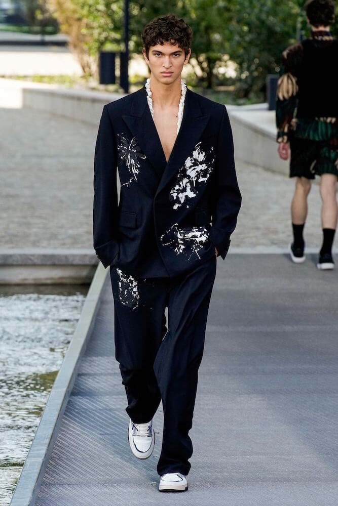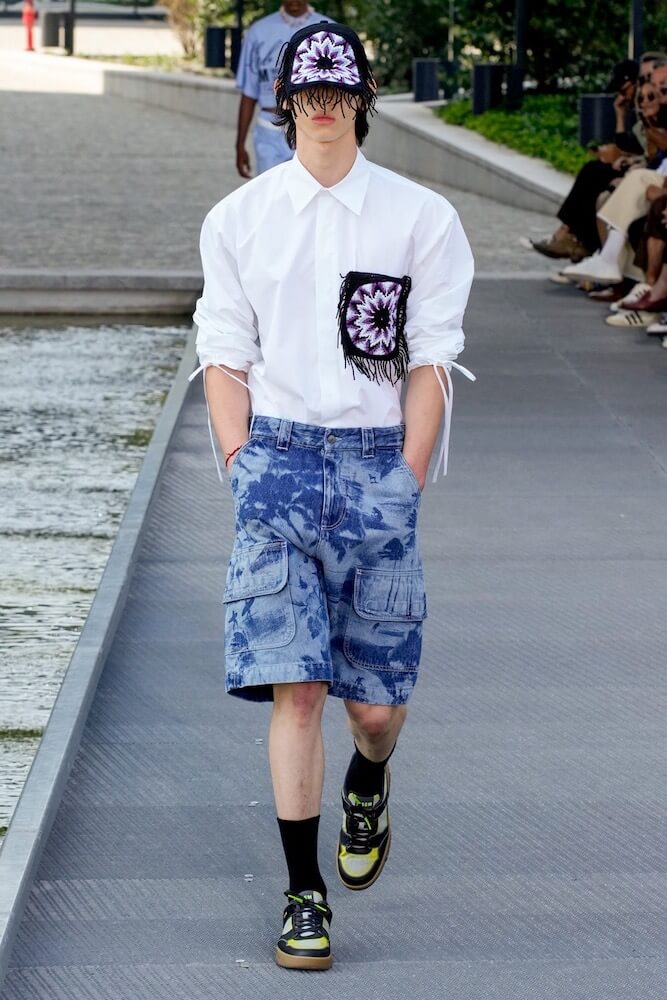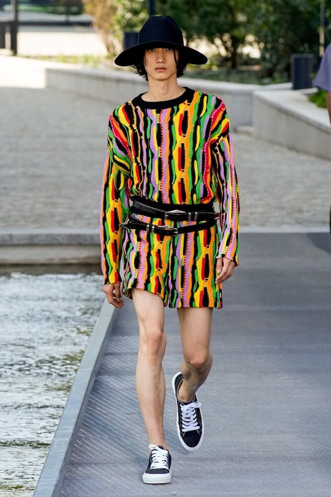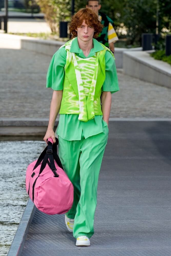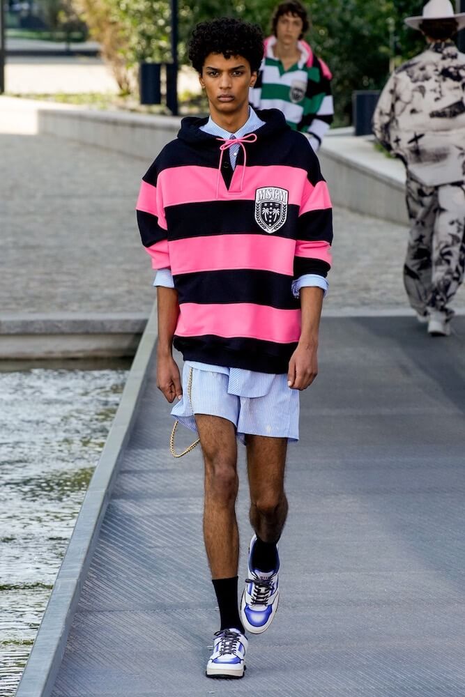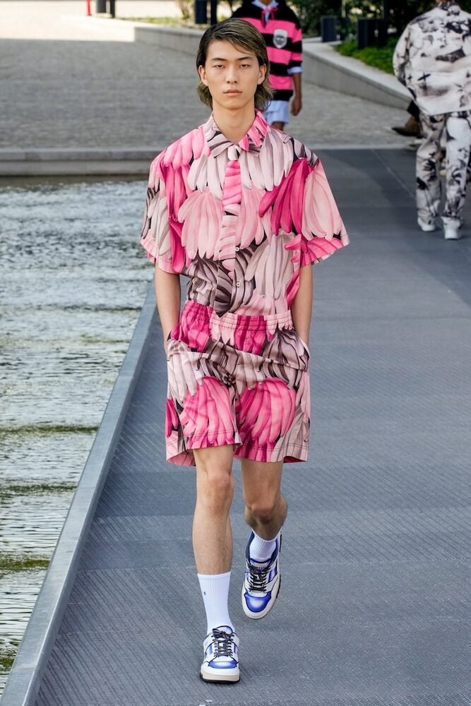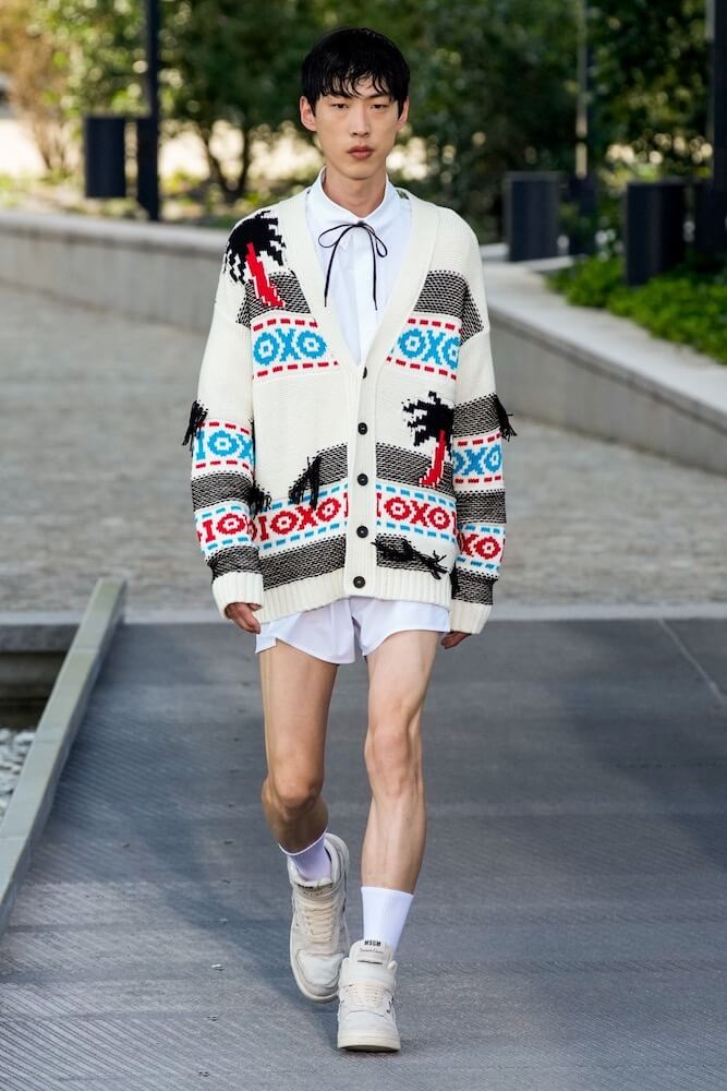 Elsewhere, explosions of flora and fauna, hibiscus, bananas, palms, pineapple, dolphins and crocodiles emerged as Giorgetti played with poignant symbols of vitality and served carefree surfer vibes. MSGM’s fresh Island Dreaming print, which depicts a sweet vision of a tropical beach, also made an appearance, functioning as a recurring motif laser-etched onto fleeces and cargo pants.