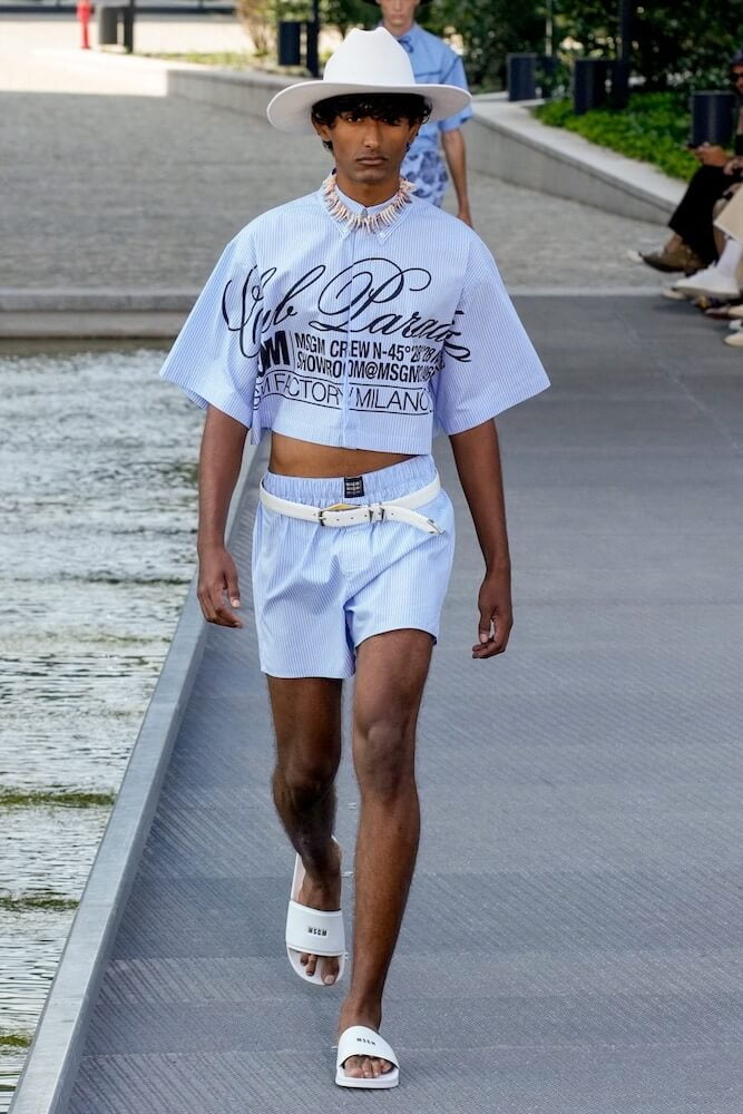 The MSGM boys paraded around the glistening pools clad in baggy Bermudas, boxy midriff-baring cropped tops, crisp bleached denim and striped rugby polos.