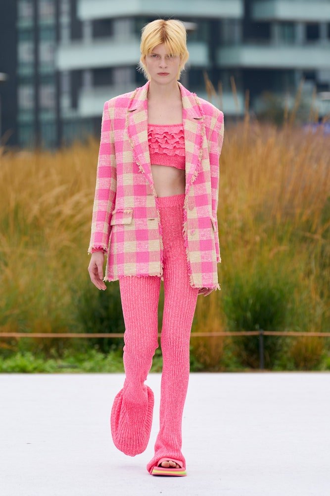 It was Giorgetti’s nod to the regrowth of Milano following the pandemic and it more than manifested in the collection. The prettiest of florals on plissé suits took their cue from the flower-filled meadows that once lay on the spot they were walking before the city’s urban spread regenerated it. They popped up in daisy prints and micro appliqué; in beautiful bead-embroidered boleros; and super Italiano jacquard leisurewear.