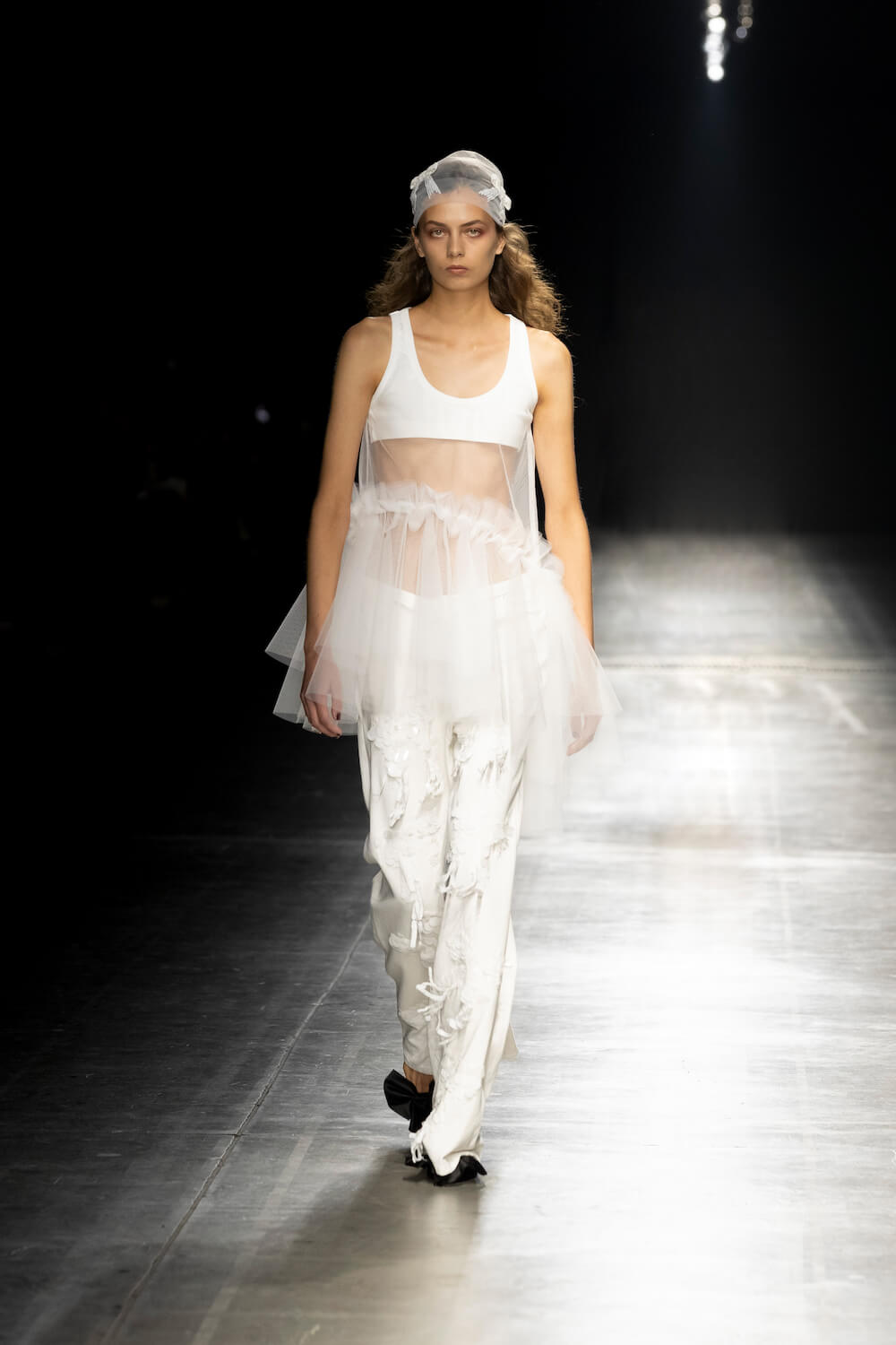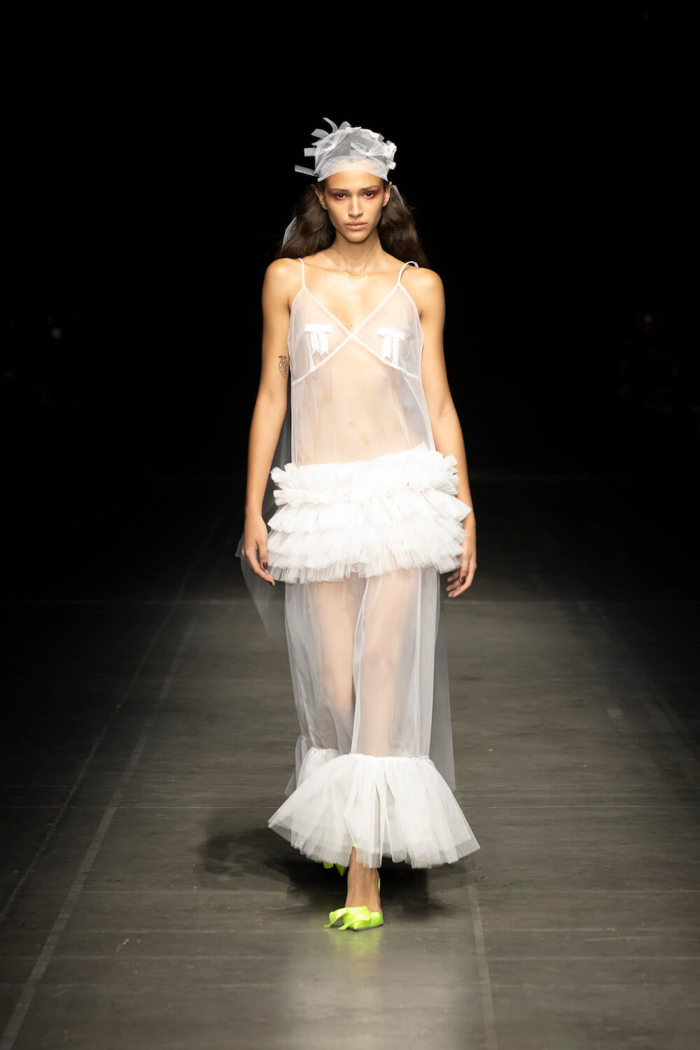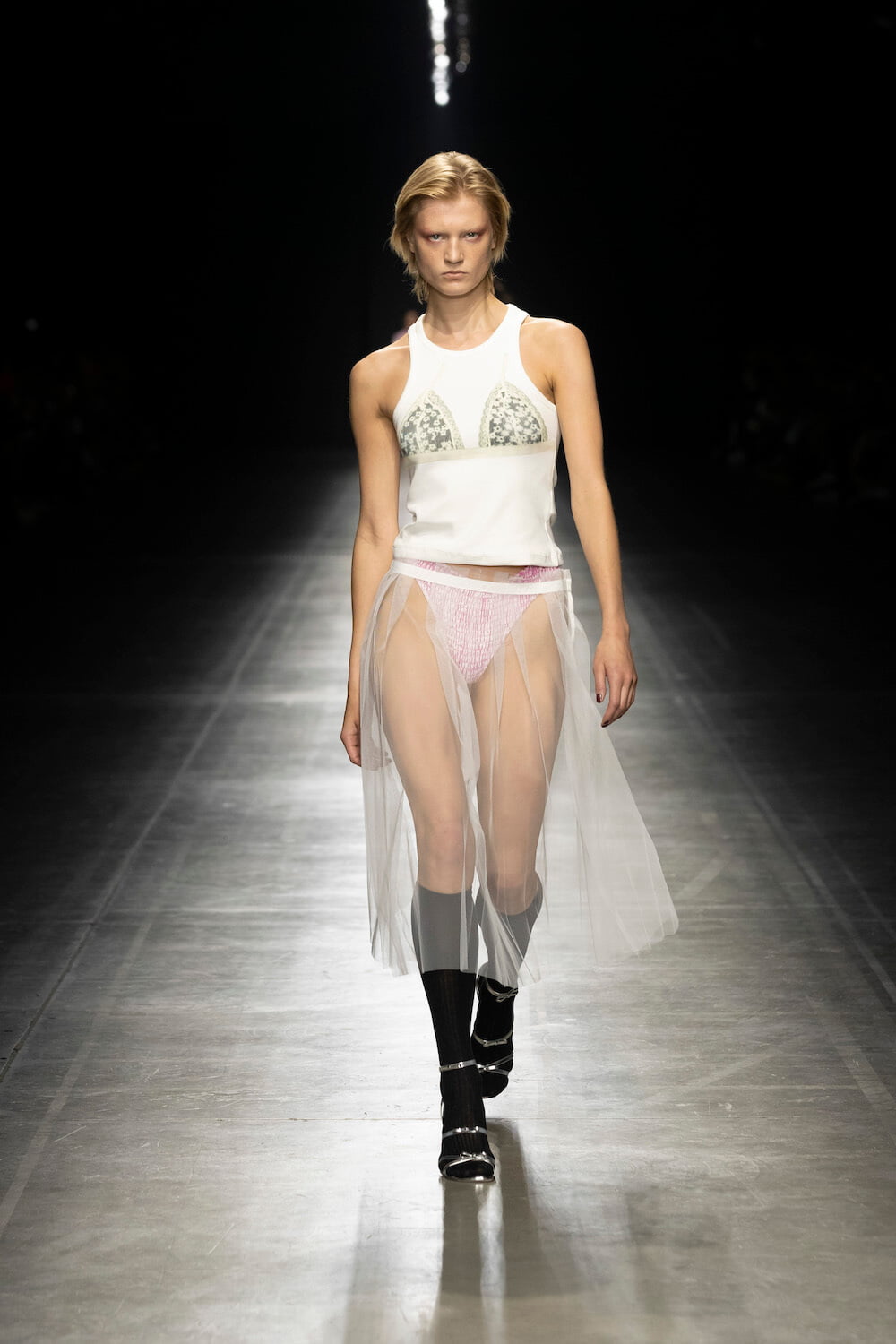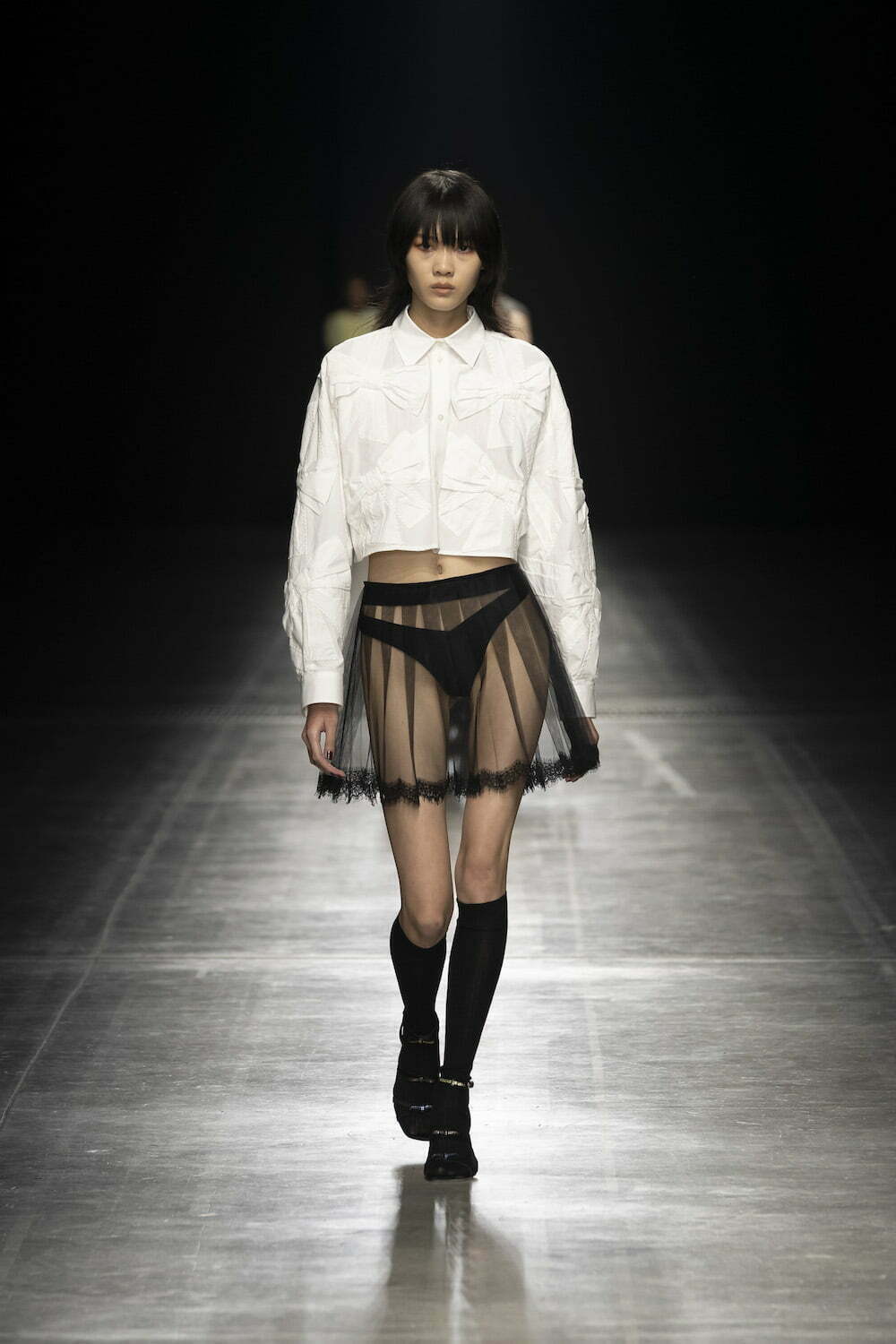 There were gossamer slips too, some studded with silver piercings and glass gemstones, others weighted by layers of tulle. To boot, collared shirts with 3D bows all over were tucked into teeny-tiny blush undies with ruching all over.