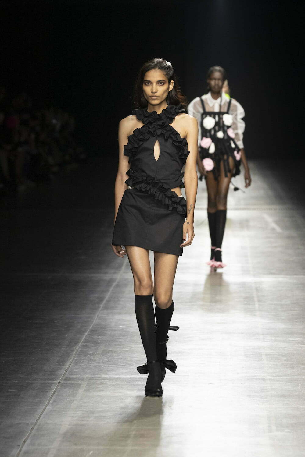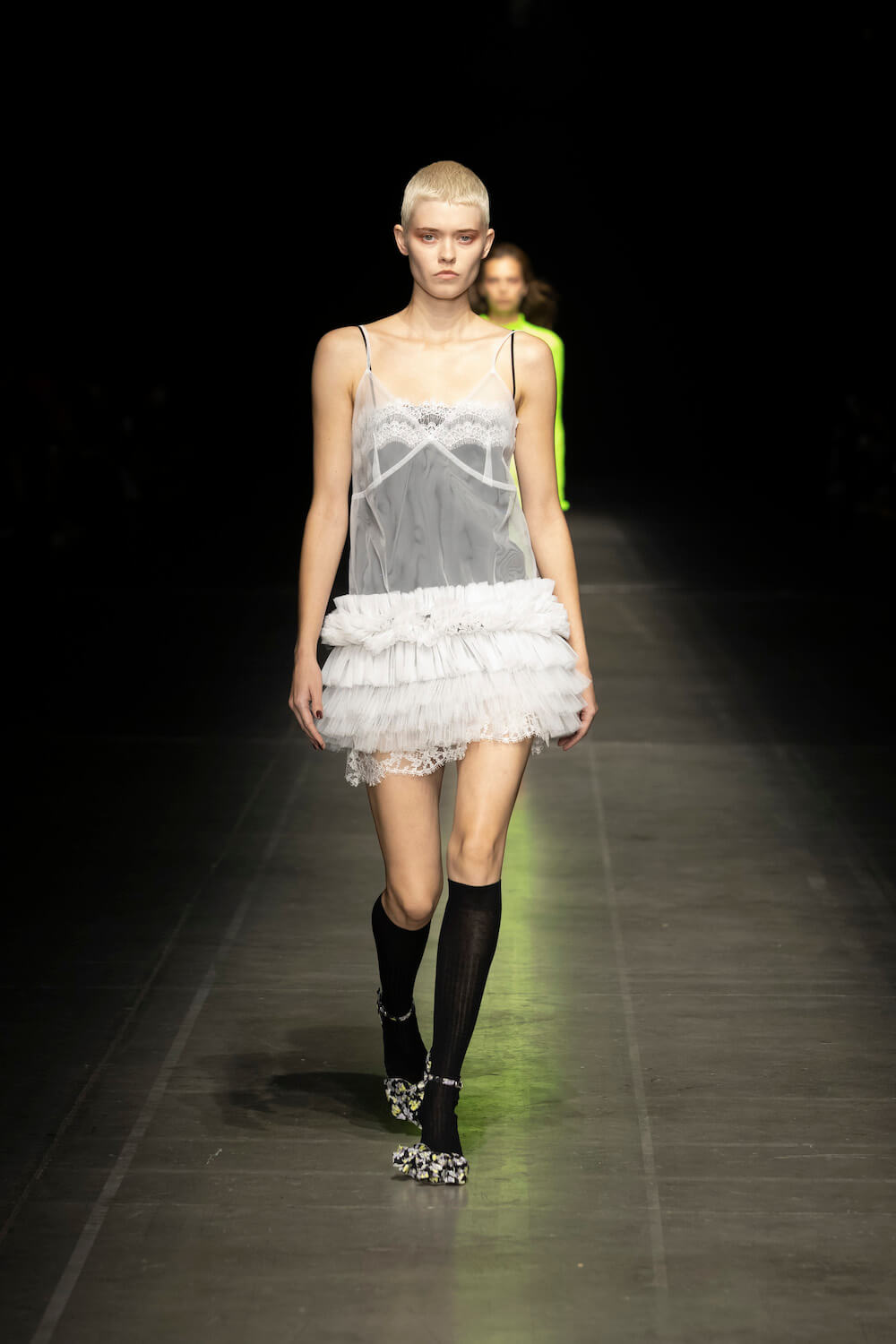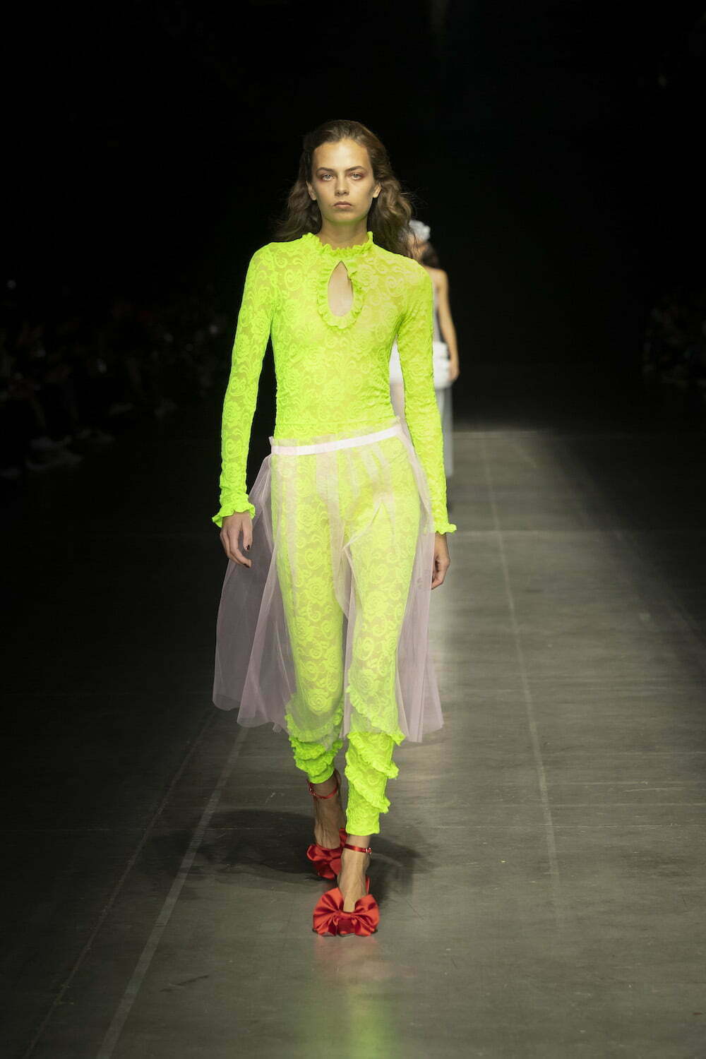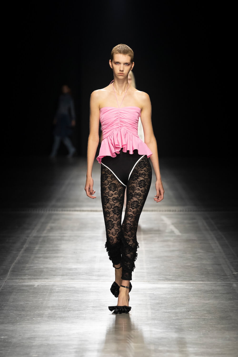 Despite the disparate narrative, certain MSGM design tropes did stay in stasis: from beginning to end lace leggings had ruffles spiralling up the legs, see-through skirts prevailed and dainty bow details were dotted throughout.