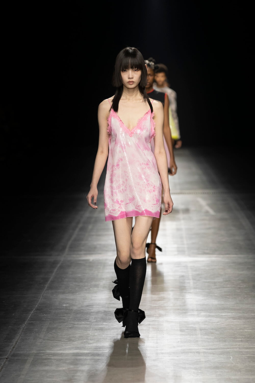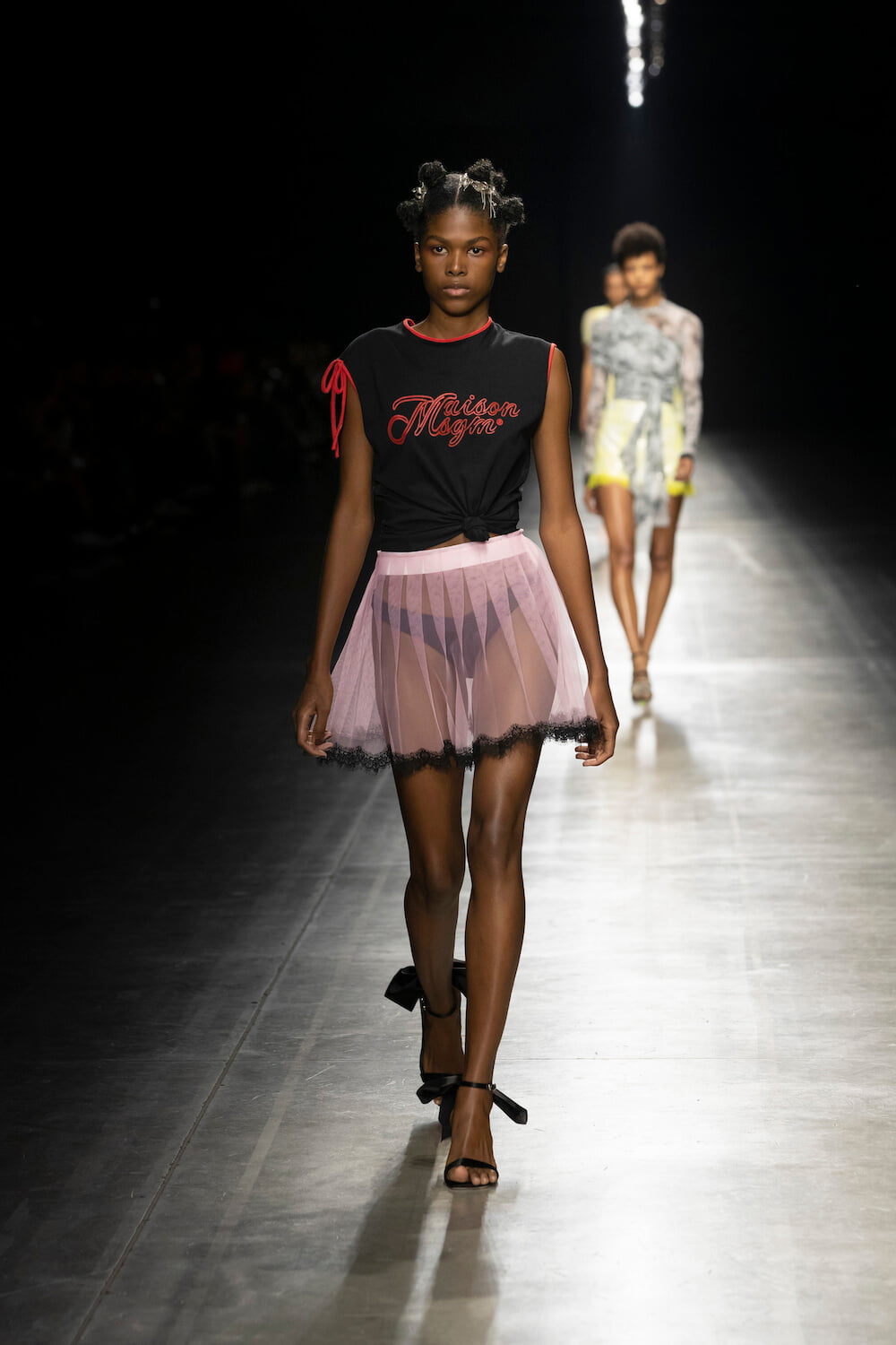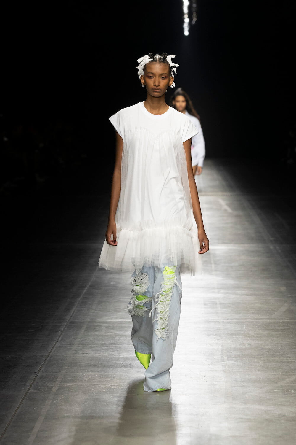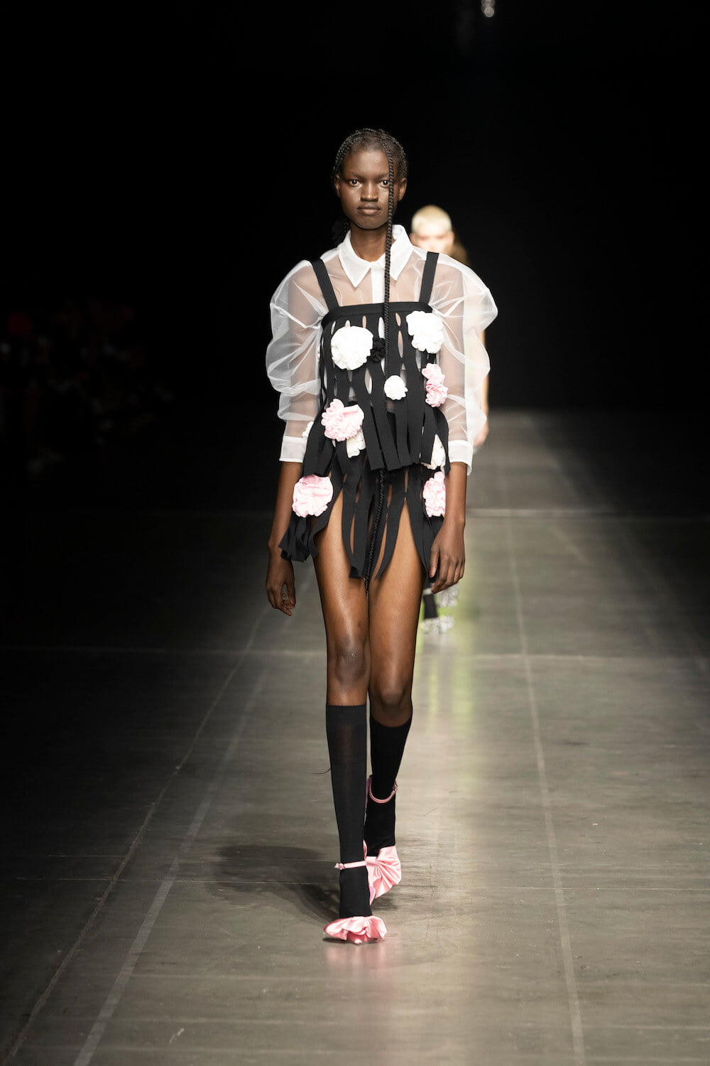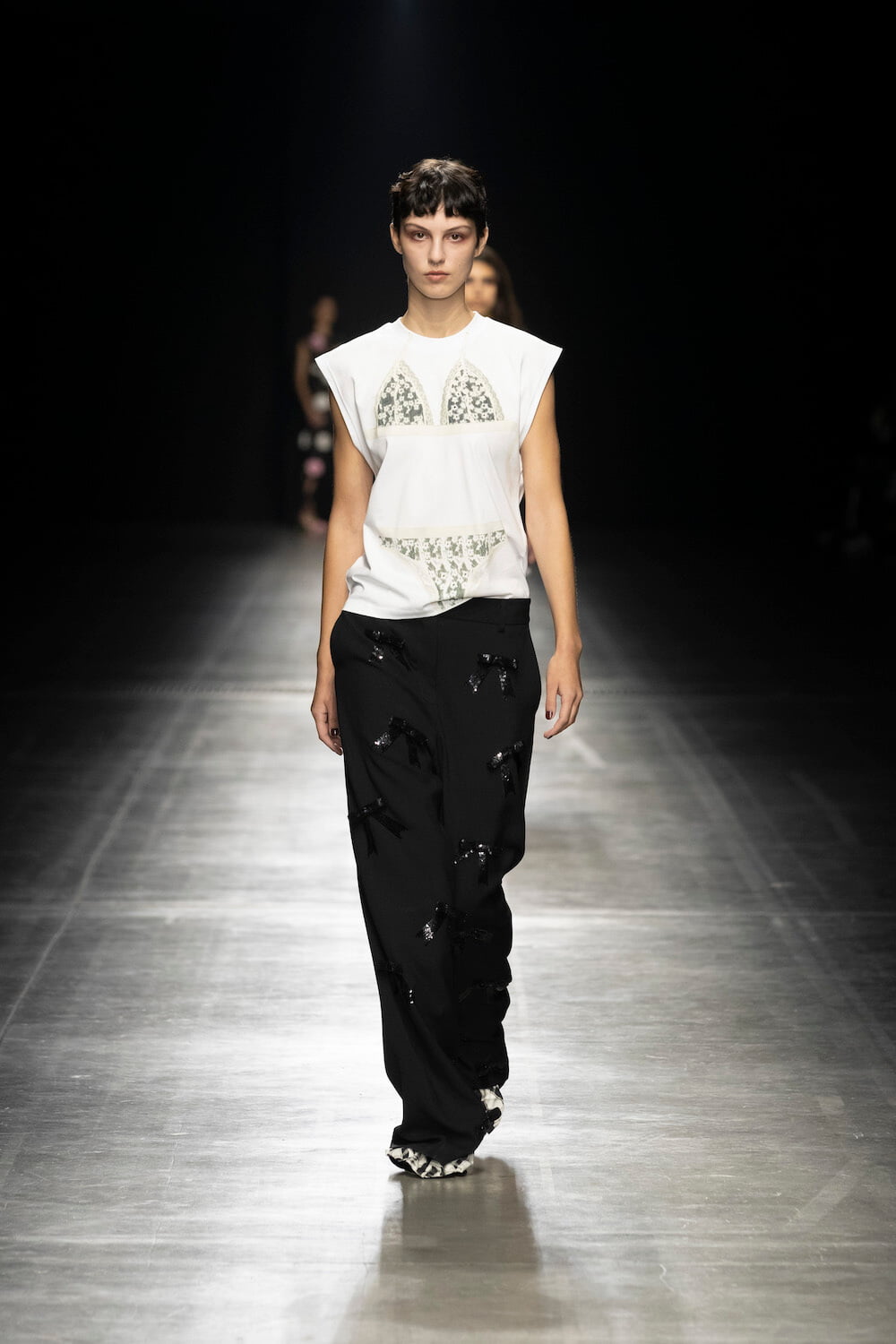 Despite the disparate narrative, certain MSGM design tropes did stay in stasis: from beginning to end lace leggings had ruffles spiralling up the legs, see-through skirts prevailed and dainty bow details were dotted throughout.