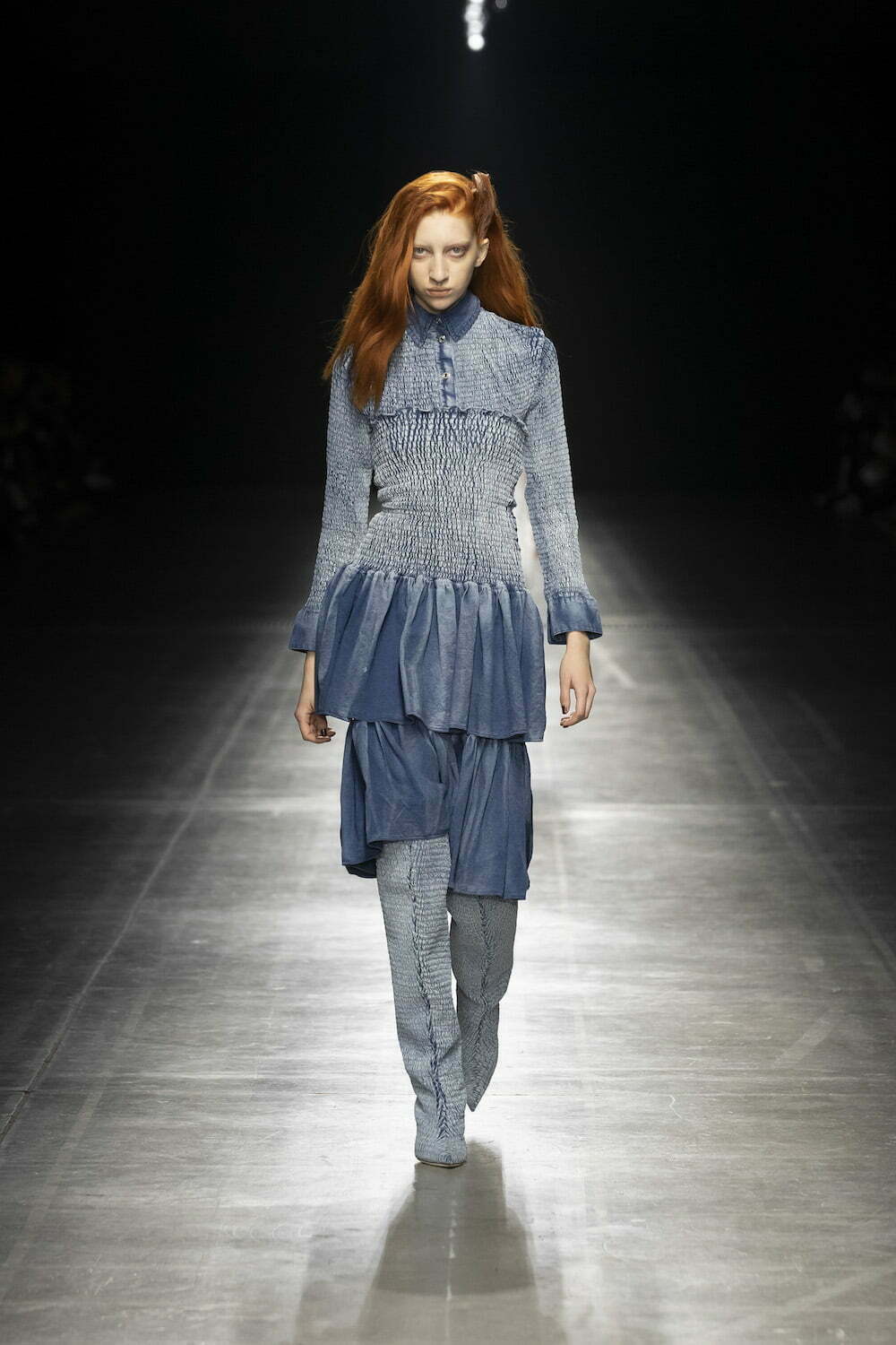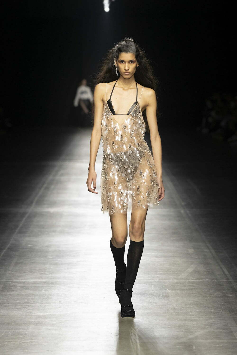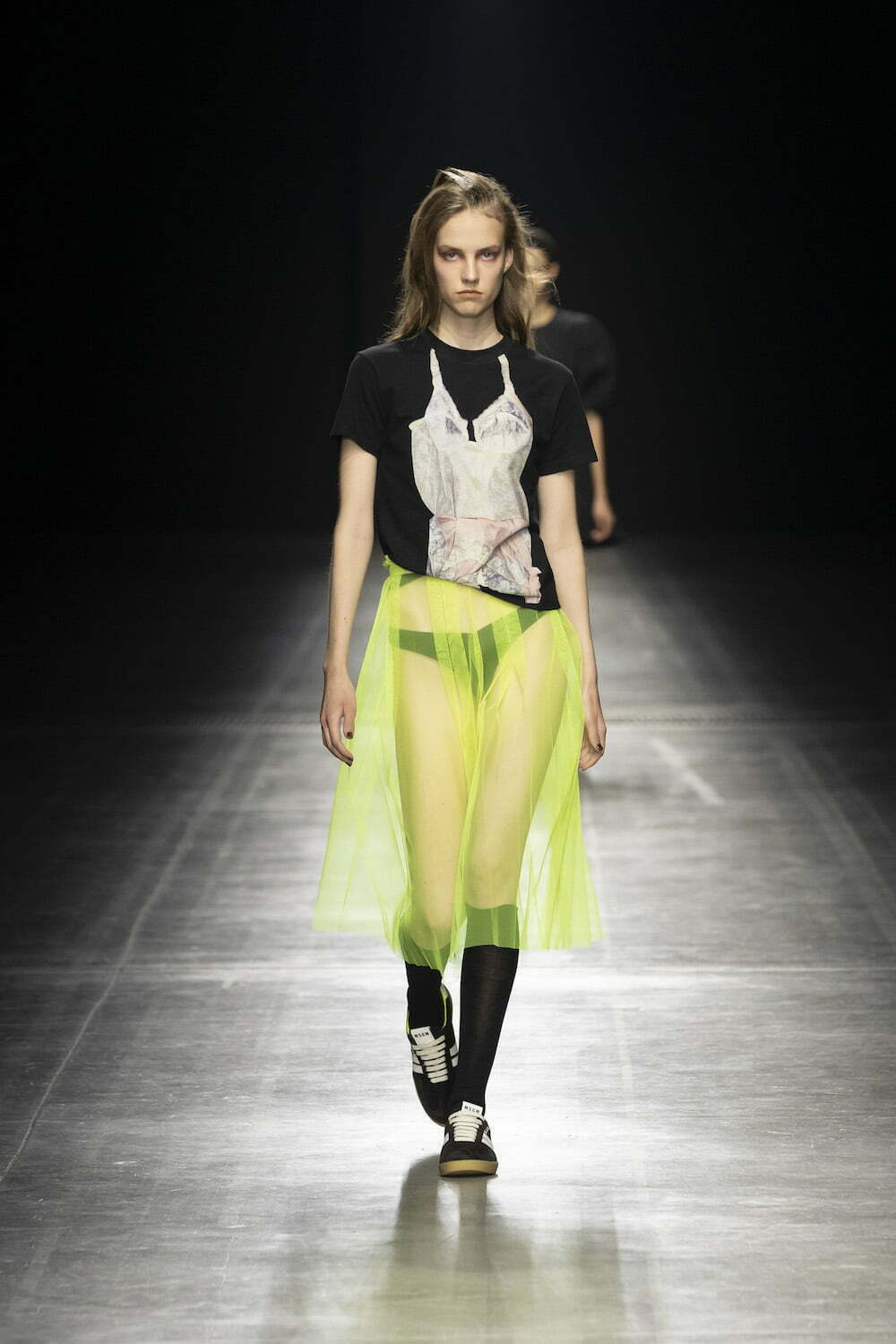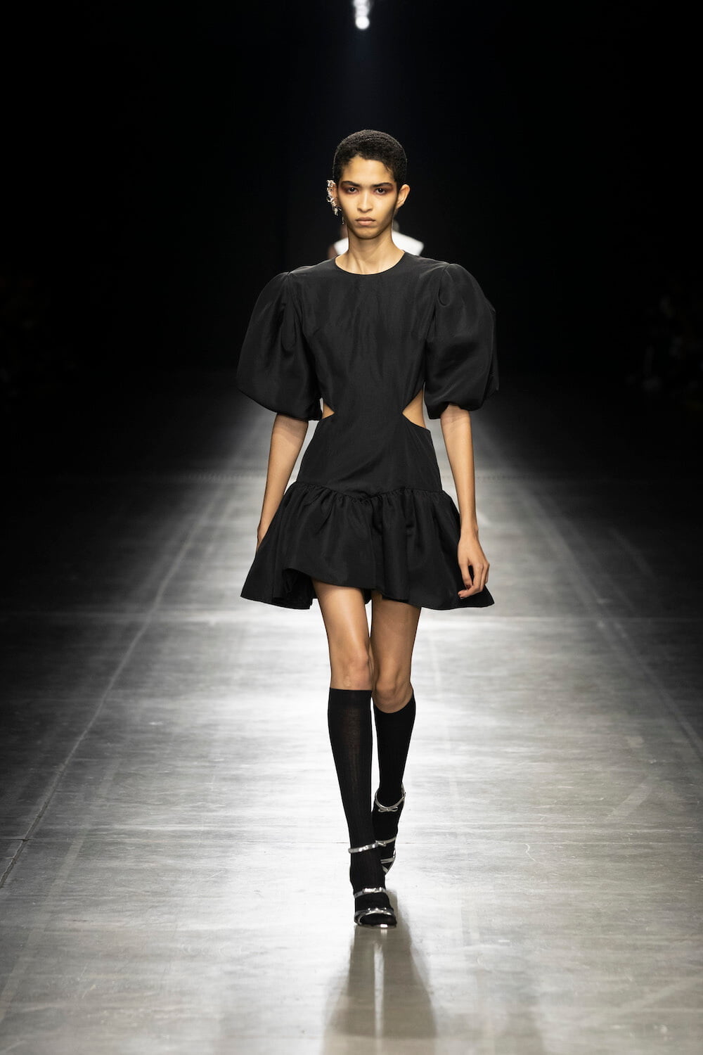 Despite the disparate narrative, certain MSGM design tropes did stay in stasis: from beginning to end lace leggings had ruffles spiralling up the legs, see-through skirts prevailed and dainty bow details were dotted throughout.