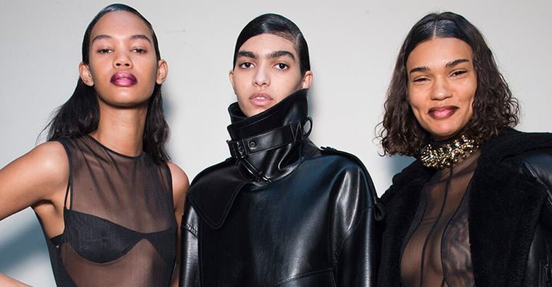 A mesh bodysuit was hoiked high up over the hip bones and worn with low-slung leather trousers. Tights segued from ripples of sheer to opaque creating new undulating erogenous zones on the legs. A short leather dress with an oblique zip looked like it was sliding off the body. Bella Hadid closed the show in a swirling sinew of a dress, its layered, shaded opacities amplifying her shape as she slinked down the catwalk. The collection was shown on models of diverse body type and gender, further underlining the idea that conventional sexy codes just aren’t enough any more.