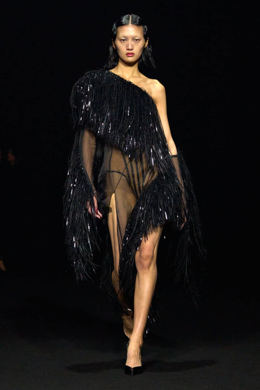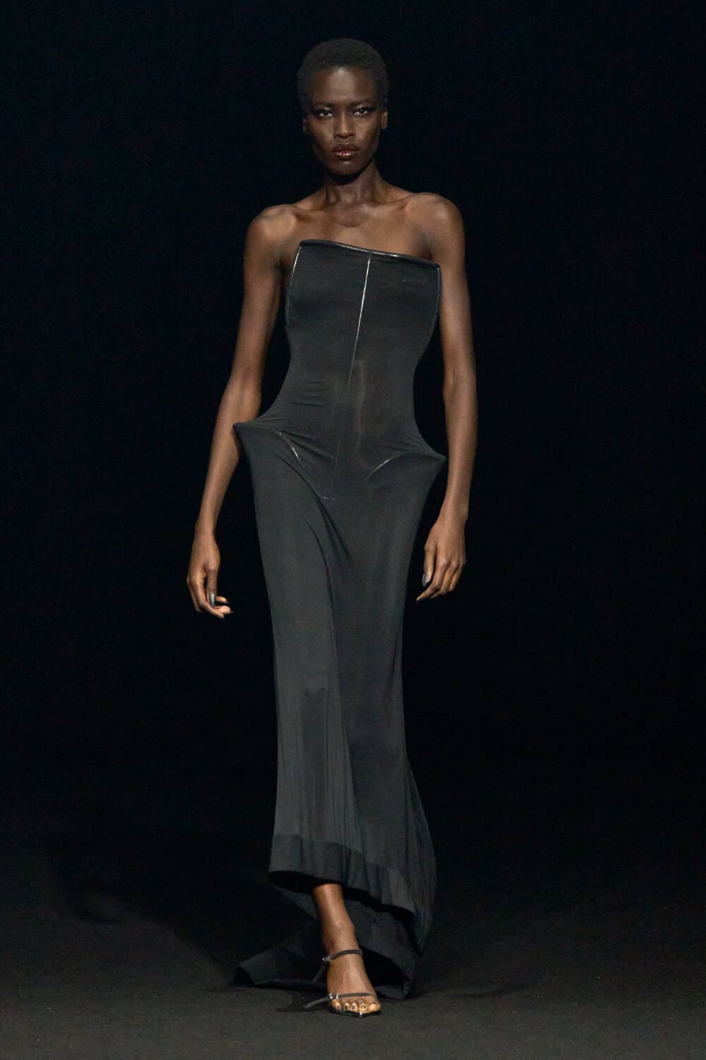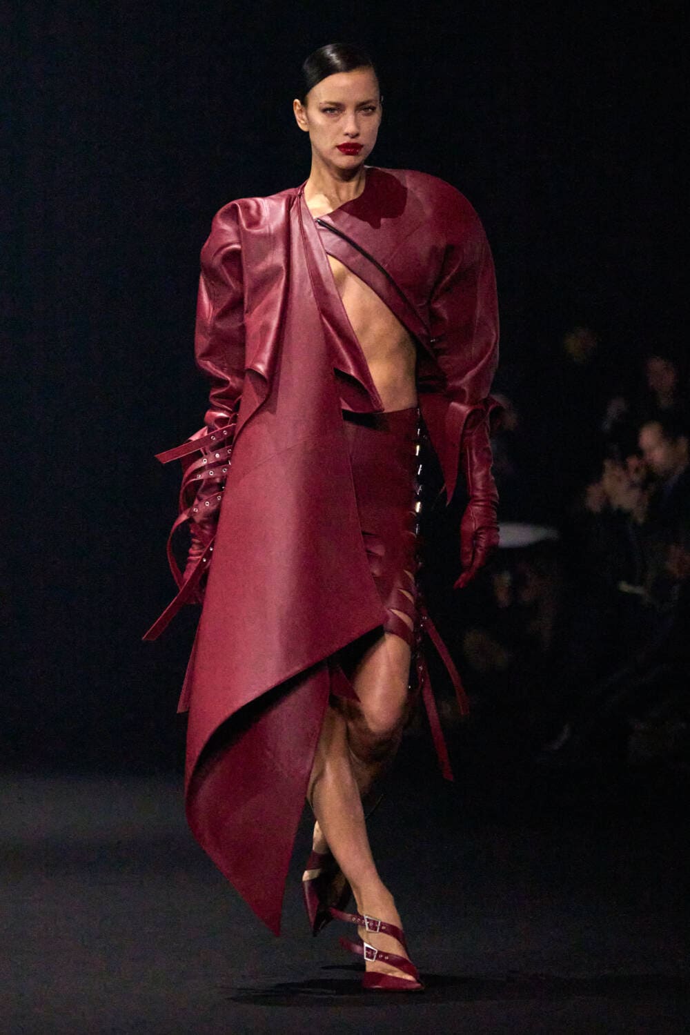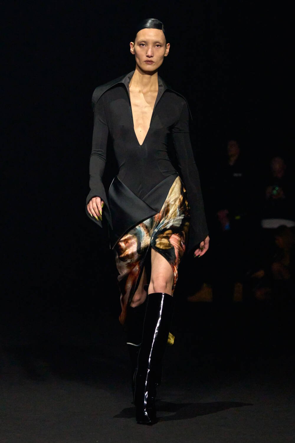 He’s done catsuits and sheer panels and cut outs, now the designer is expanding his Mugler vocabulary to include fluttering asymmetric panels that trail as you stride past. In leather or silk they worked to enhance the models in motion.