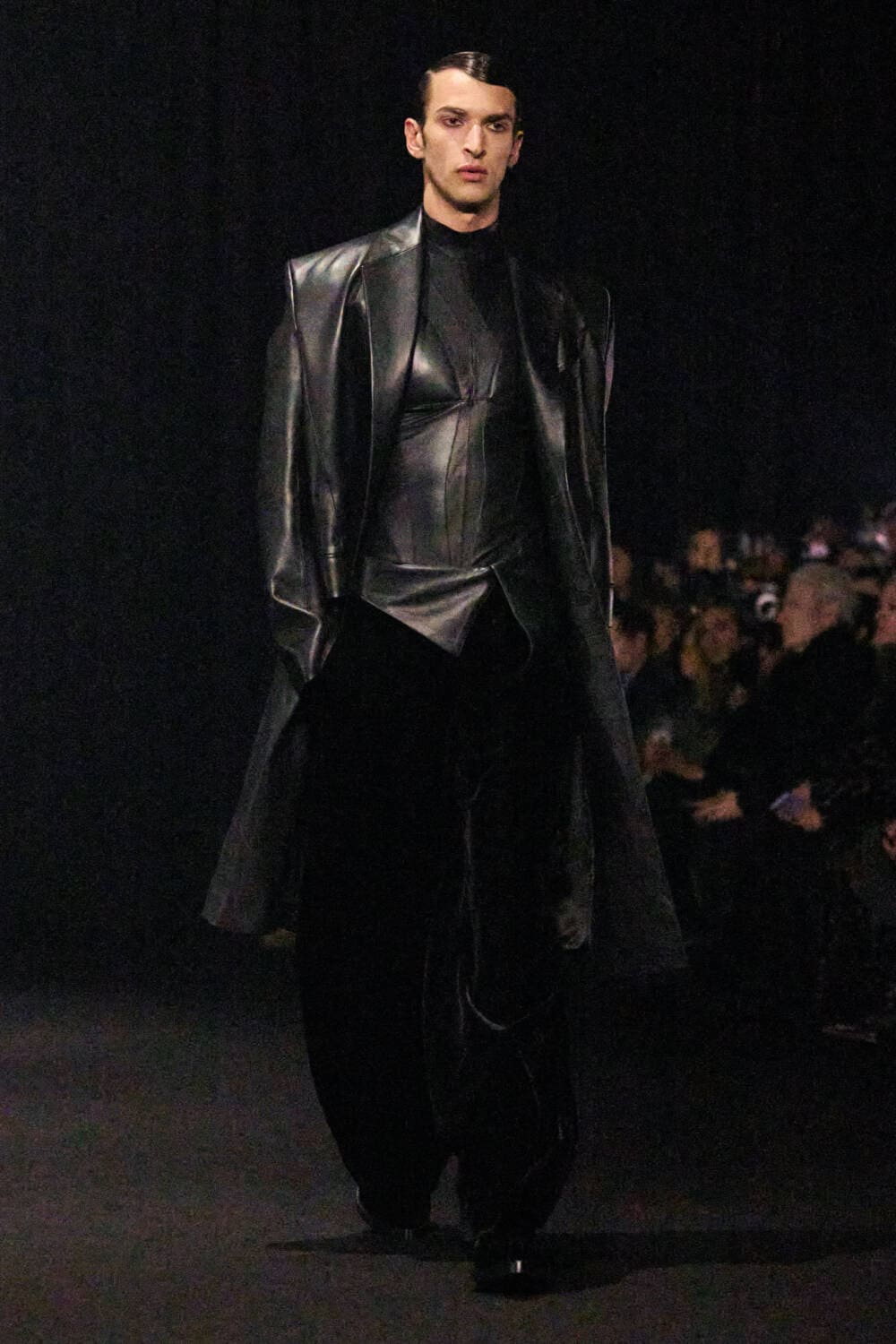 He played a deft game of conceal and reveal, with deep V-necklines for men and women and an itsy-bitsy bustier that only covered to top of the breast. Tailoring was teutonic – wide shouldered coats and jackets were worn with padded leather breast plates. Winged hip contours and wired necklines made the clothes look as though they could take flight. These sizzling silhouettes are ready to soar.
