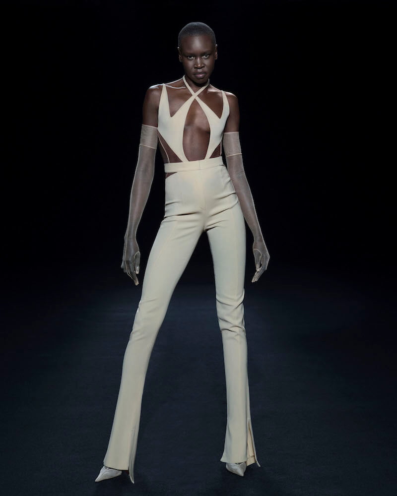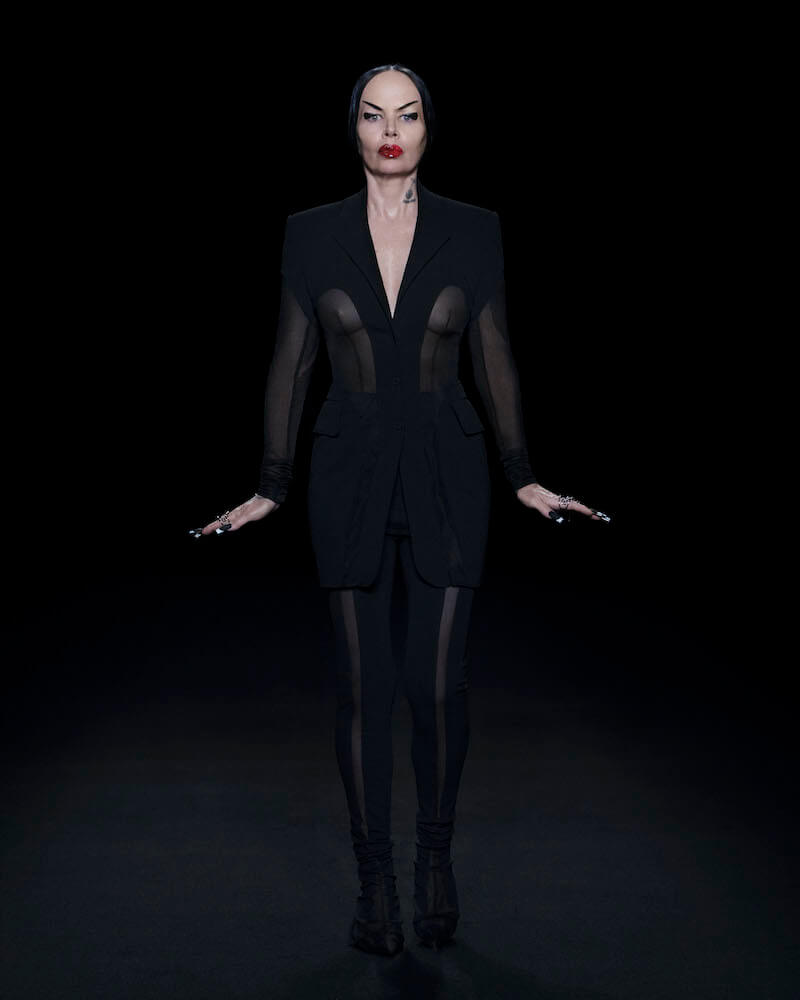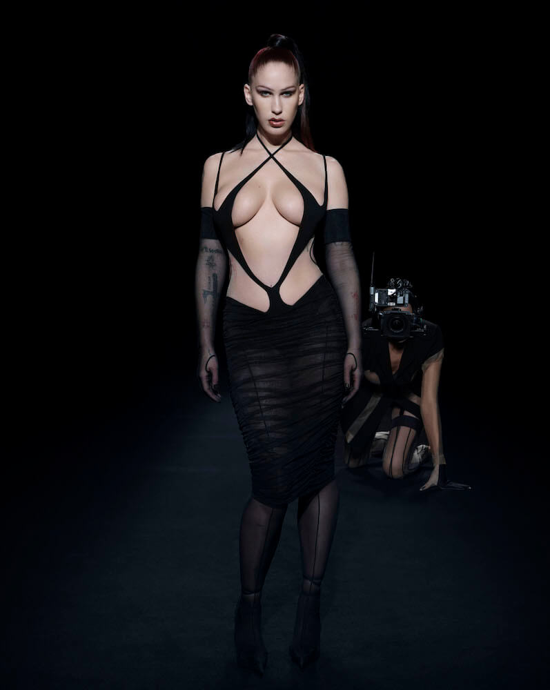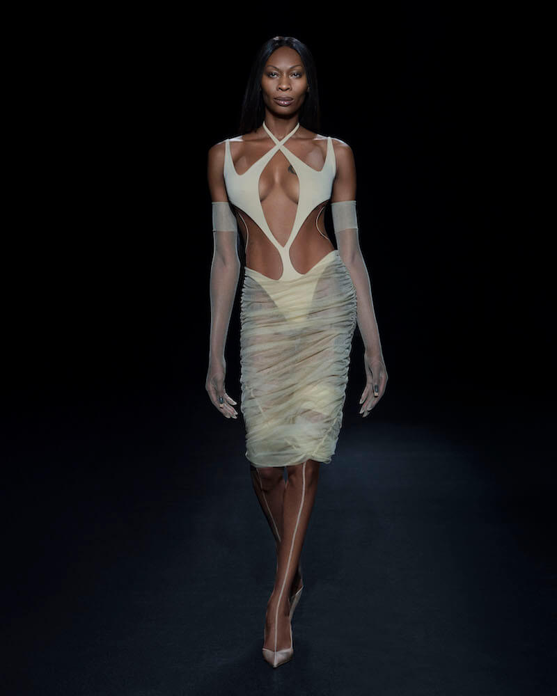 Cadwallader was inspired by comic book heroines and his models looked like Marvel heroines in his transparent and cutaway, second-skin pieces, designed to accentuate and exaggerate anatomical curves. It was tight but not trite. Body-con, in this context on these people, isn’t just performative, it’s proactive, empowered, sex-positive and political. It’s also available to buy right now on the Mugler site.